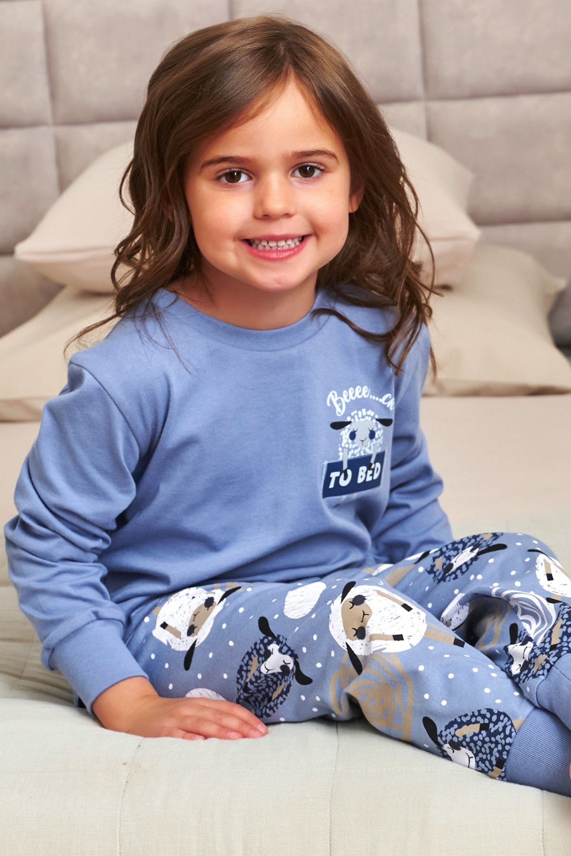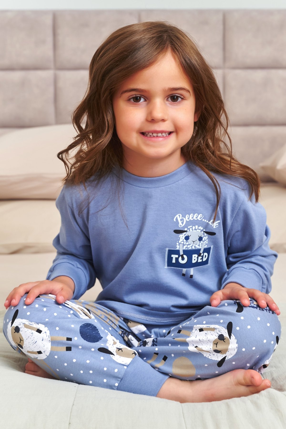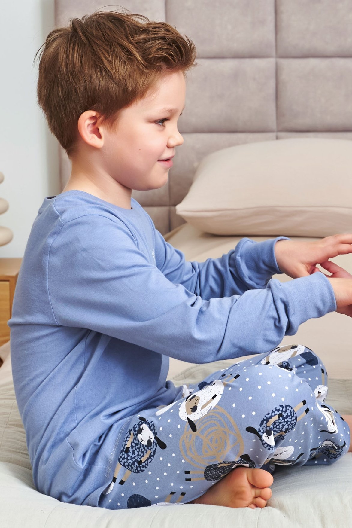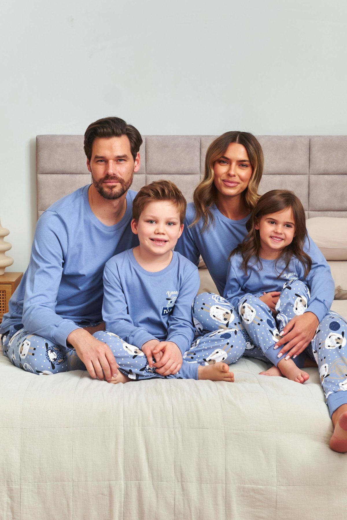 Dětské pyžamo s ovečkami je jako stvořené pro klidné a veselé sny. Je vyrobeno z měkké bavlny, která je šetrná k dětské pokožce. Horní díl v modrém tónu zdobí hravý potisk „Beee…d time“, který rozveselí každý večer. Spodní díl s veselým potiskem oveček dodává pyžamu hravý charakter, díky kterému se i večerní usínání promění v radostný rituál. Elastické manžety na rukávech a nohavicích brání vyhrnování a zaručují, že pyžamo vždy perfektně sedí. Tento model je ideální volbou pro každé dítě, které miluje pohodlí, měkké materiály a veselý design.