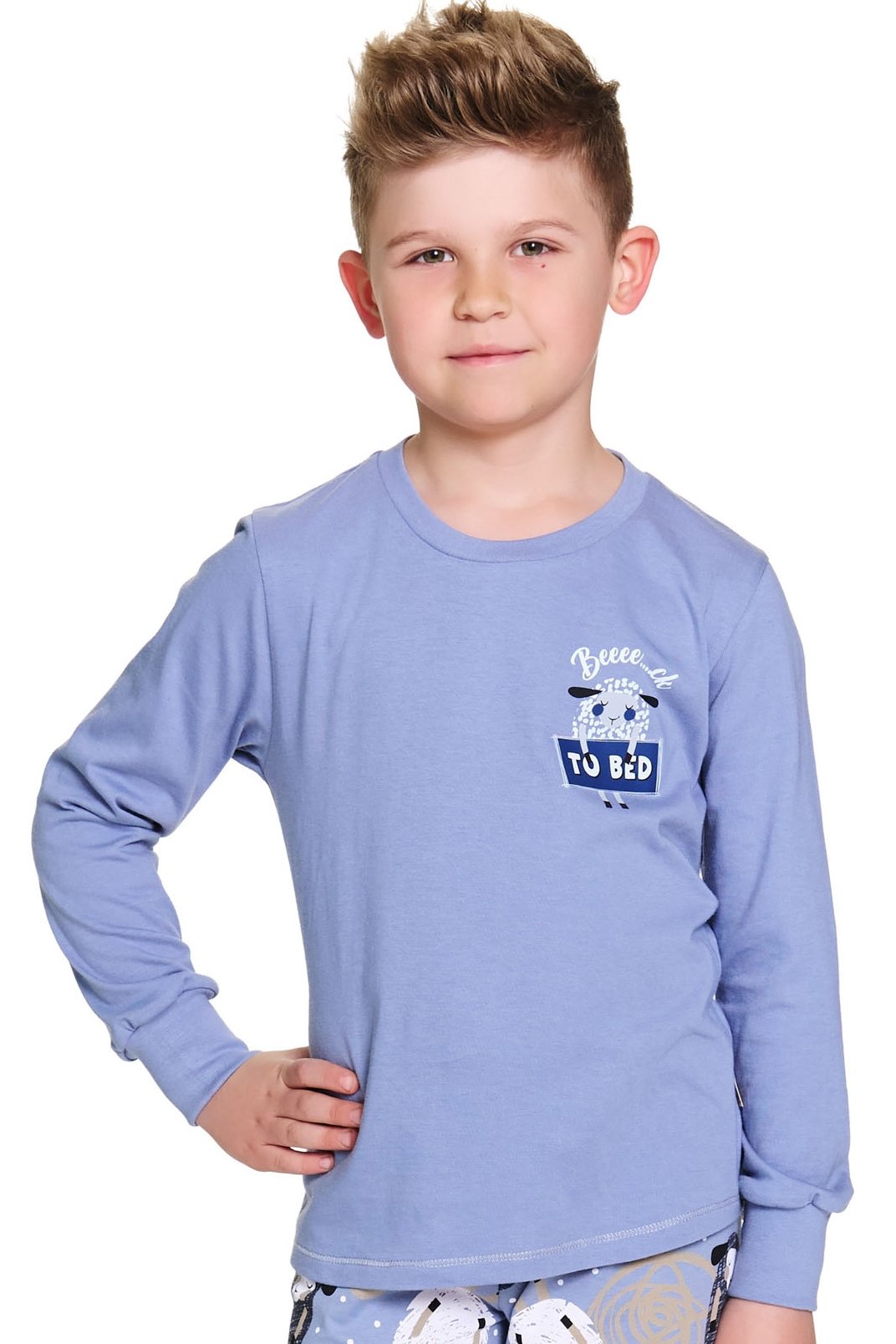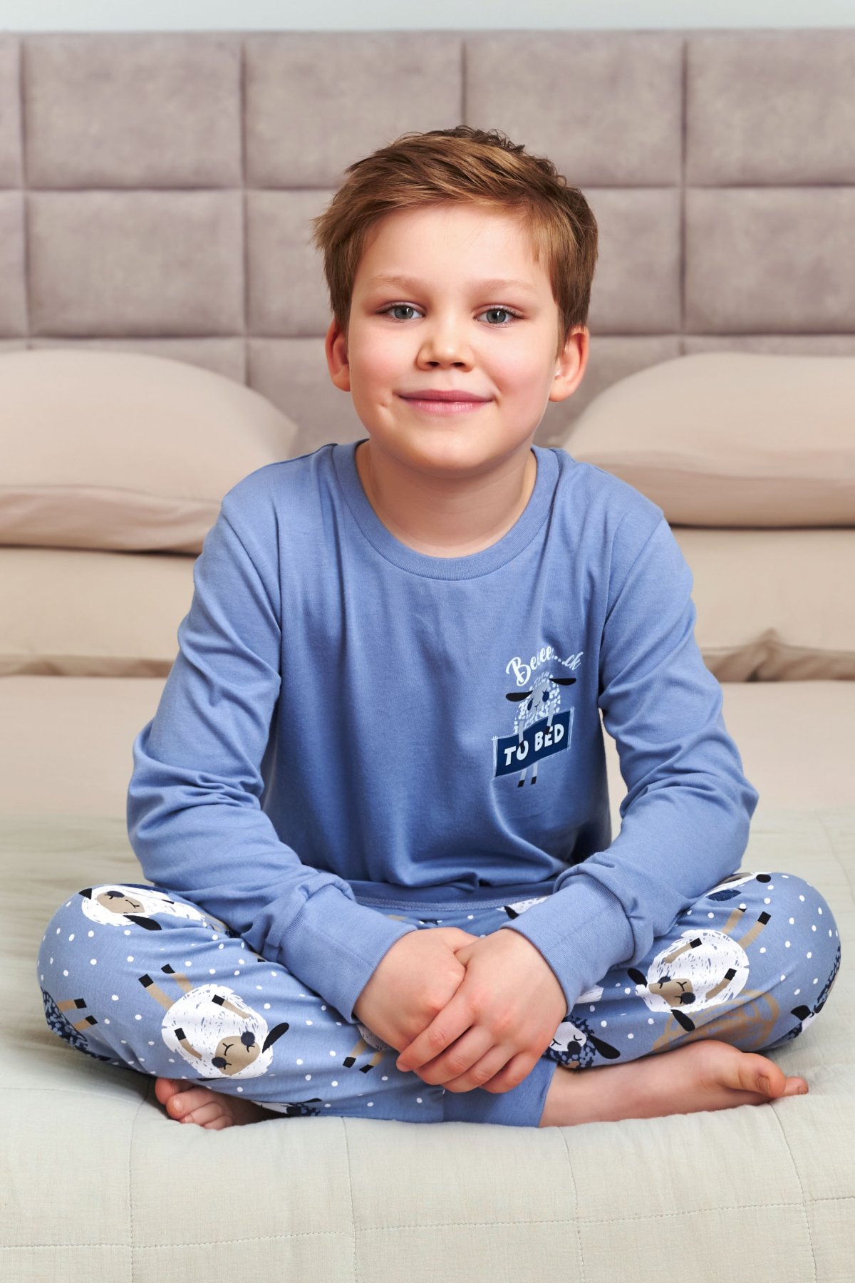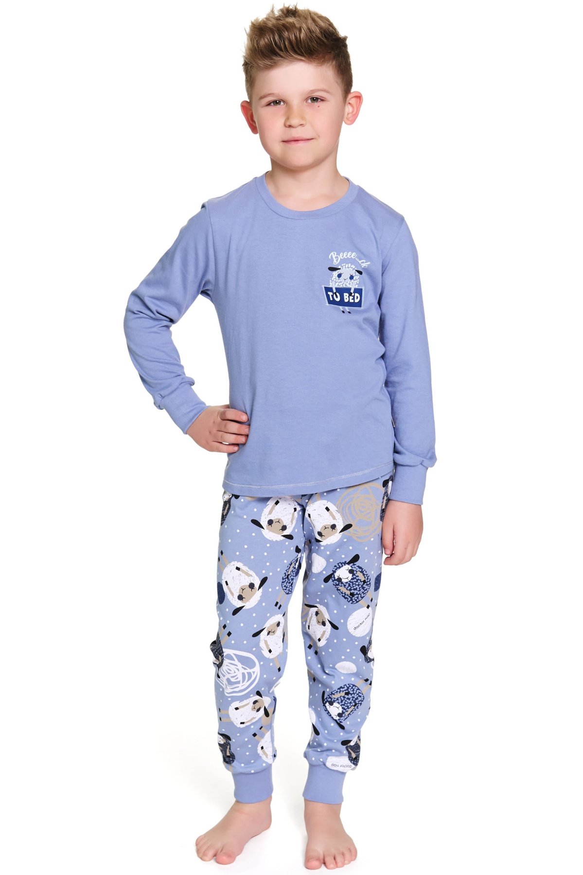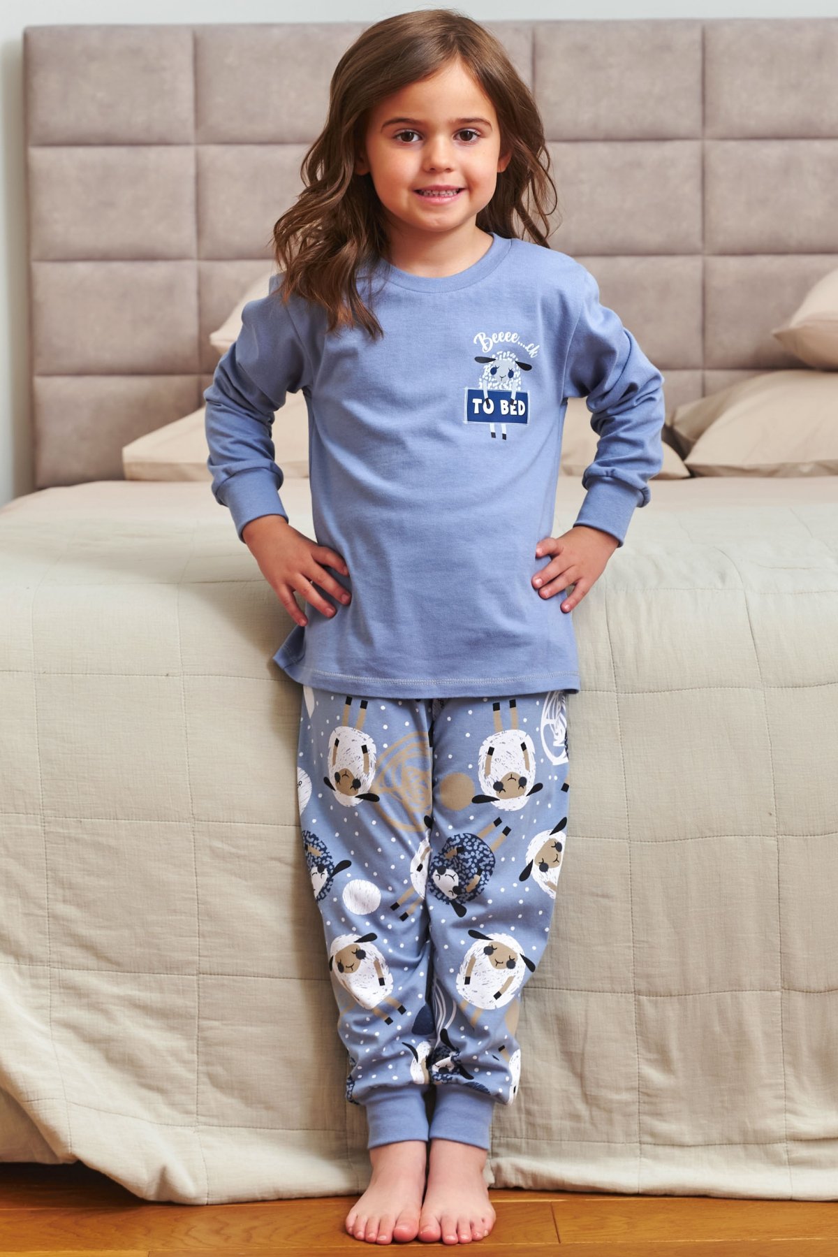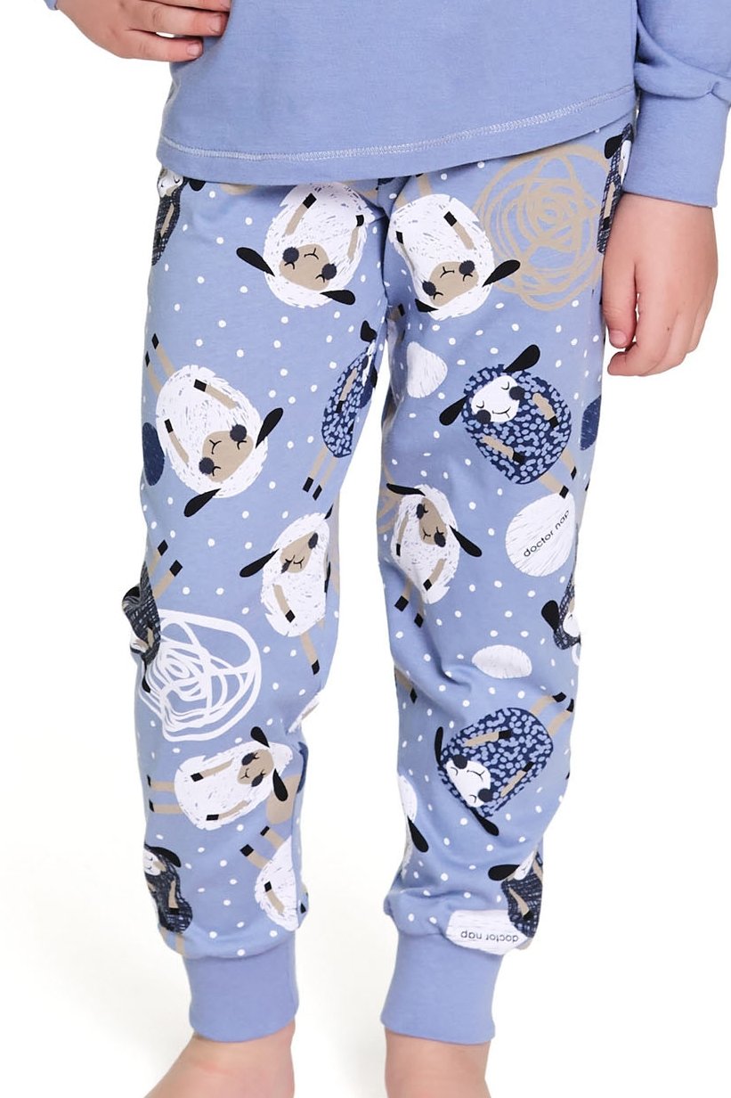 Dětské pyžamo s ovečkami je jako stvořené pro klidné a veselé sny. Je vyrobeno z měkké bavlny, která je šetrná k dětské pokožce. Horní díl v modrém tónu zdobí hravý potisk „Beee…d time“, který rozveselí každý večer. Spodní díl s veselým potiskem oveček dodává pyžamu hravý charakter, díky kterému se i večerní usínání promění v radostný rituál. Elastické manžety na rukávech a nohavicích brání vyhrnování a zaručují, že pyžamo vždy perfektně sedí. Tento model je ideální volbou pro každé dítě, které miluje pohodlí, měkké materiály a veselý design.