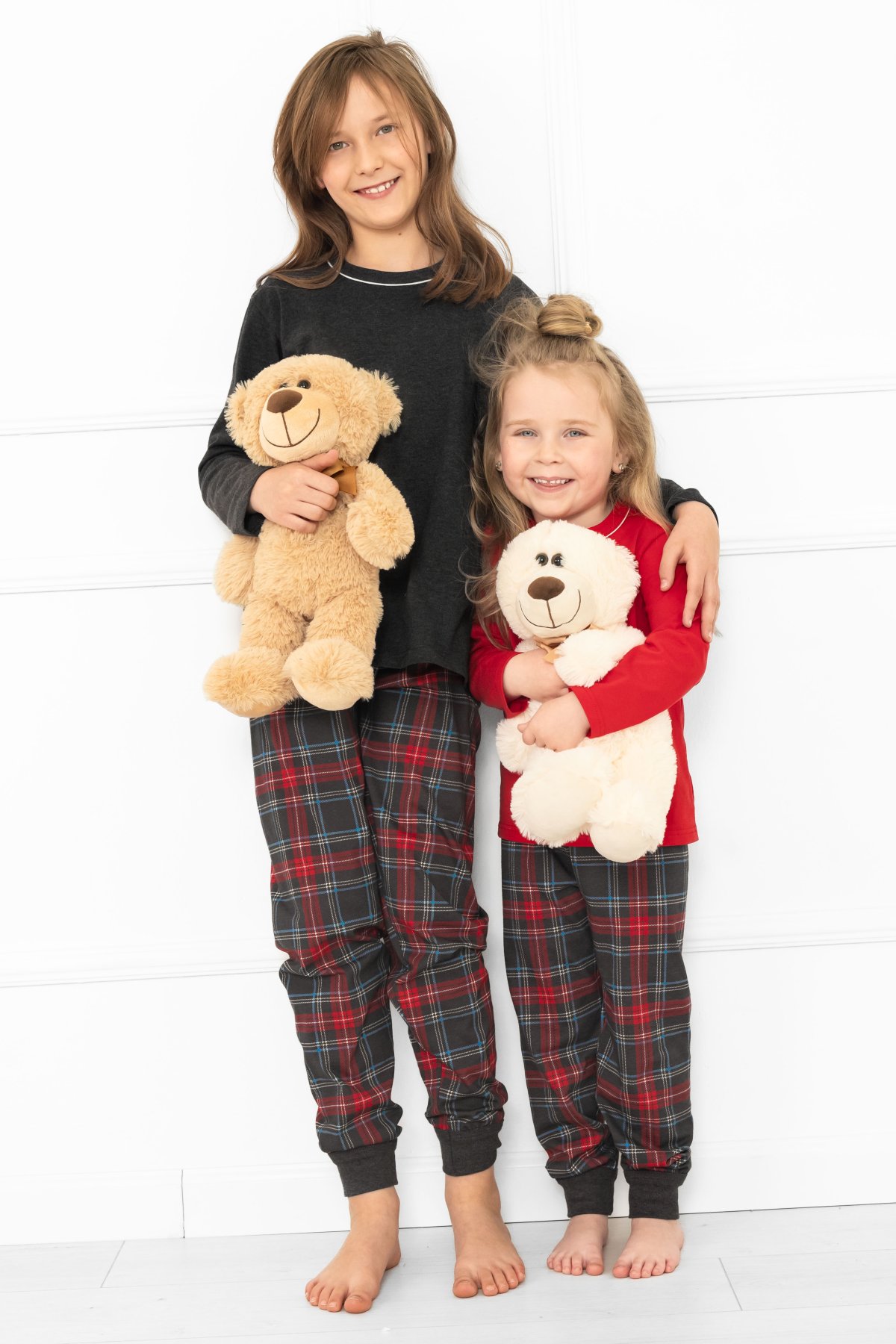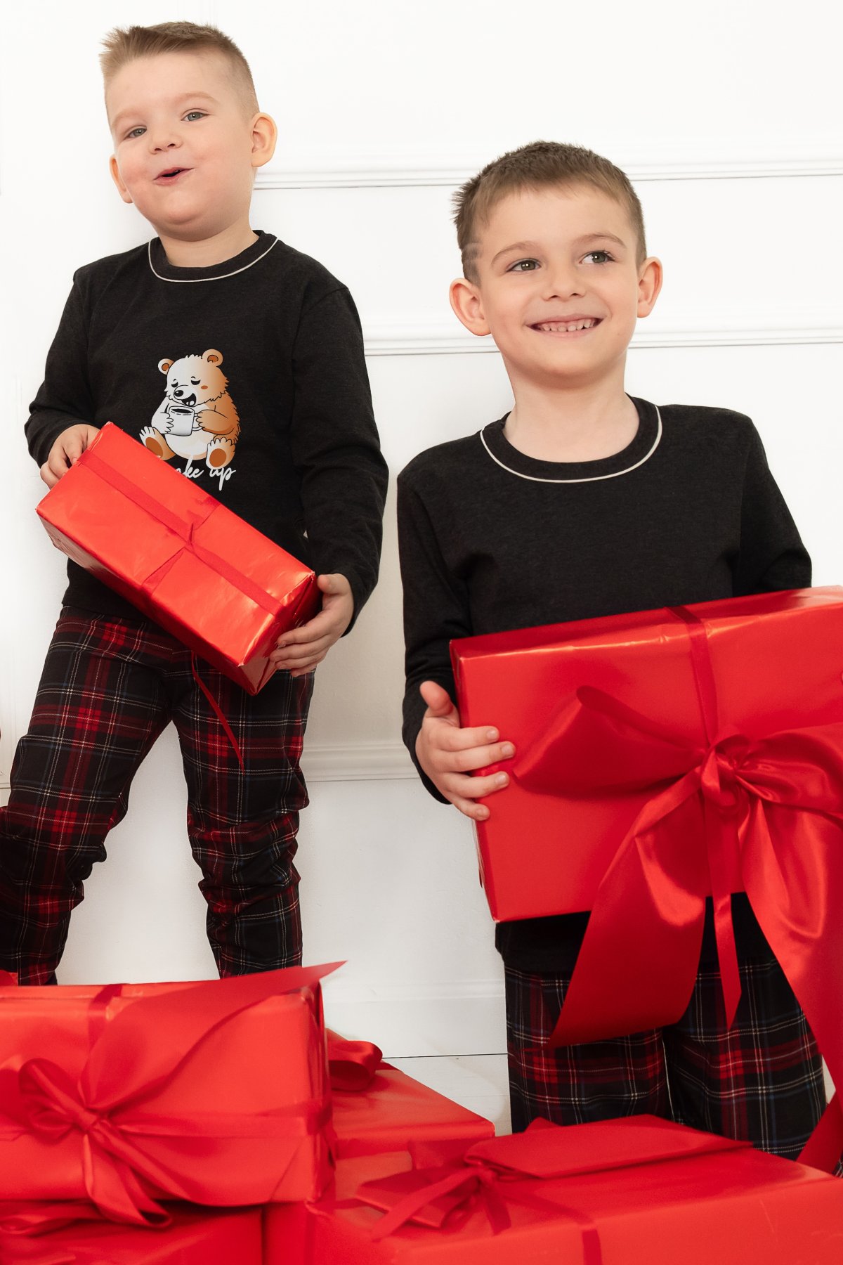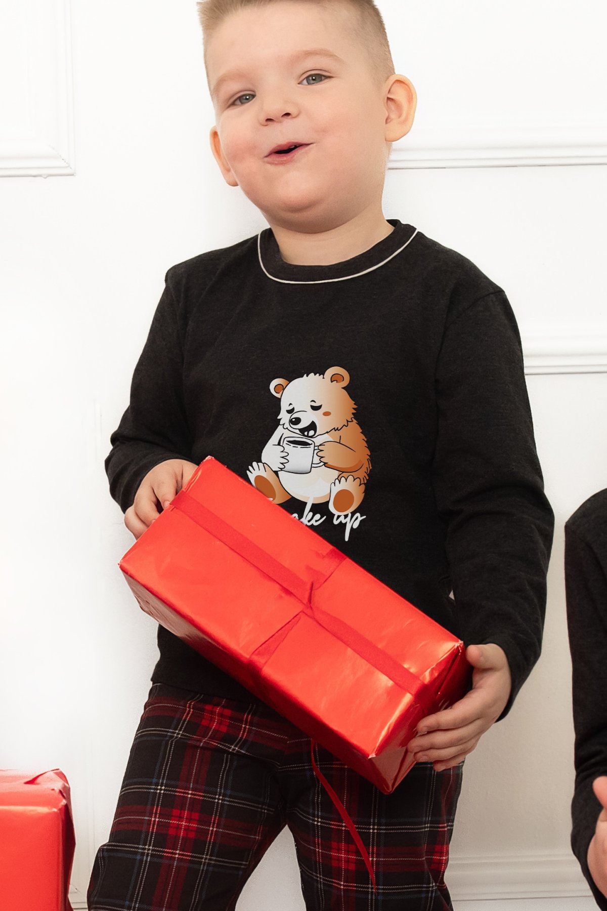 Sváteční dětské pyžamo Rusoli s medvídkem rozzáří každý večer i ranní probouzení. Hladké tričko s dlouhým rukávem zdobí roztomilý motiv medvídka, který dodává pyžamu hravý a hřejivý charakter. Kostkované kalhoty s elastickým pasem a manžetami zajišťují maximální pohodlí a volnost pohybu během spánku i her. Pyžamo je ušité z měkké, prodyšné bavlny, která je šetrná k dětské pokožce a vhodná i pro citlivé děti. Ideální volba na zimní večery, vánoční svátky i jako sladěný outfit pro celou rodinu.