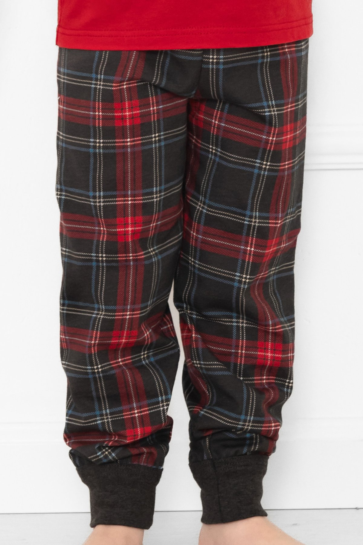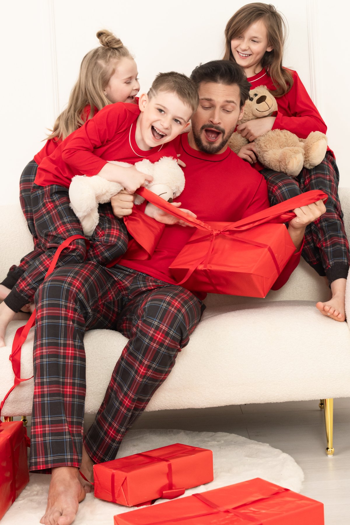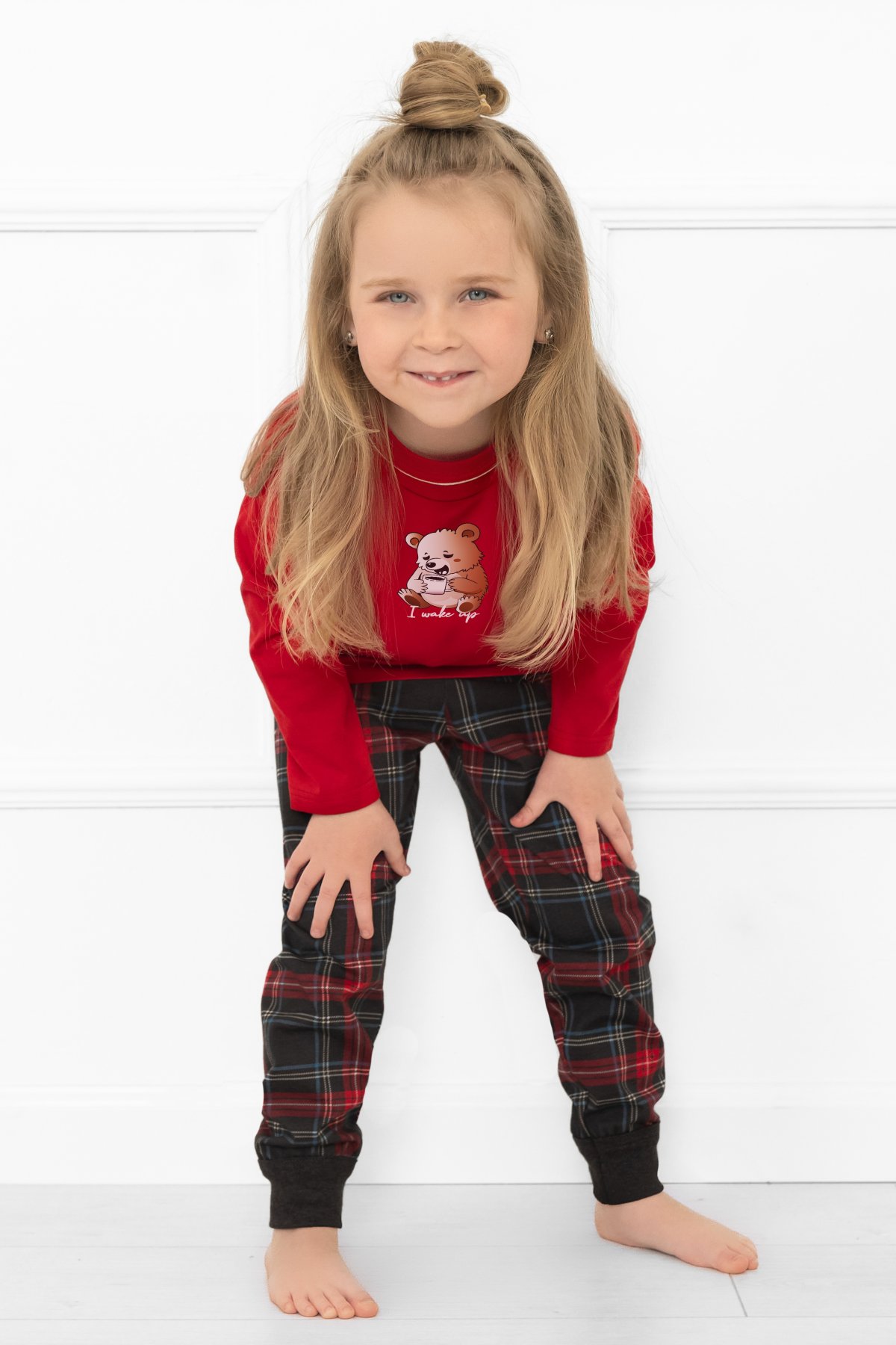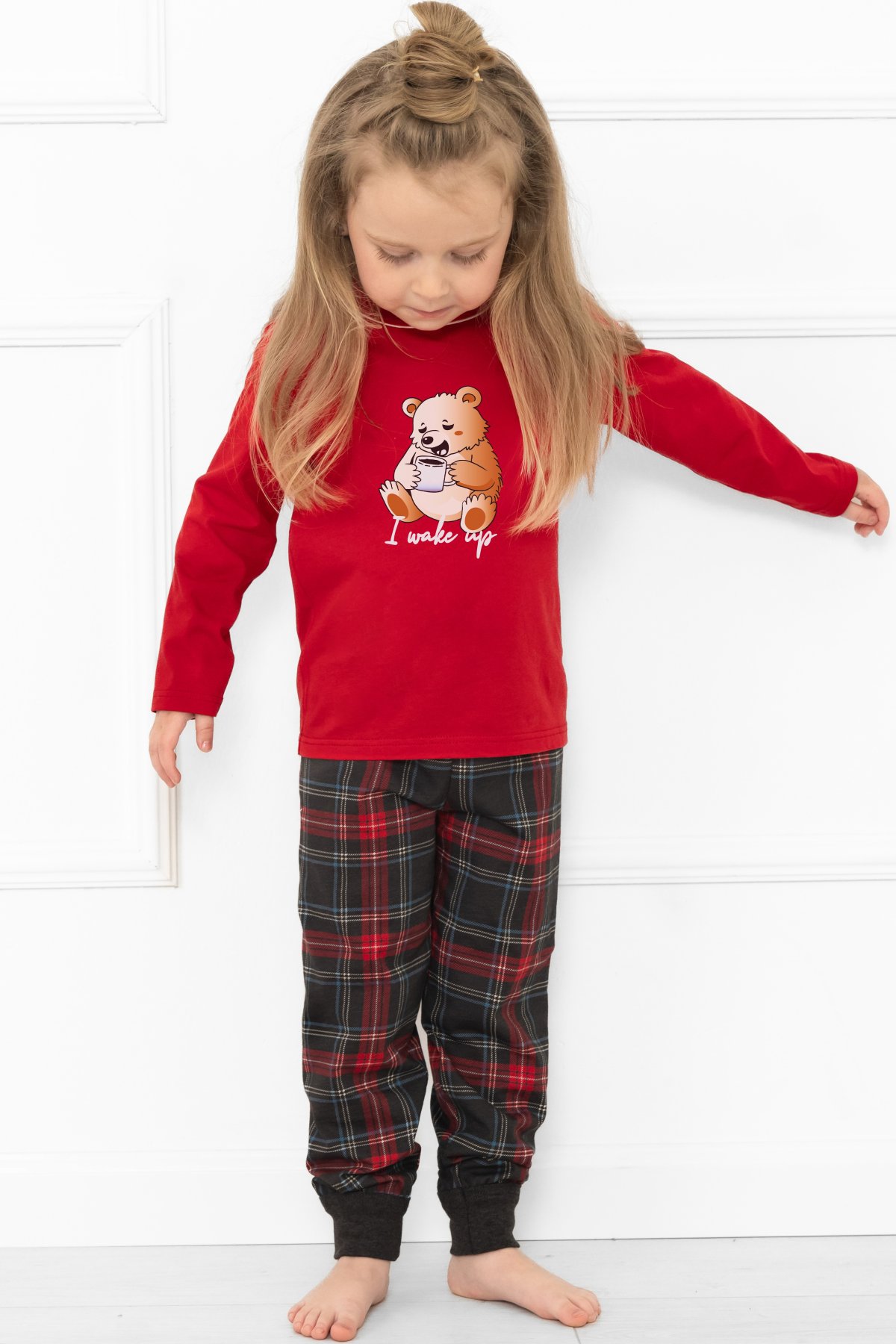 Sváteční dětské pyžamo Rusoli s medvídkem rozzáří každý večer i ranní probouzení. Hladké tričko s dlouhým rukávem zdobí roztomilý motiv medvídka, který dodává pyžamu hravý a hřejivý charakter. Kostkované kalhoty s elastickým pasem a manžetami zajišťují maximální pohodlí a volnost pohybu během spánku i her. Pyžamo je ušité z měkké, prodyšné bavlny, která je šetrná k dětské pokožce a vhodná i pro citlivé děti. Ideální volba na zimní večery, vánoční svátky i jako sladěný outfit pro celou rodinu.