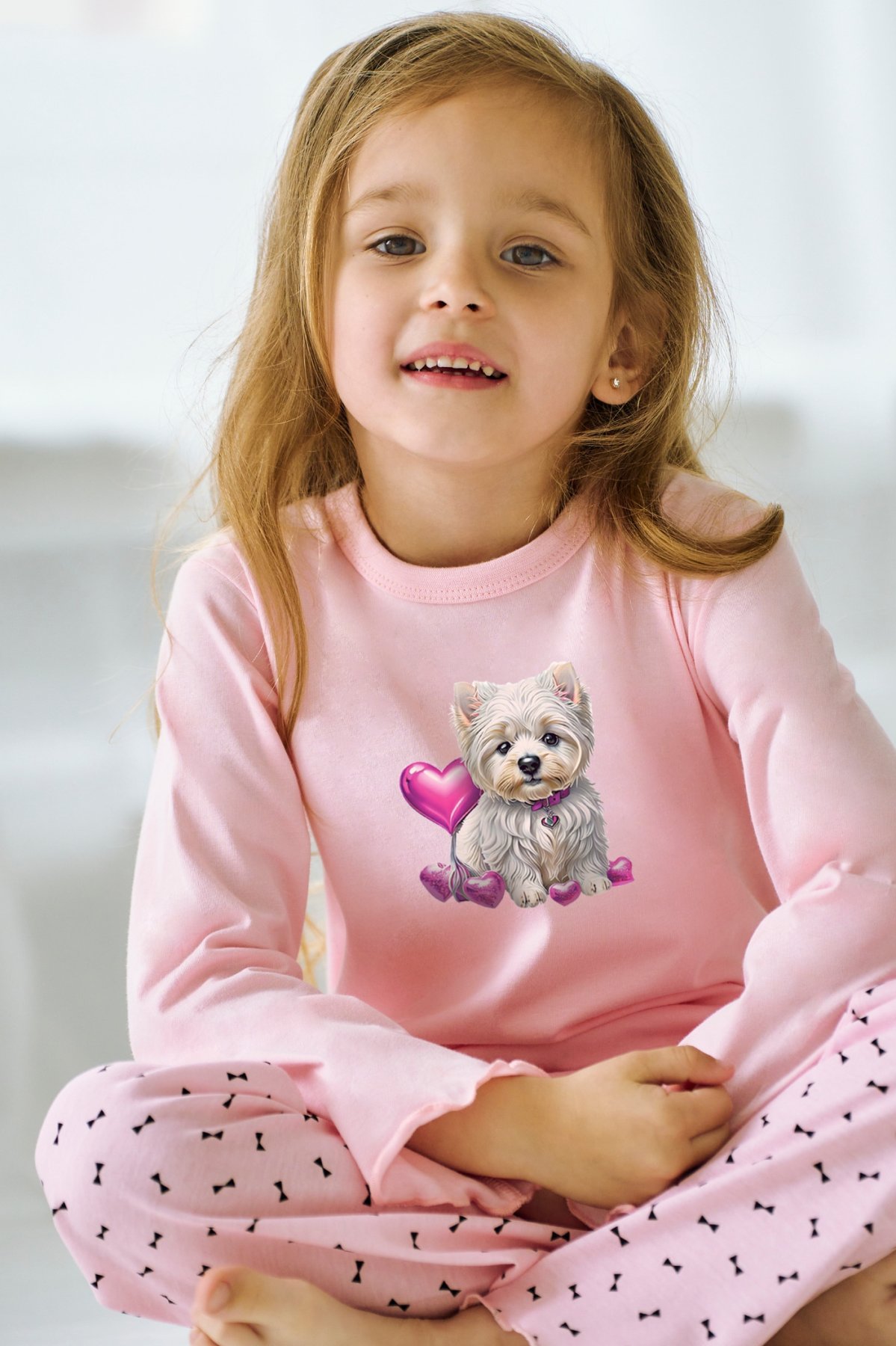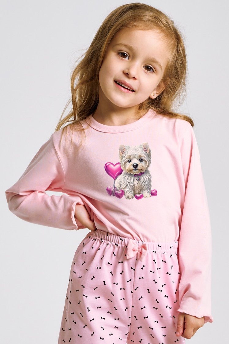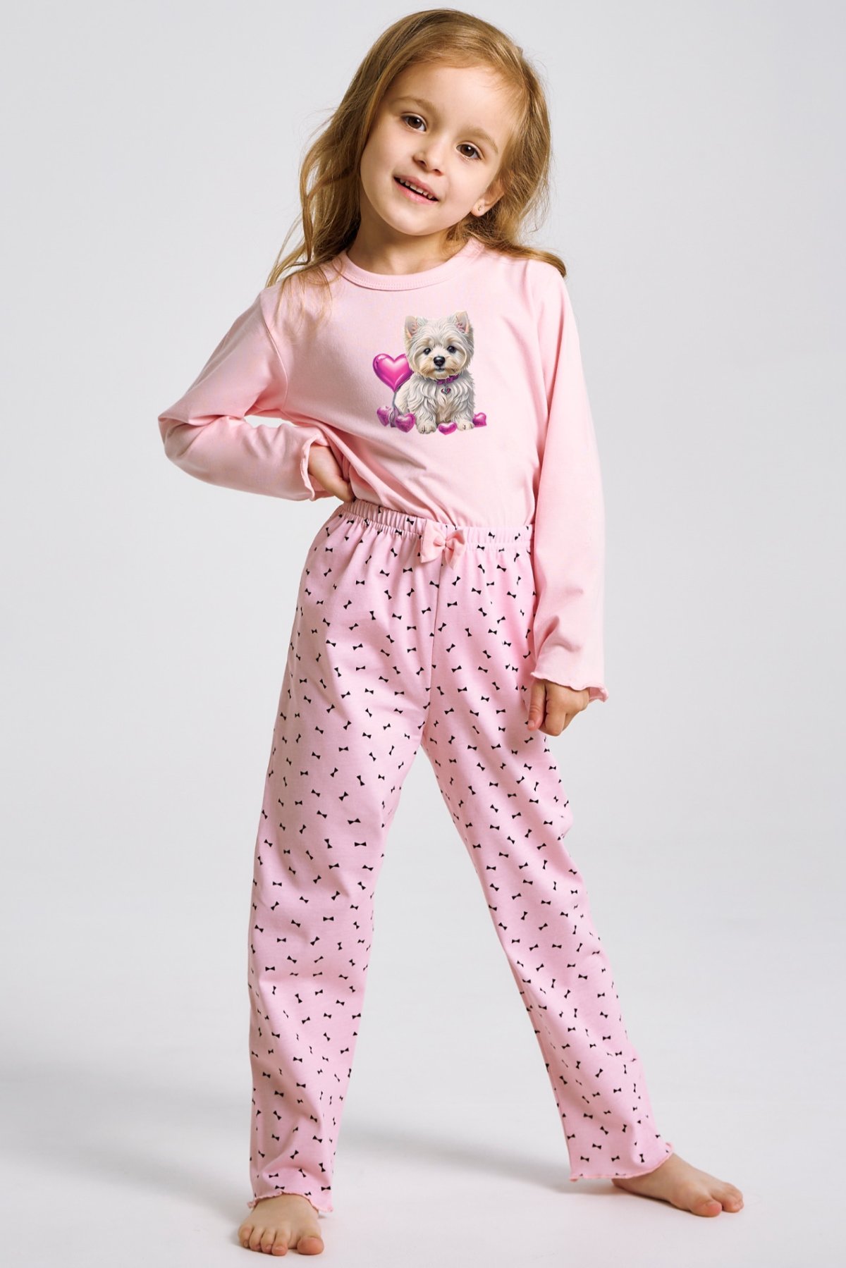 Dívčí dvoudílné pyžamo Clara okouzlí svou jemností a dívčím půvabem. Vyrobené z měkké bavlny poskytující pohodlí během spánku i domácí pohody. Triko s dlouhým rukávem zdobí roztomilý barevný potisk, který potěší všechny malé nositelky. K tomu ladí dlouhé jednobarevné kalhoty s pružným pasem a ozdobnou mašličkou. Díky volnému střihu a přírodnímu materiálu je model ideální pro celoroční nošení. Pyžamo Clara je perfektní pro všechny princezny, které milují pohodlí, barvy a hravé vzory.