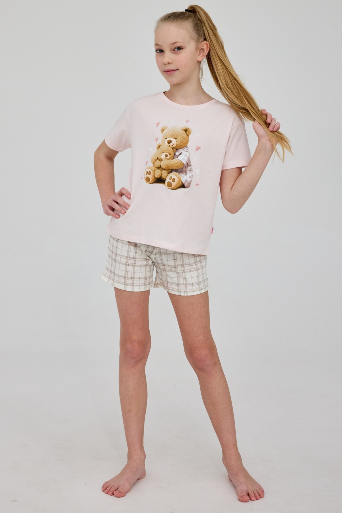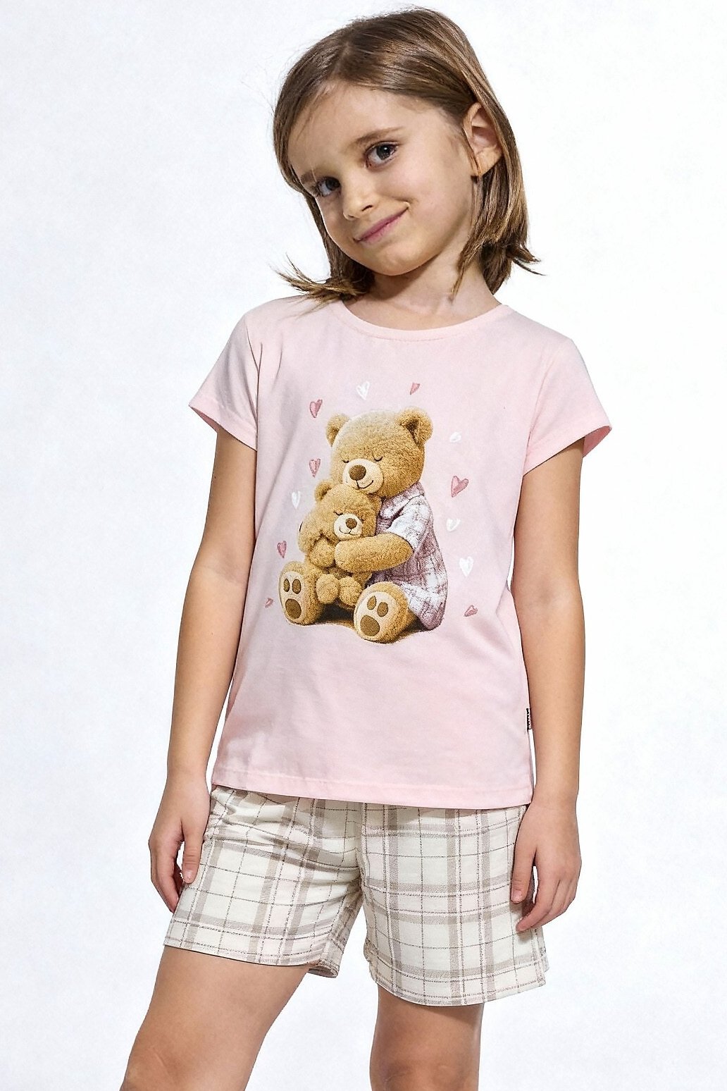 Dívčí pyžamo Hug Me přináší kombinaci pohodlí a roztomilého vzhledu, který potěší každou malou princeznu. Horní díl tvoří lehké tričko s krátkým rukávem a sympatickým potiskem medvídků, který dodává pyžamu veselý, dětský charakter. Kostkované šortky doplňují celý komplet o klasický a hravý vzhled. Pas se šňůrkou umožňuje snadné přizpůsobení obvodu, zatímco praktické kapsy zvyšují komfort při nošení. Díky jemné bavlně je pyžamo Hug Me mimořádně příjemné na dotek a prodyšné – ideální pro každodenní spaní i pohodlné domácí večery.