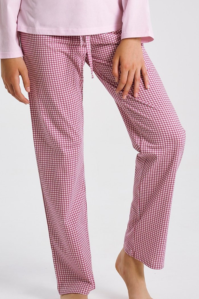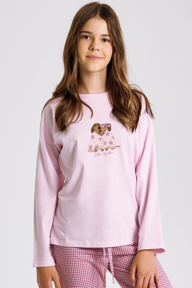 Horní díl s dlouhým rukávem zdobí barevný motiv se psy, který dodává pyžamu hravý charakter. Dlouhé kalhoty v oblíbeném kostkovaném vzoru krásně ladí s růžovým tričkem a díky pružné gumě v pase i stahovací šňůrce zaručují perfektní padnutí. Celé pyžamo je ušito ze 100% bavlny, která je příjemná na dotek a ideální pro klidný, pohodlný spánek. Stylový model, ve kterém se spí stejně dobře, jako odpočívá.
