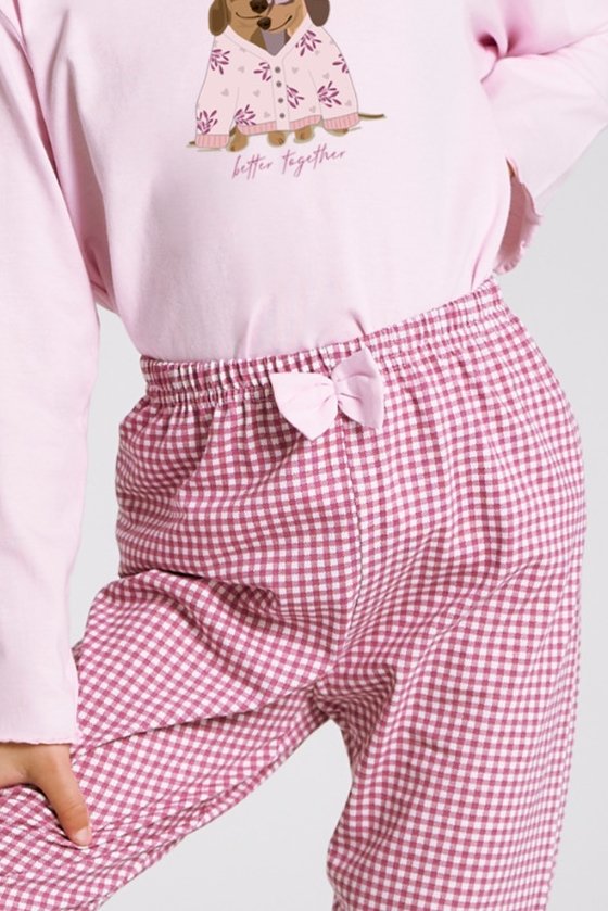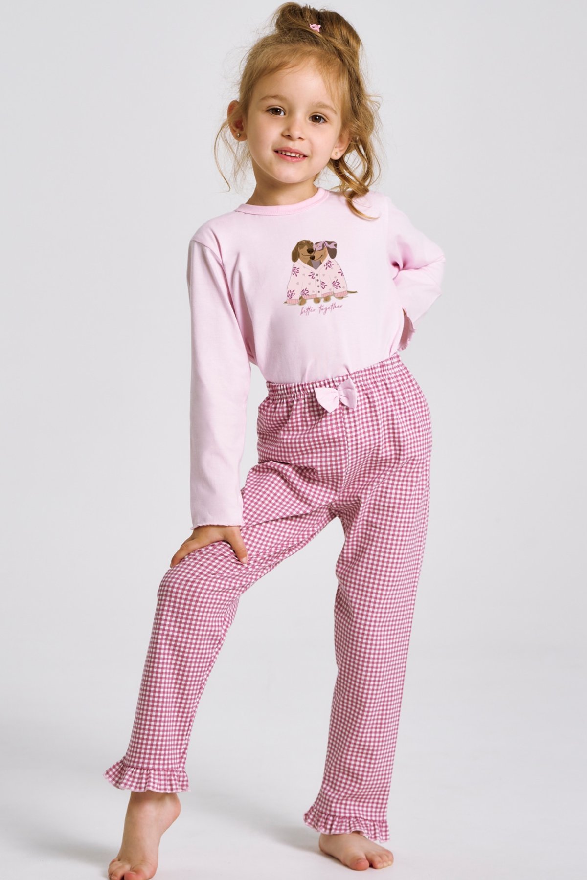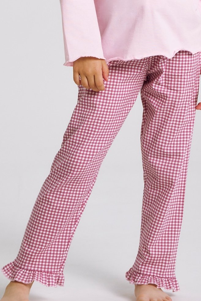 Horní díl s dlouhým rukávem zdobí barevný potisk, který dodává pyžamu hravý vzhled. Dlouhé vzorované kalhoty mají zakončení s volánkem a v pase pružnou gumu s ozdobnou mašličkou.