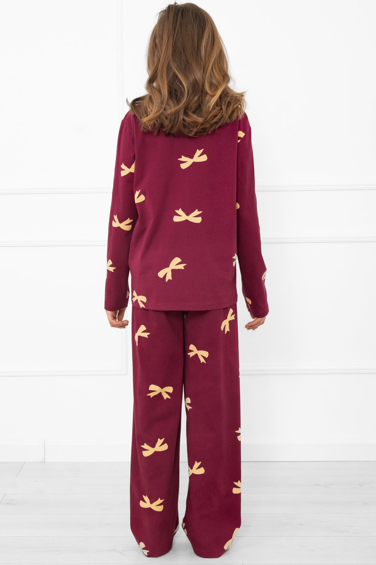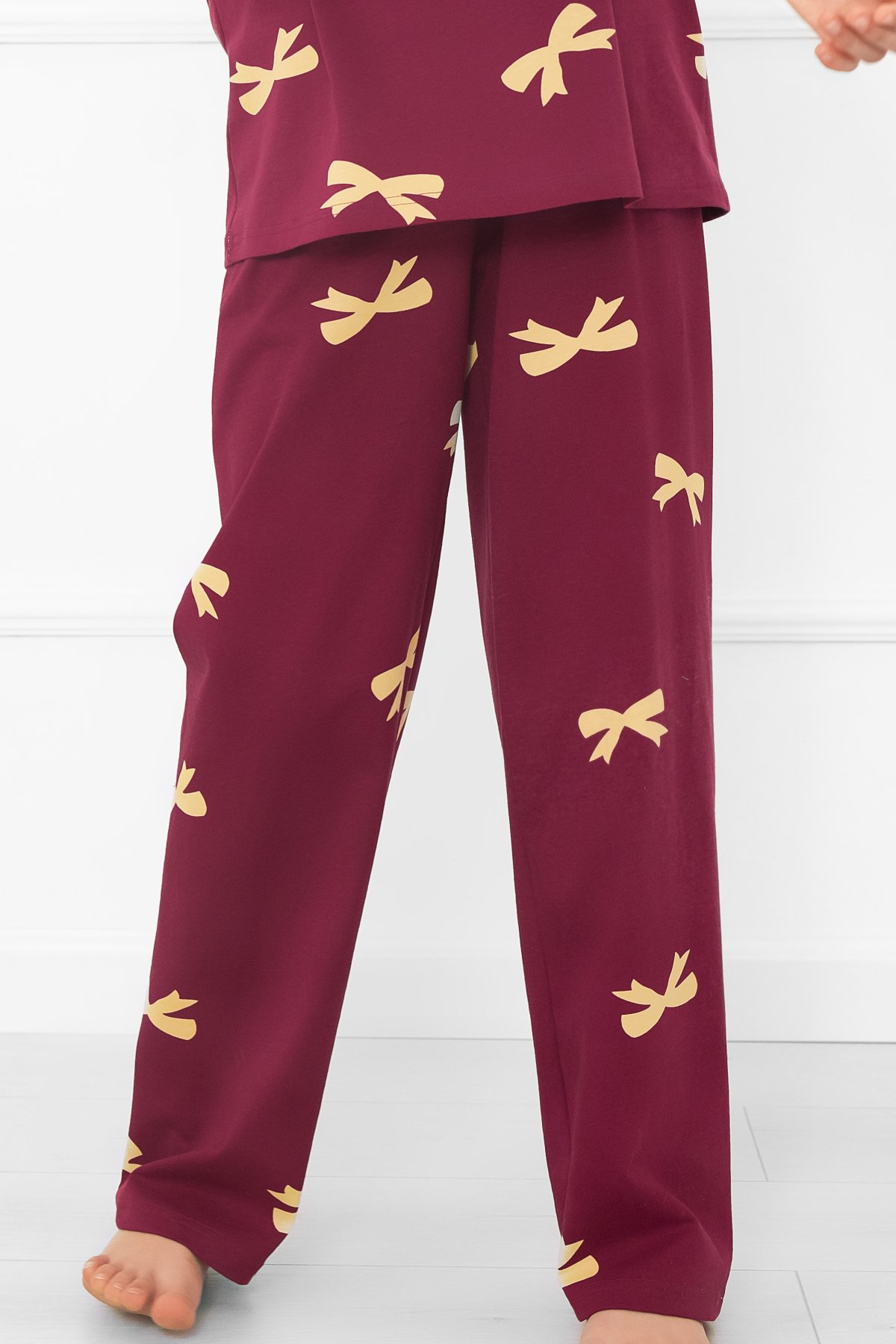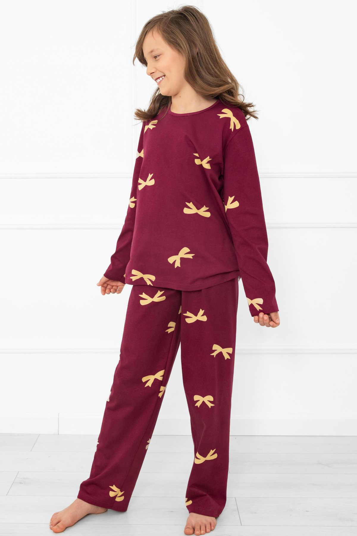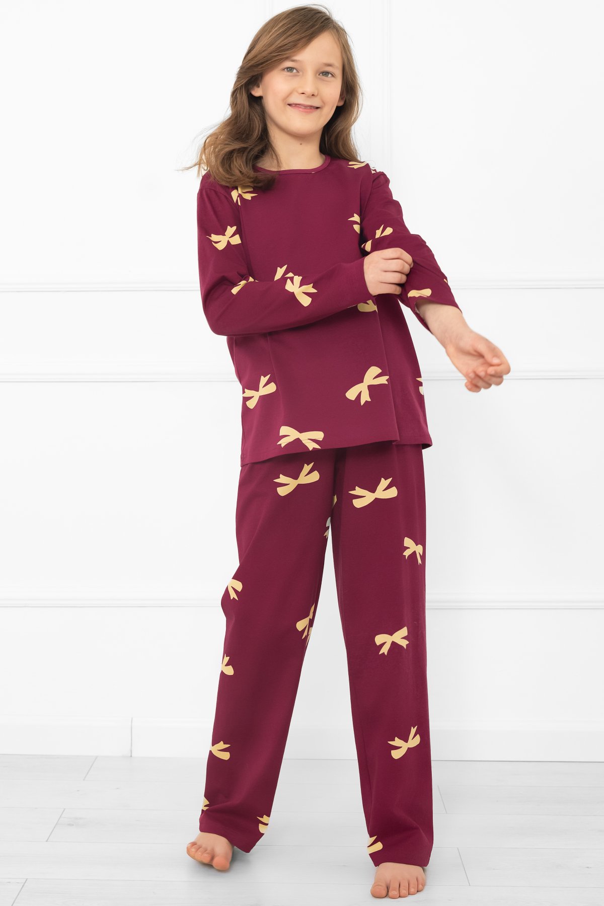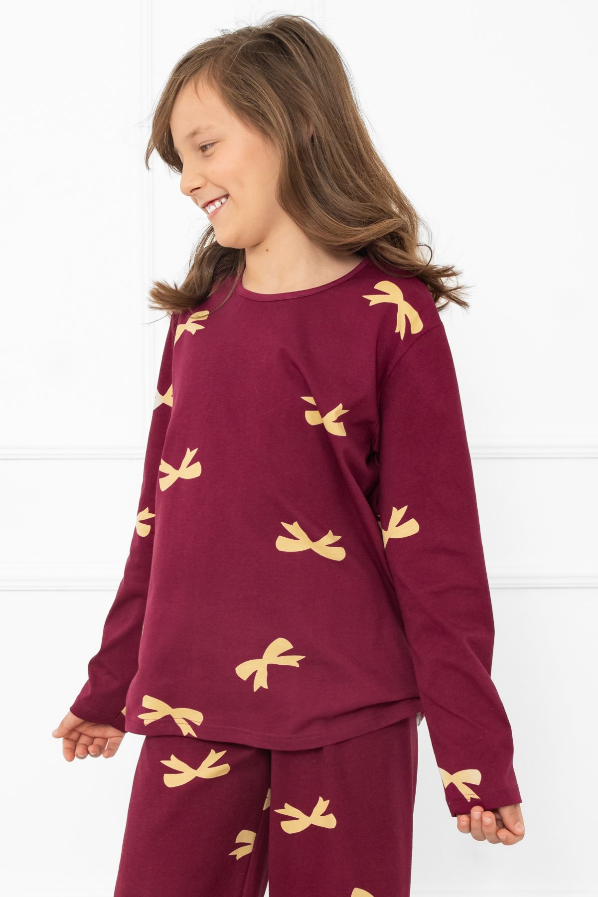 Dívčí pyžamo Kwadro je ideální pro malé parádnice, které chtějí pohodlí i styl. Měkká bavlna zajišťuje komfort a šetrnost k citlivé pokožce, zatímco volnější střih poskytuje maximální svobodu pohybu. Hravý potisk mašliček na vínovém podkladu dodává pyžamu veselý a moderní vzhled, který si děti zamilují. Díky prodyšnému materiálu je pyžamo skvělé na spaní i domácí pohodu.