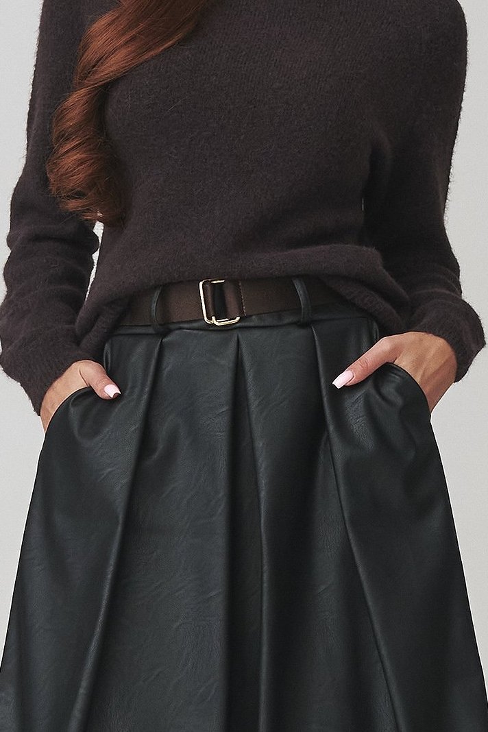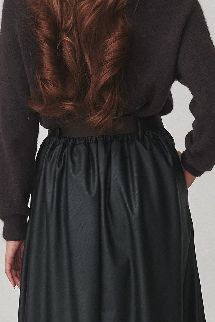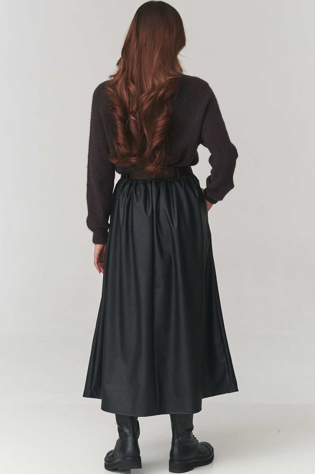 Stylová černá sukně z ekokůže je kouskem, který spojuje eleganci, ženskost a moderní charakter. Rozšířený midi střih se krásně pohybuje při chůzi a lichotí každé postavě. Pásek s ozdobnou přezkou dodává modelu šmrnc a umožňuje přizpůsobit střih v pase.