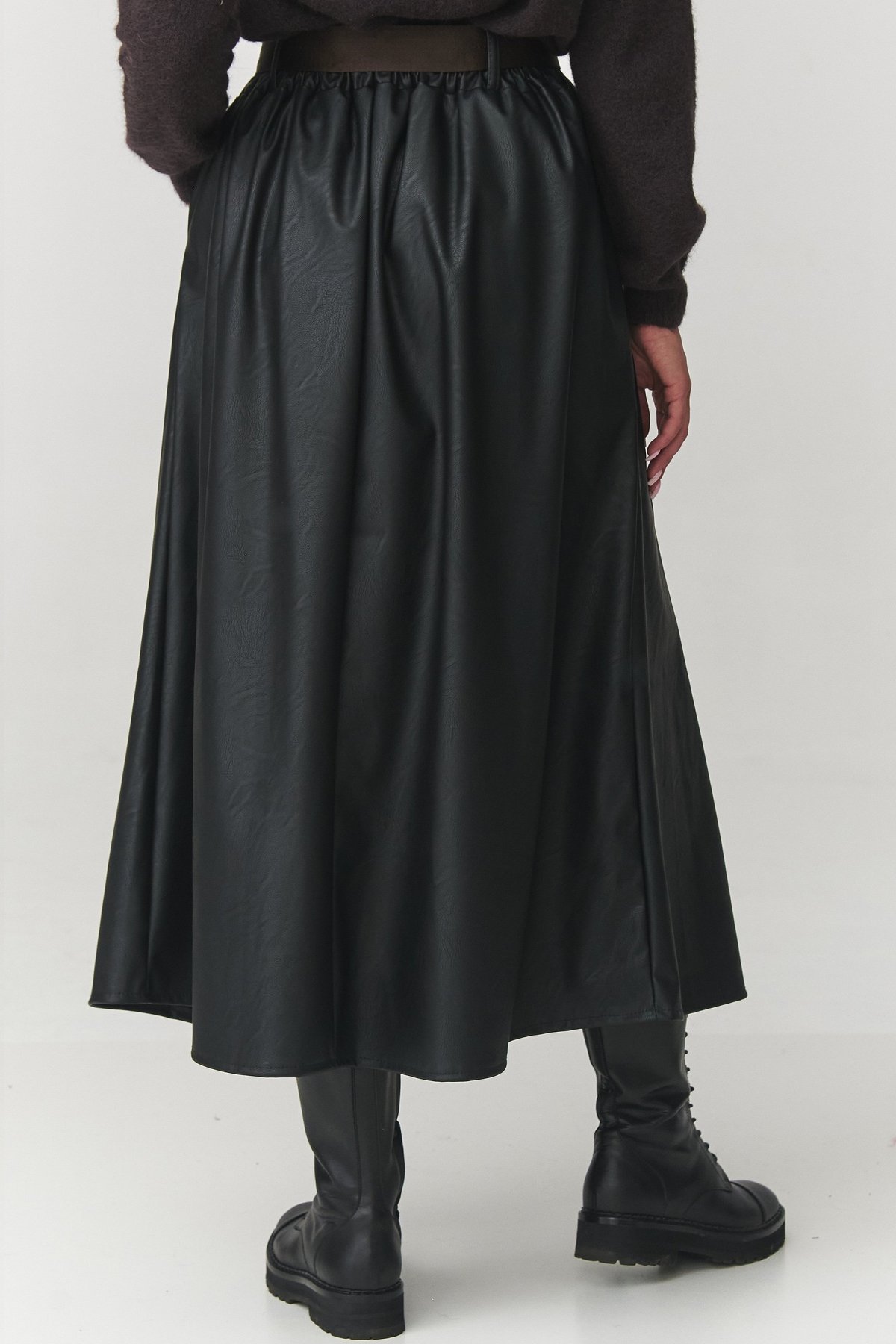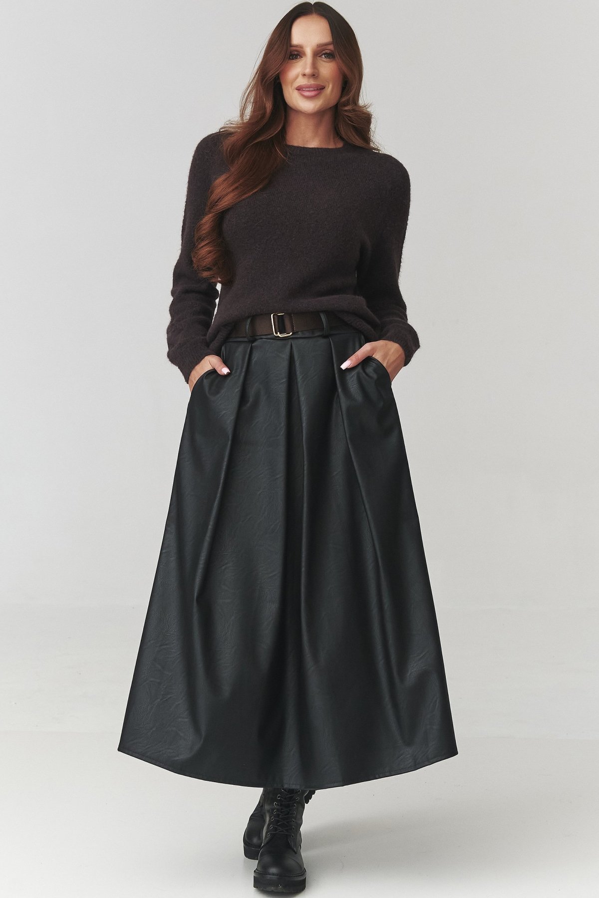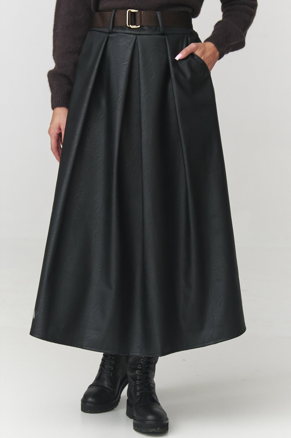 Stylová černá sukně z ekokůže je kouskem, který spojuje eleganci, ženskost a moderní charakter. Rozšířený midi střih se krásně pohybuje při chůzi a lichotí každé postavě. Pásek s ozdobnou přezkou dodává modelu šmrnc a umožňuje přizpůsobit střih v pase.