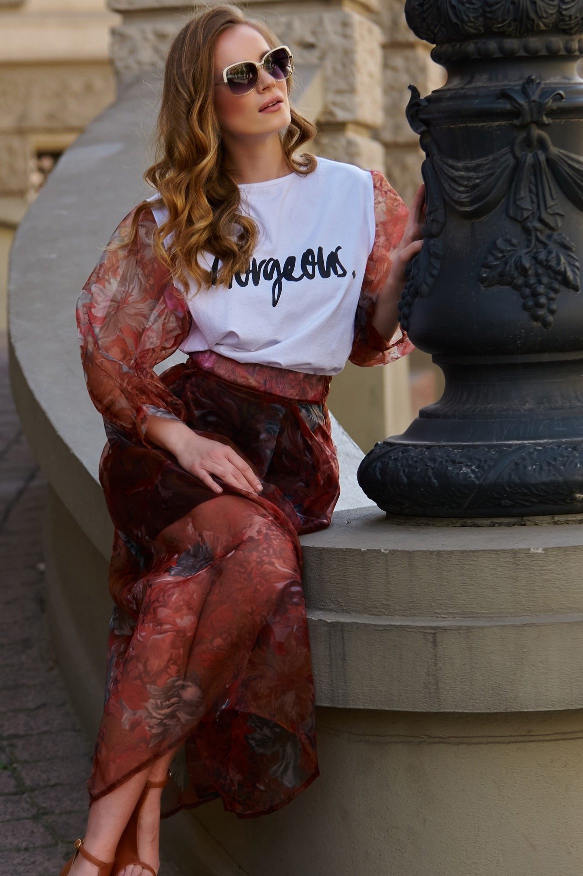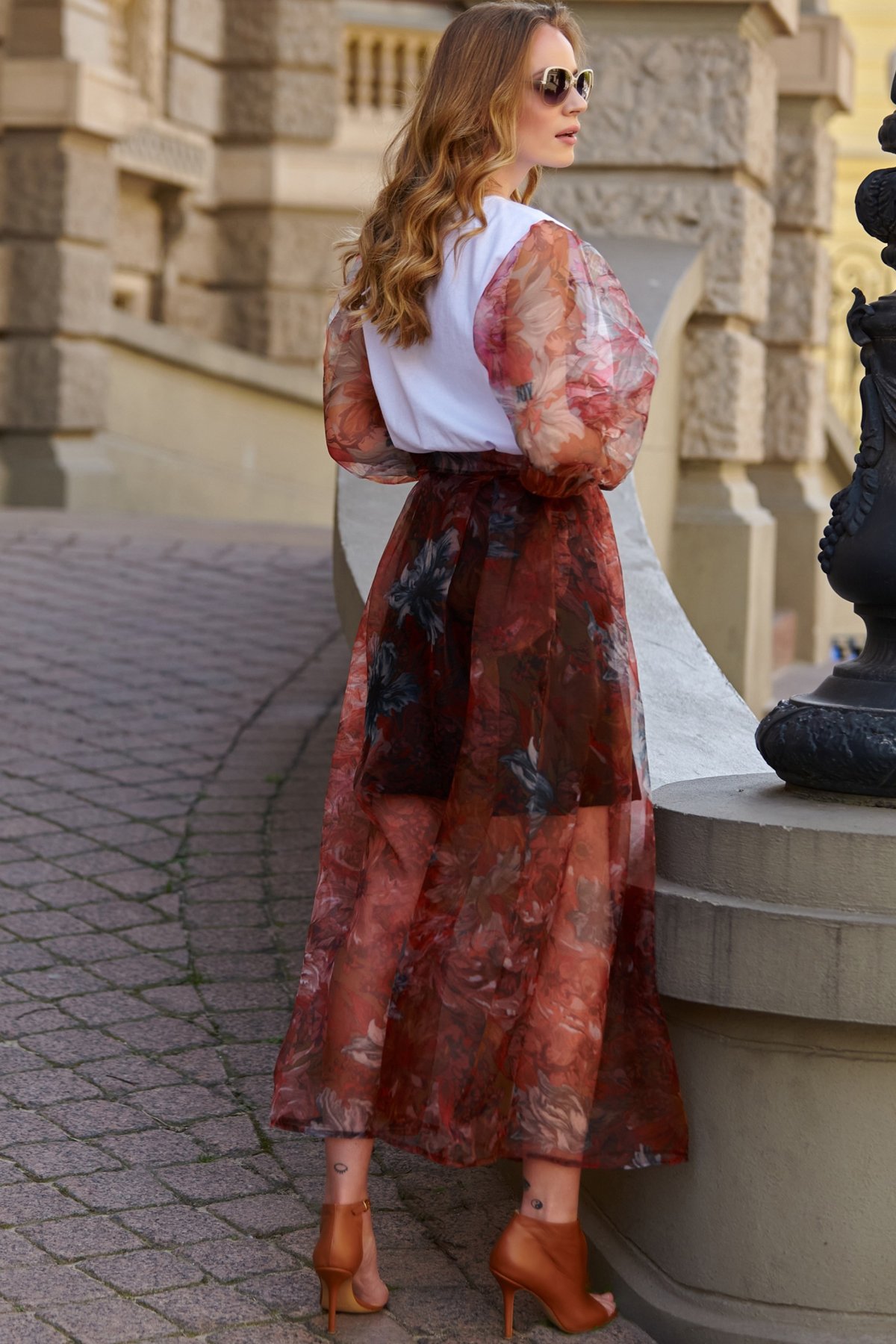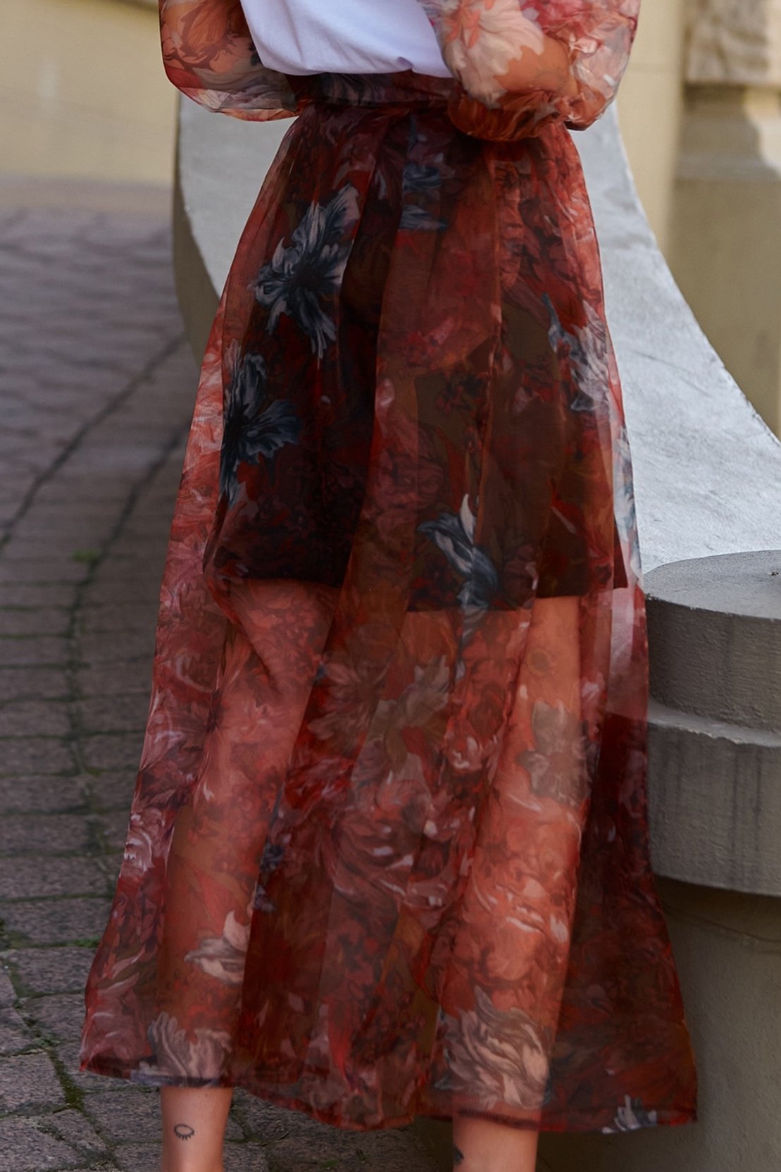 Dlouhá tylová sukně s květinovým potiskem je dokonalým spojením ženskosti, lehkosti a letní volnosti. Průsvitný tyl s jemnými květy vytváří romantický a vzdušný efekt, zatímco kratší viskózová spodnička zaručuje pohodlí i decentní krytí.