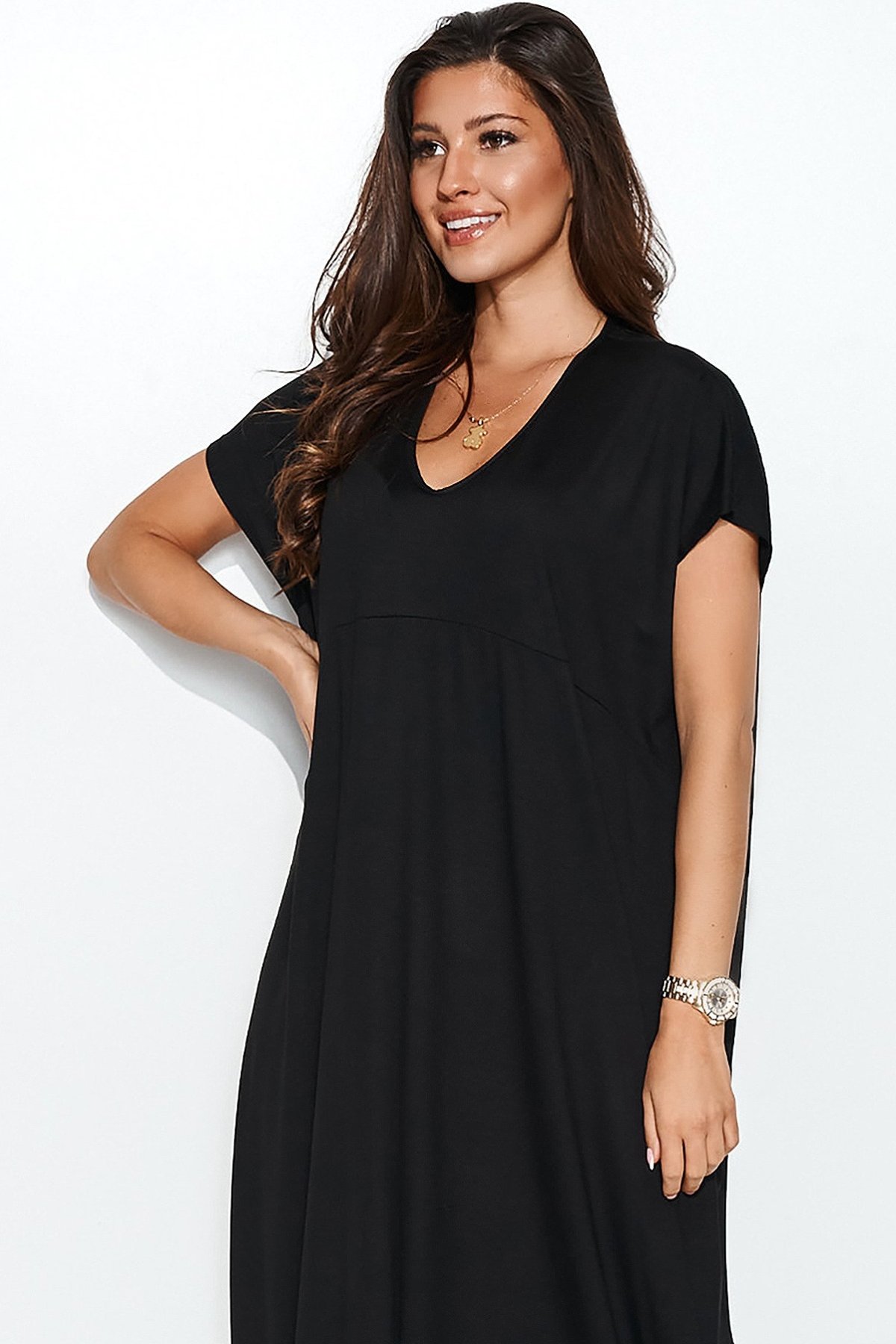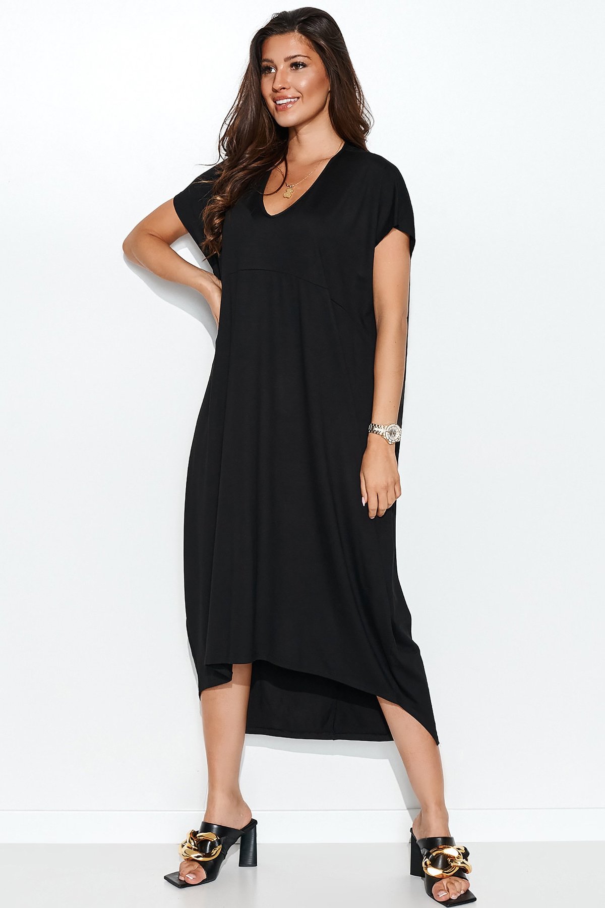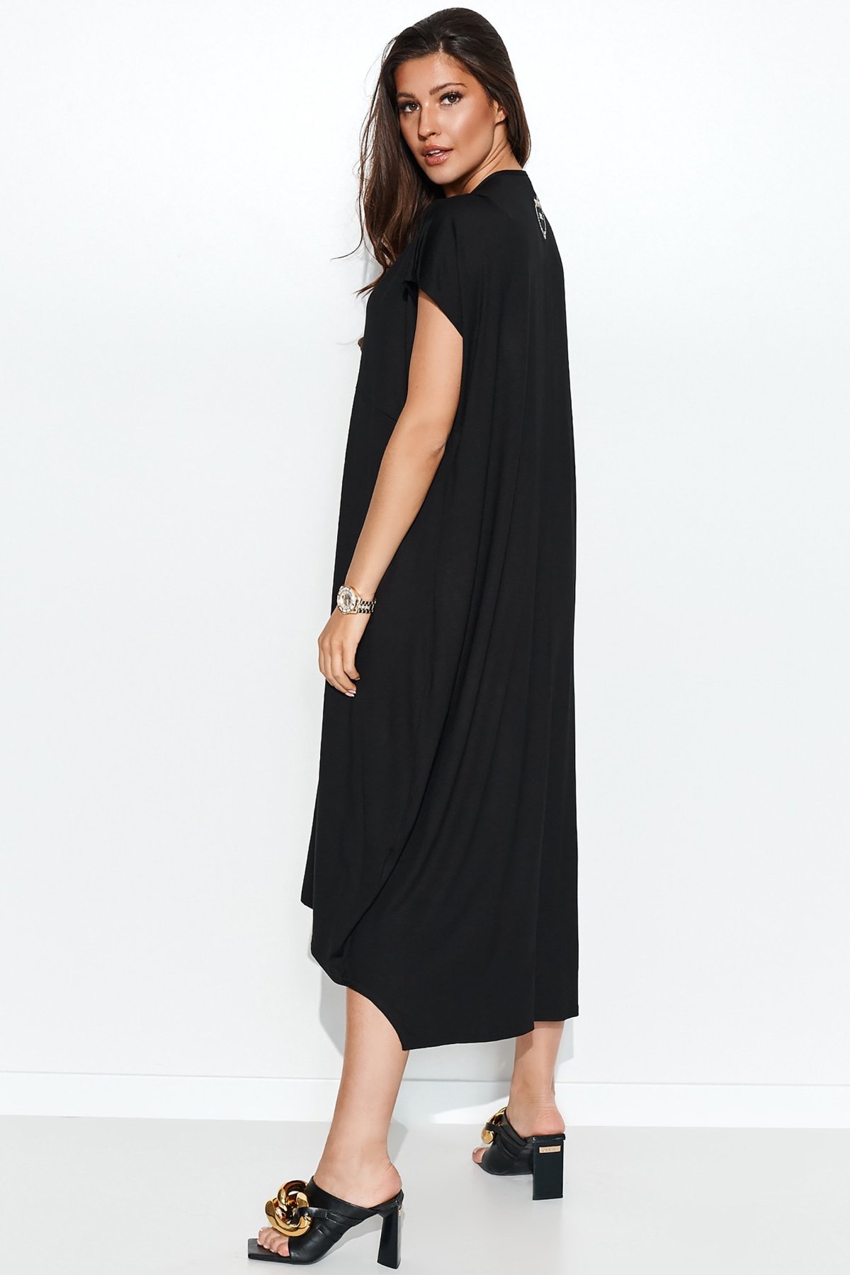 Ležérní elegance a volnost pohybu. To vystihuje tyto dlouhé asymetrické šaty černé barvy. Jsou ušité z lehké, prodyšné viskózy, která se krásně přizpůsobí tělu a je příjemná i v teplých dnech. Asymetrický střih s kratším předním dílem a prodlouženým zadním dodává šatům moderní siluetu.