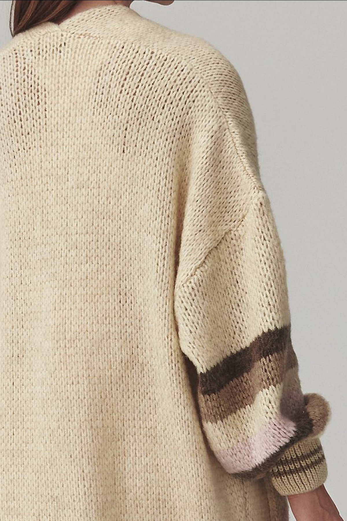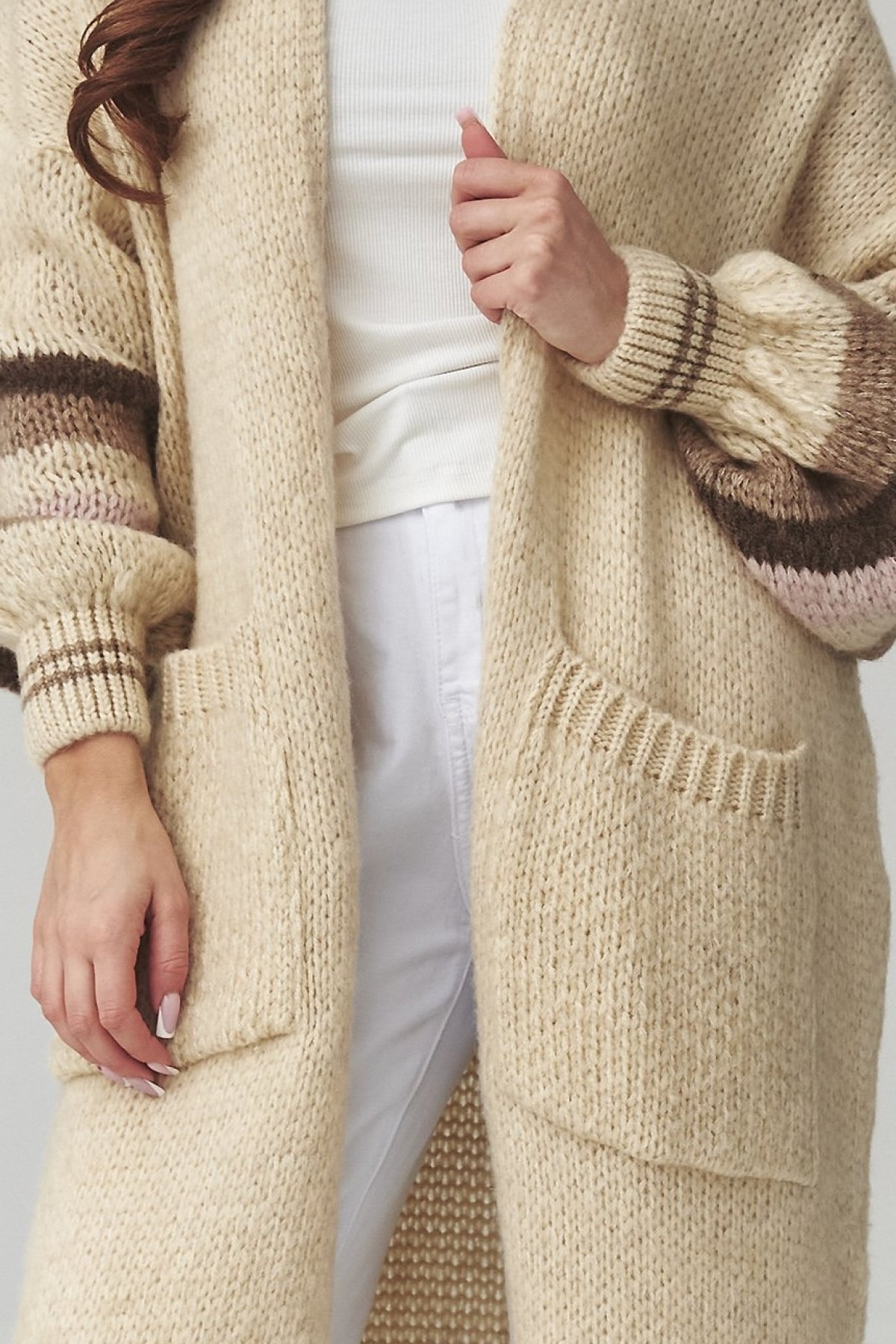 dlouhý oversize kardigan ozdobné pruhy na rukávech praktické velké kapsy měkký úplet s vlnou univerzální střih Dlouhý…