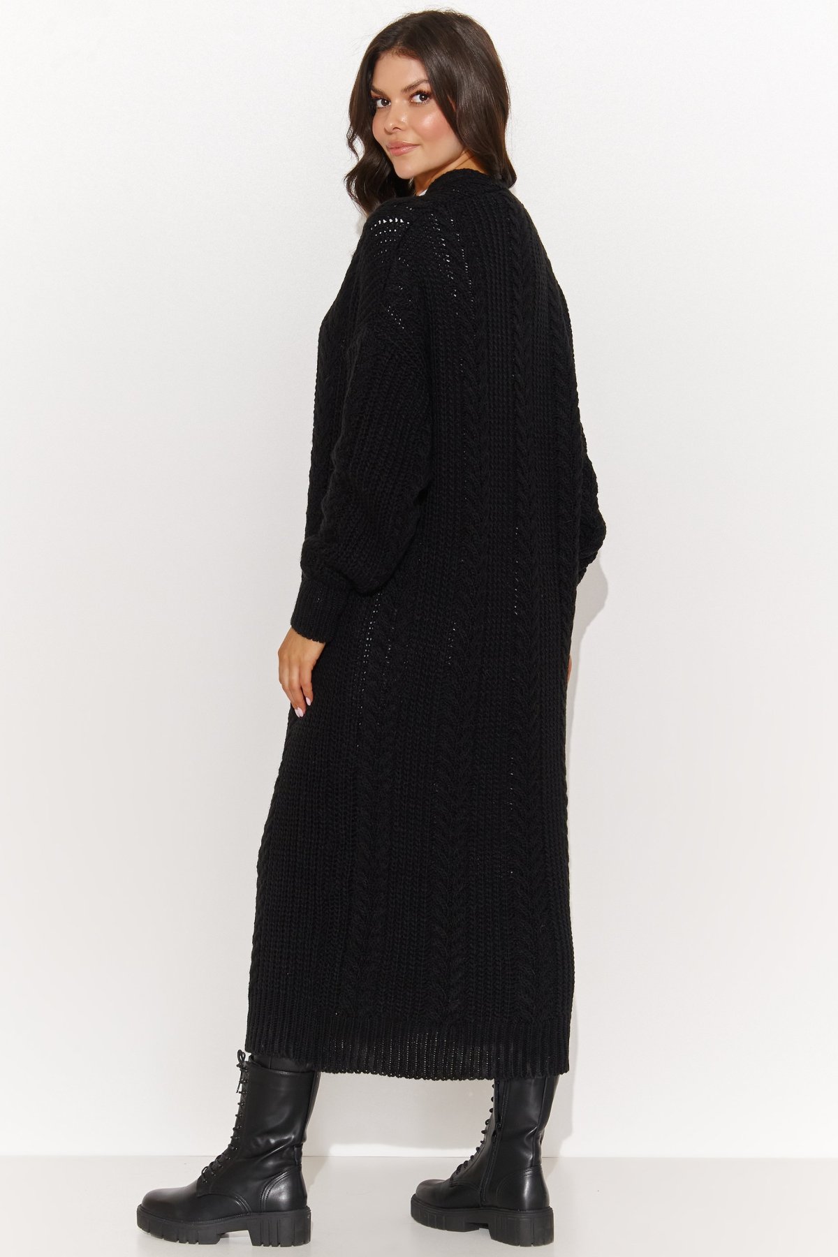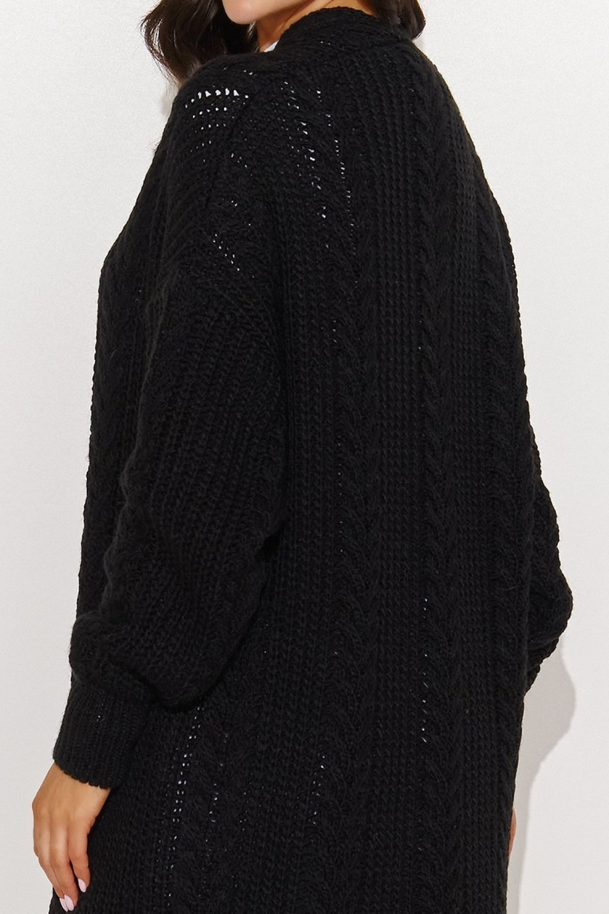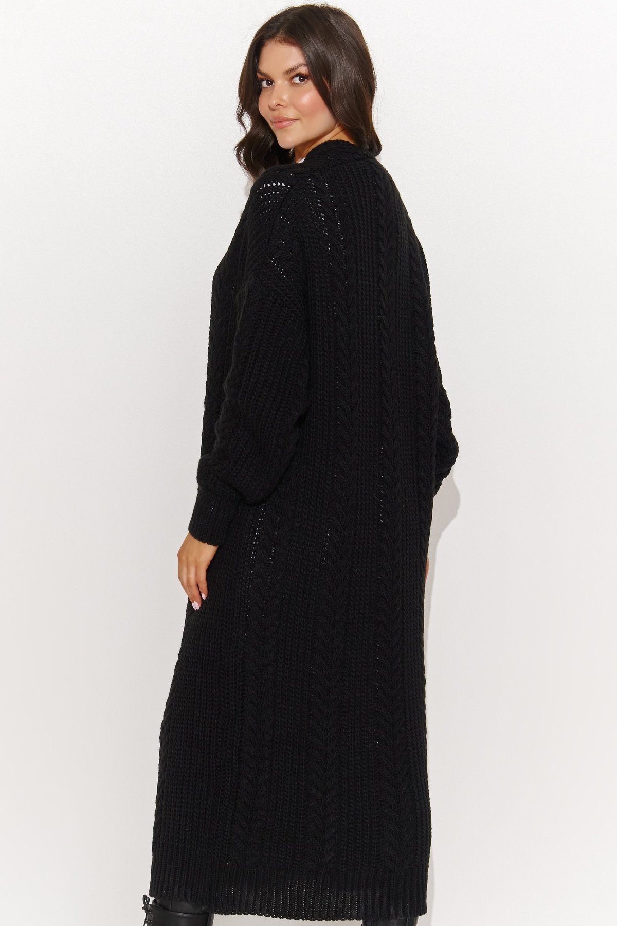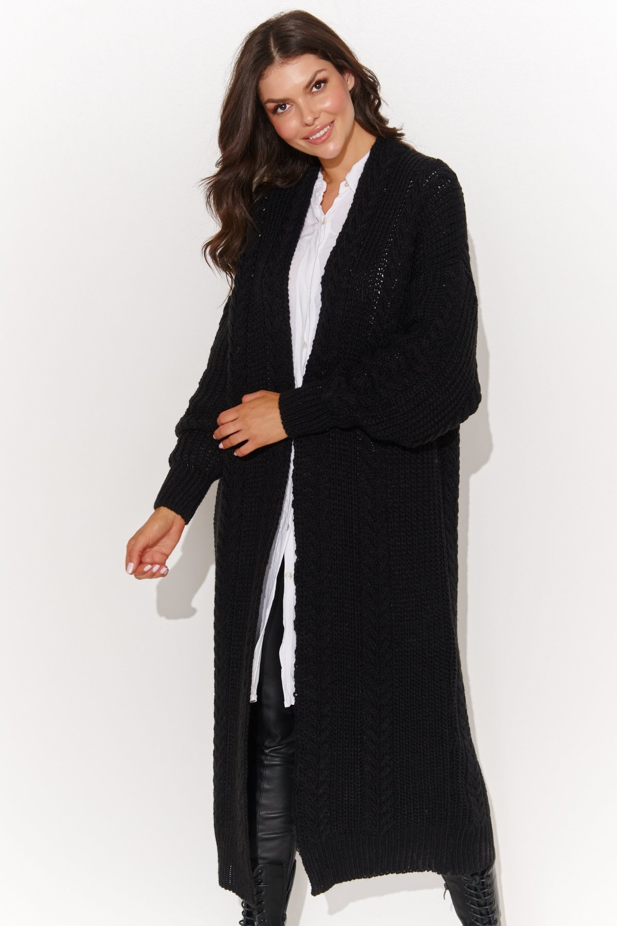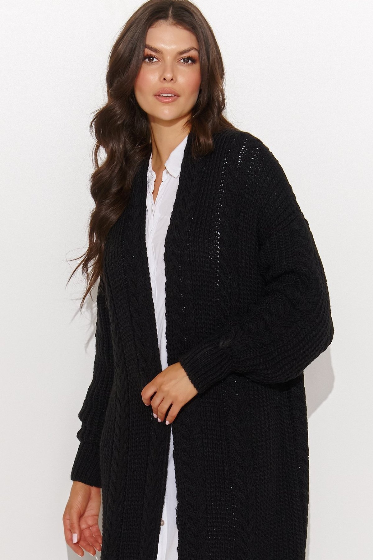 Dlouhý otevřený kardigan černé barvy je praktická vrstva, která dodá outfitu měkkost a klidný, upravený vzhled.