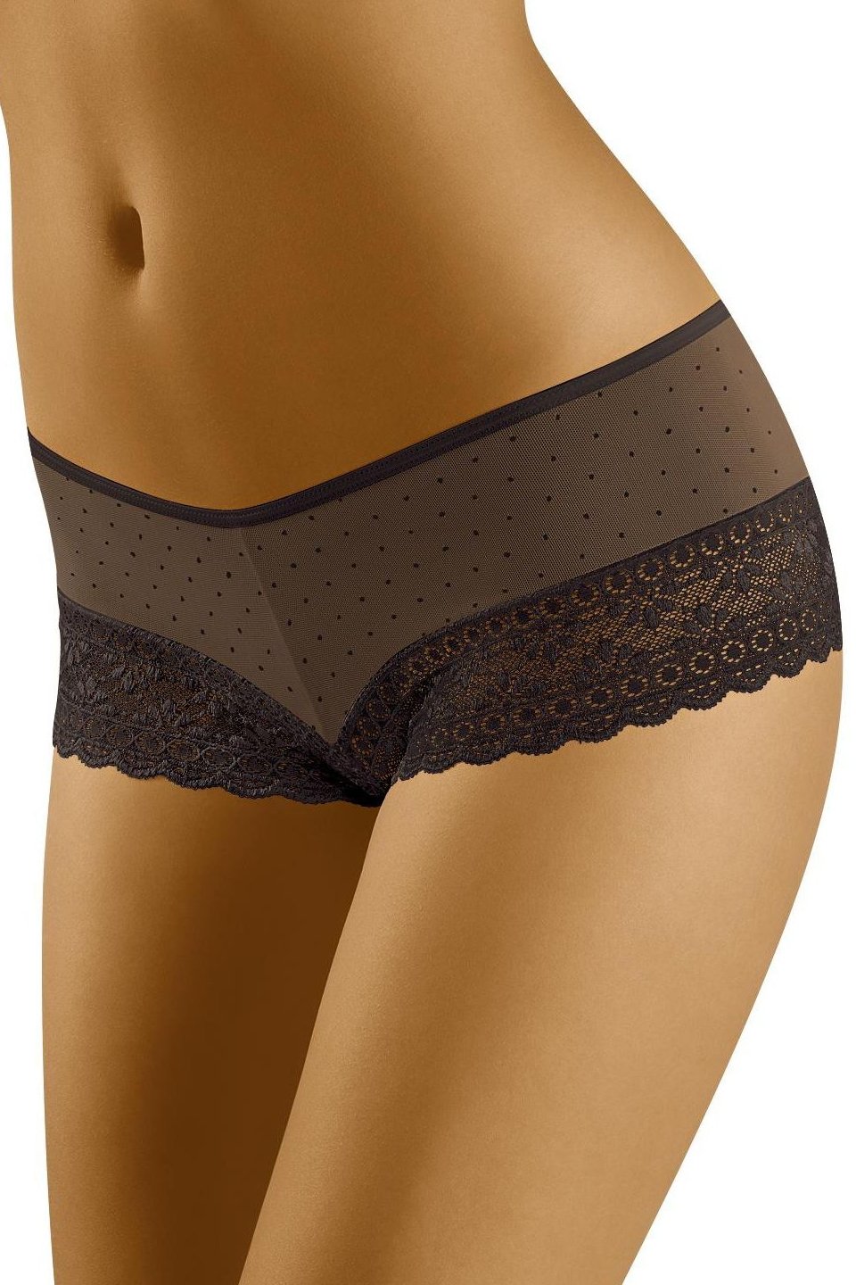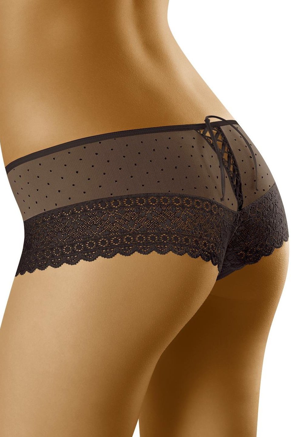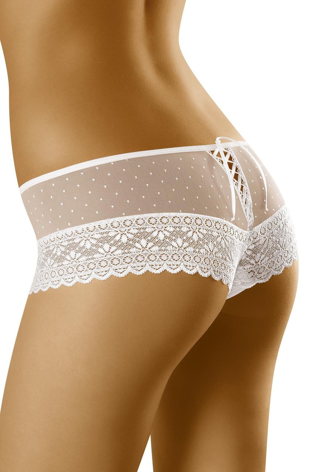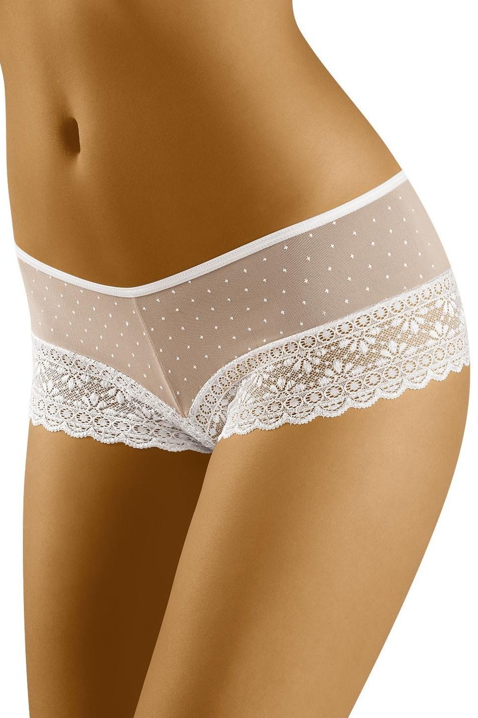 Tyto roztomilé dámské šortky v puntíkatém provedení spojují hravý vzhled s maximálním komfortem. Krajkové lemy kolem stehen dodávají prádlu něžný detail a zároveň vytvářejí elegantní zakončení, které působí velmi žensky. Díky pružné směsi polyamidu a elastanu se šortky příjemně přizpůsobí tělu, nikde netlačí a dobře drží tvar i při celodenním nošení. Skvělá volba, když chcete pohodlné kalhotky s nápadem – pod šaty, na doma i jako hezké prádlo „jen pro sebe“.