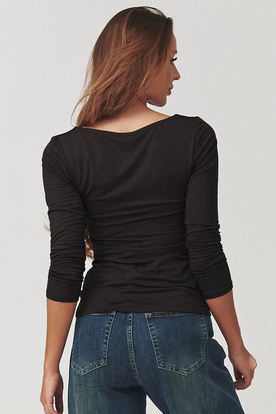 Dámská halenka černé barvy s výstřihem do tvaru čtverce je esencí ženské elegance a pohodlí v jednom.