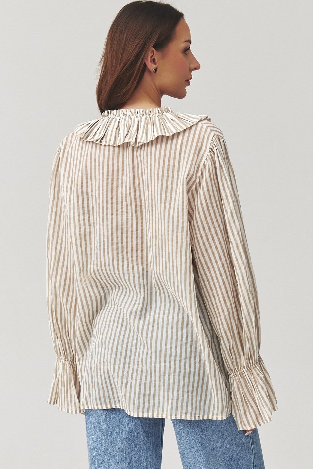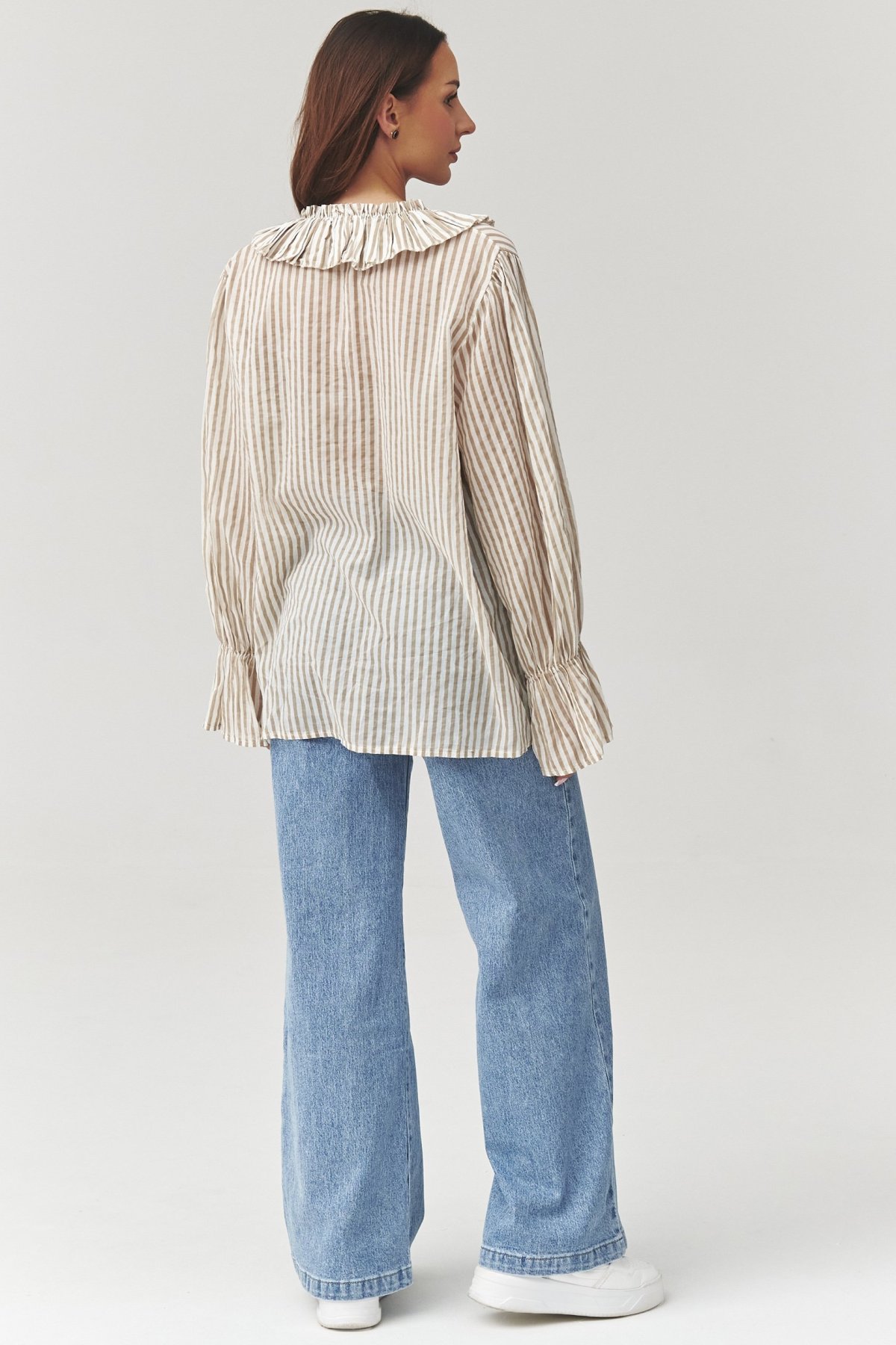 Elegantní halenka v béžovém odstínu je symbolem ženskosti a lehké elegance. Volný střih zajišťuje pohodlí, zatímco volán a šňůrkové zavazování u výstřihu dodávají romantický, módní vzhled.