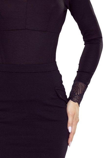 Halenka Kryspina je ztělesněním elegance a ženské smyslnosti. Černý, viskózový základ dokonale kopíruje křivky těla, zatímco horní část s průhledným tylem a krajkovým zdobením dodává modelu sofistikovaný a romantický vzhled. Stojáček z krajky působí noblesně a v kombinaci s delikátními detaily na ramenou a rukávech vytváří harmonický celek. Zadní část je ozvláštněna jemným výstřihem se zapínáním na knoflíček a krajkovou vložkou, která podtrhuje celkovou rafinovanost bluzky. Díky elastickému materiálu je nejen elegantní, ale i velmi pohodlná. Tento model se perfektně hodí na večerní akce, slavnostní události nebo romantickou večeři, kde zaručeně přitáhne pozornost.