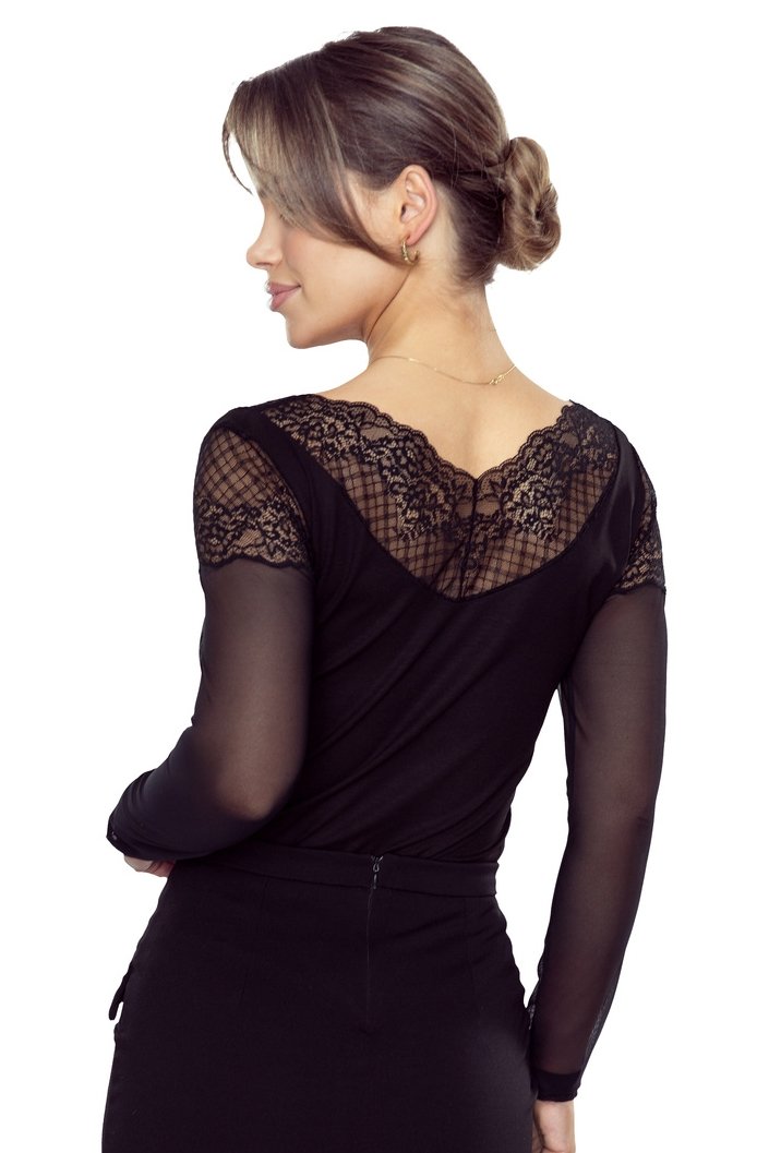 Halenka Manami je symbolem elegance a ženského šarmu. Její rafinovaný design kombinuje jemnou viskózovou tkaninu s půvabnými detaily z krajky a tylu. Průhledné rukávy z jemné síťoviny dodávají modelu lehkost a vzdušnost, zatímco dekolt ve tvaru písmene V s krajkovým lemem působí velmi smyslně a zároveň sofistikovaně. Díky elastické struktuře látky se bluzka krásně přizpůsobí postavě a podtrhne její přirozené křivky. Tento kousek se stane ideálním společníkem jak pro večerní schůzky či společenské události, tak i pro každodenní kombinace s elegantní sukní nebo kalhotami. Pokud hledáte stylovou bluzku, která propojuje klasiku s jemným nádechem romantiky, Manami bude tou správnou volbou.