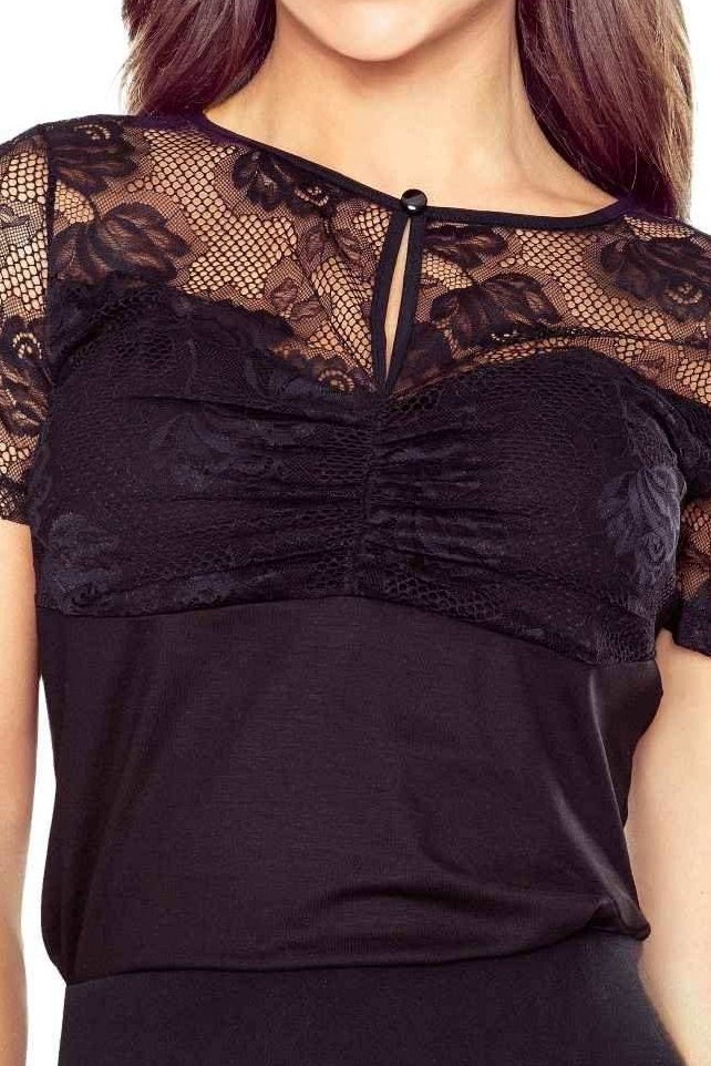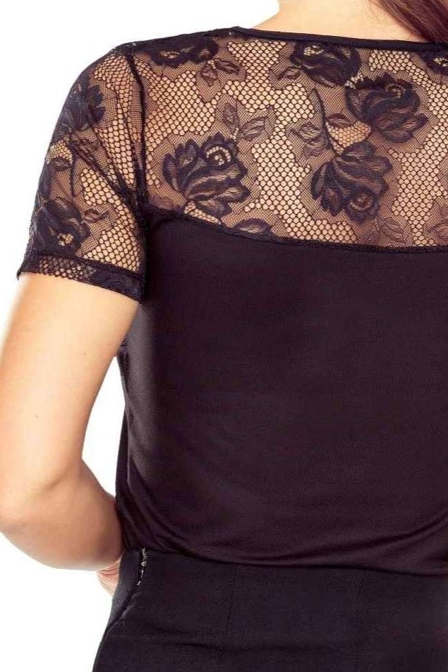 Blůzka Nagela kombinuje krycí, hladký korpus s výraznou krajkovou partií v horní části, takže působí elegantně, ale zároveň jemně svůdně. Hustá květinová krajka na ramenou a v oblasti dekoltu vytváří krásný kontrast k černé a dodá outfitu hloubku i bez výrazných doplňků. Drapování na prsou zvýrazní ženské křivky a opticky modeluje dekolt do tvaru srdce – efekt je sofistikovaný, ne prvoplánový. Detail „slzičky“ pod krkem s drobným knoflíčkem působí jako šperk a přitáhne pohled nahoru. Viskóza je příjemná a prodyšná, elastan přidá pružnost a polyamid zpevní krajku, aby držela tvar. Skvělá volba k sukním i kalhotám na večer, do kanceláře nebo slavnostnější příležitosti.