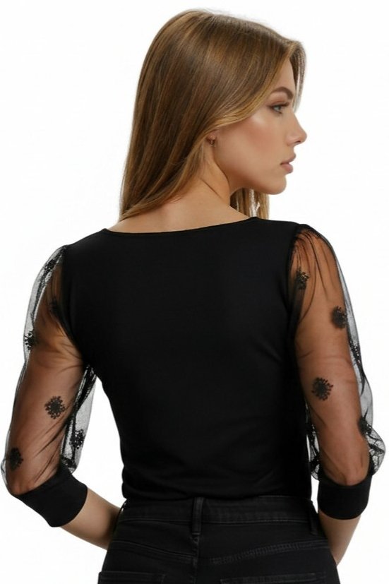Černá halenka s poloprůhlednými nabíranými rukávy z jemného tylu