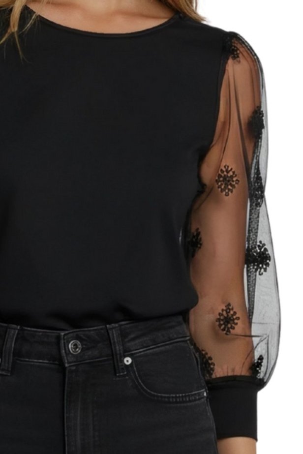 Elegantní halenka s průhlednými rukávy ze vzorovaného tylu, zúženými nad zápěstím.Díky nabíraným rukávům působí…