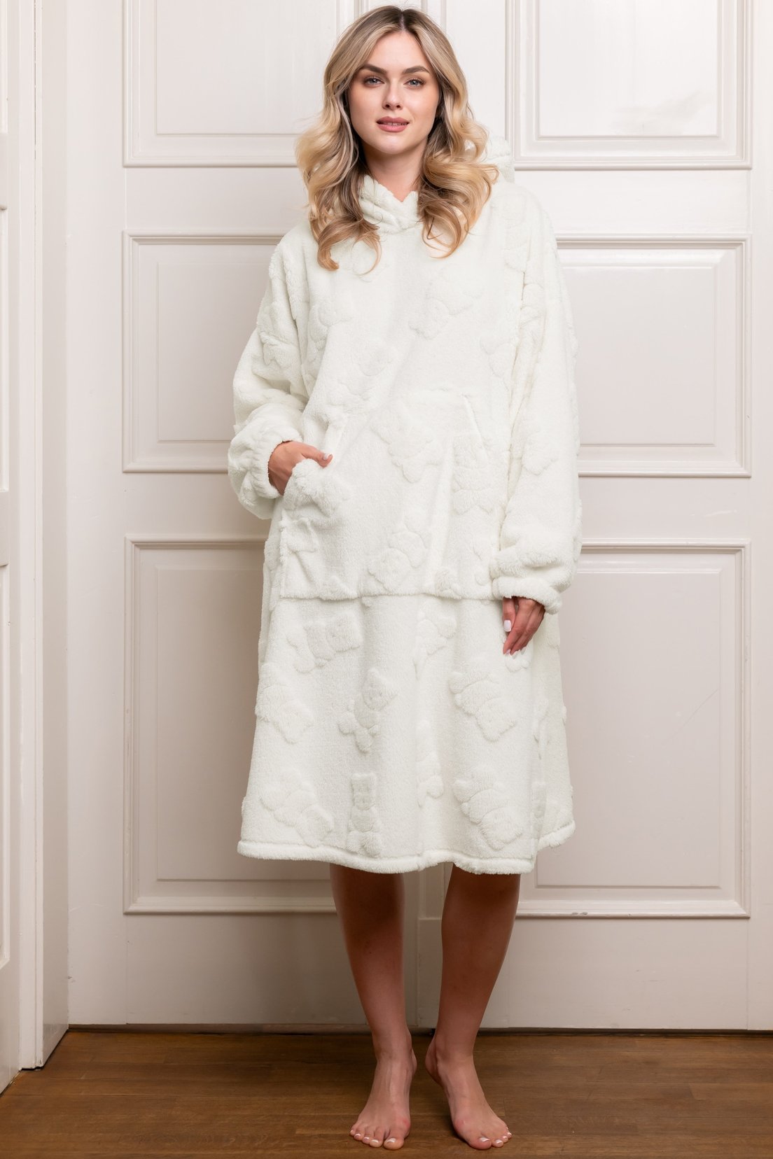 Tento kousek je vyroben z měkkého, plyšového materiálu s roztomilým 3D vzorem medvídků, který působí nejen stylově, ale také neuvěřitelně příjemně na dotek. Volný střih zaručuje naprostou volnost pohybu, zatímco kapuce a prostorná přední kapsa dodávají na praktičnosti i ležérním kouzlu.