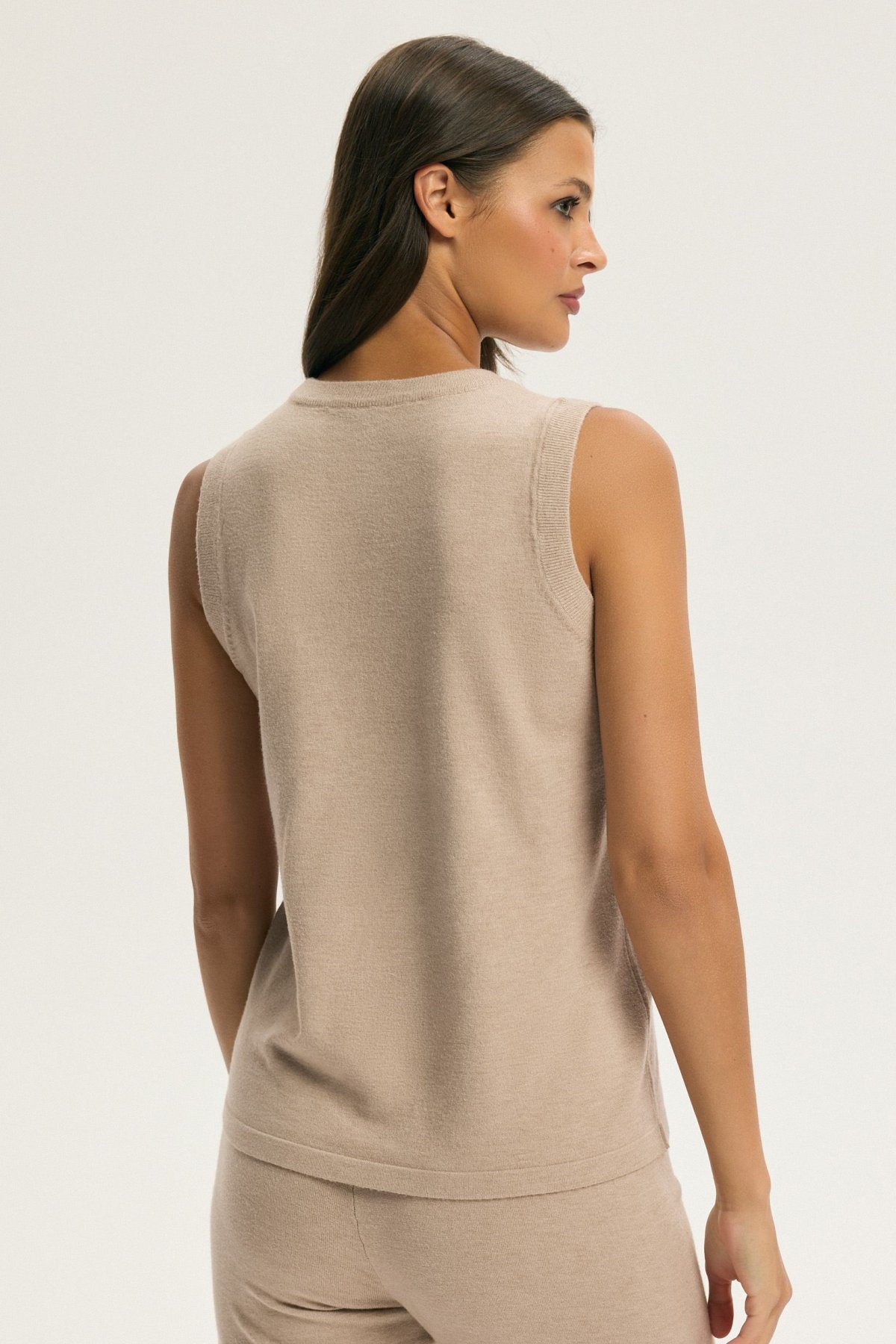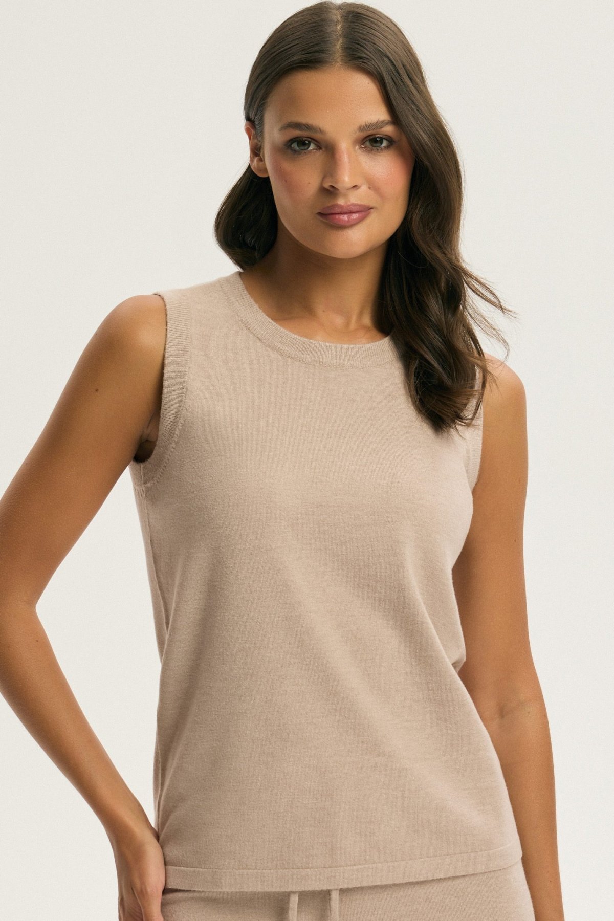 Tílko Calmo představuje minimalistickou eleganci a pohodlí v tom nejčistším pojetí. Vyrobený z jemného úpletu s měkkou, přiléhavou strukturou. Příjemně obepíná tělo a zajišťuje celodenní komfort. Bez rukávový střih decentně zvýrazňuje ramena a dodává outfitu přirozenou lehkost. Velmi snadno se kombinuje s dalšími kousky.