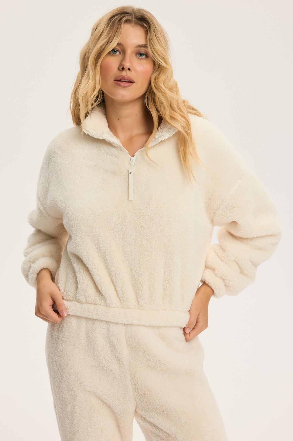 Dámská mikina Giggle v krémovém odstínu je synonymem měkkosti a komfortu. Její hebký, plyšový povrch příjemně zahřeje a přitom zůstává lehký, takže se v ní budete cítit jako v obláčku. Volný střih s nižší linií ramen dodává uvolněný vzhled, zatímco krátký zip u krku umožňuje upravit výstřih podle nálady – od hřejivě uzavřeného po ležérně otevřený.