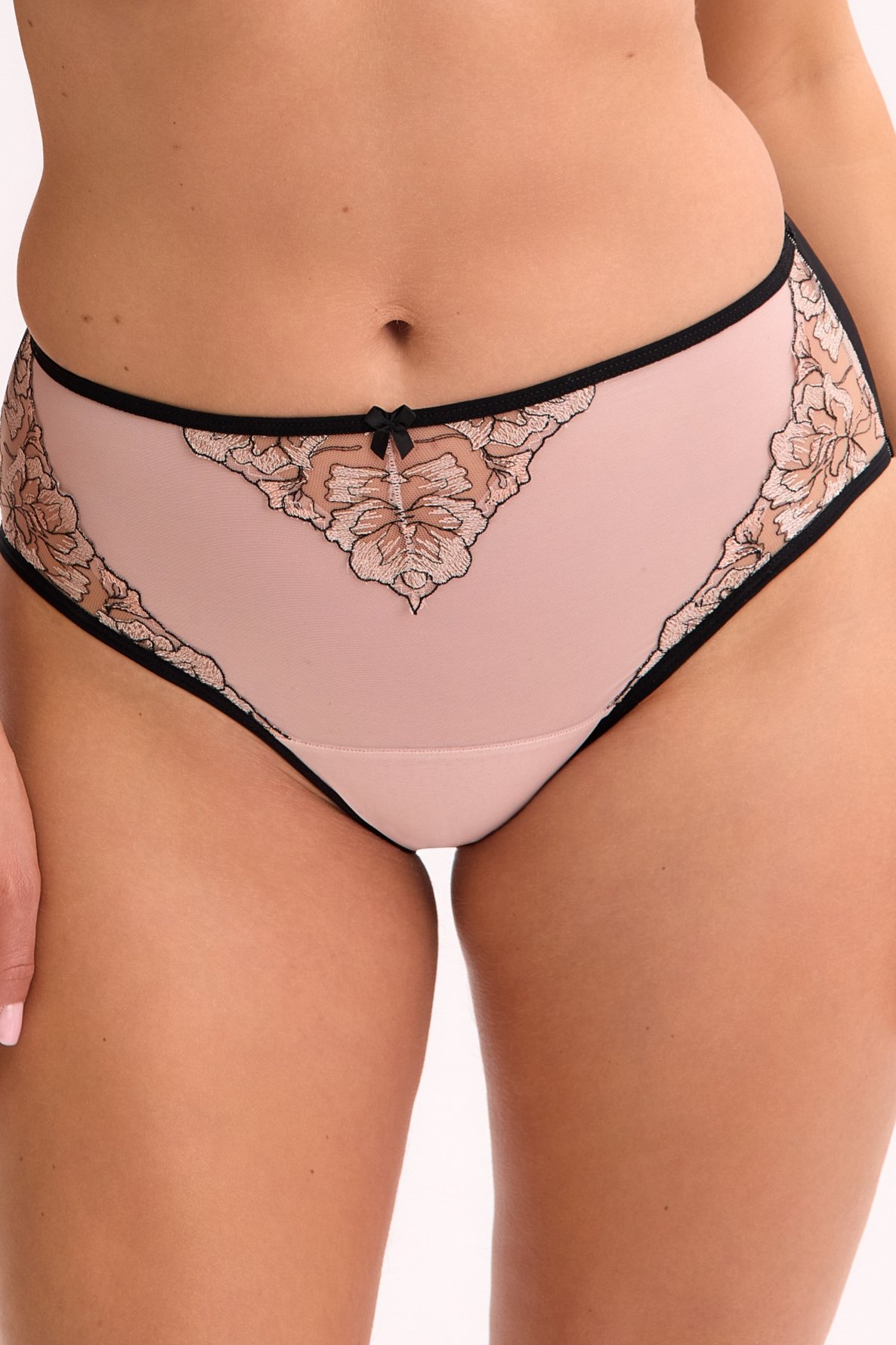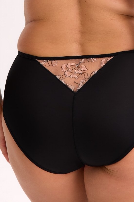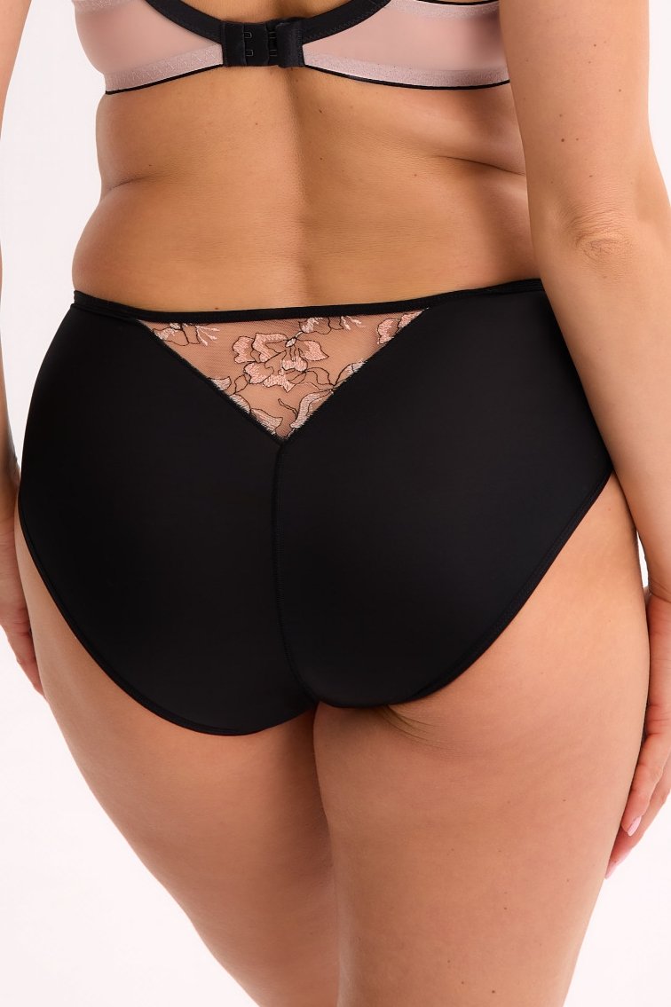 Kalhotky Xenia v elegantní kombinaci růžové a černé barvy. Přední díl zdobí decentní květinový motiv, který dodává modelu romantický a ženský charakter. Zadní část z hladkého mikrovlákna se svislým švem krásně tvaruje hýždě. Díky elastickým materiálům se kalhotky přizpůsobí tělu, nikde netlačí a zůstávají pohodlné po celý den. Bavlněný klínek navíc zaručuje příjemný pocit při nošení.