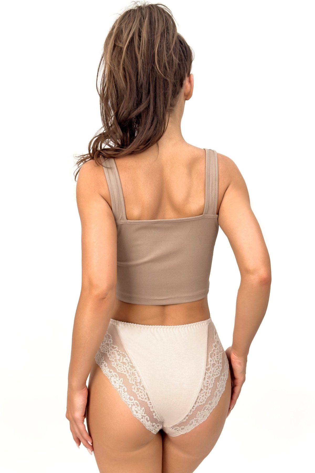 Dámské kalhotky Donna 228 s vysokým pasem jsou ideální volbou ženy, které hledají kombinaci elegance, pohodlí a decentní smyslnosti. Měkká viskóza se přirozeně přizpůsobí tělu a zaručí příjemný pocit při nošení po celý den. Krajkové zdobení vpředu i vzadu dodává prádlu něžný a romantický vzhled, zatímco vysoký střih napomáhá jemně vytvarovat linii břicha i boků.