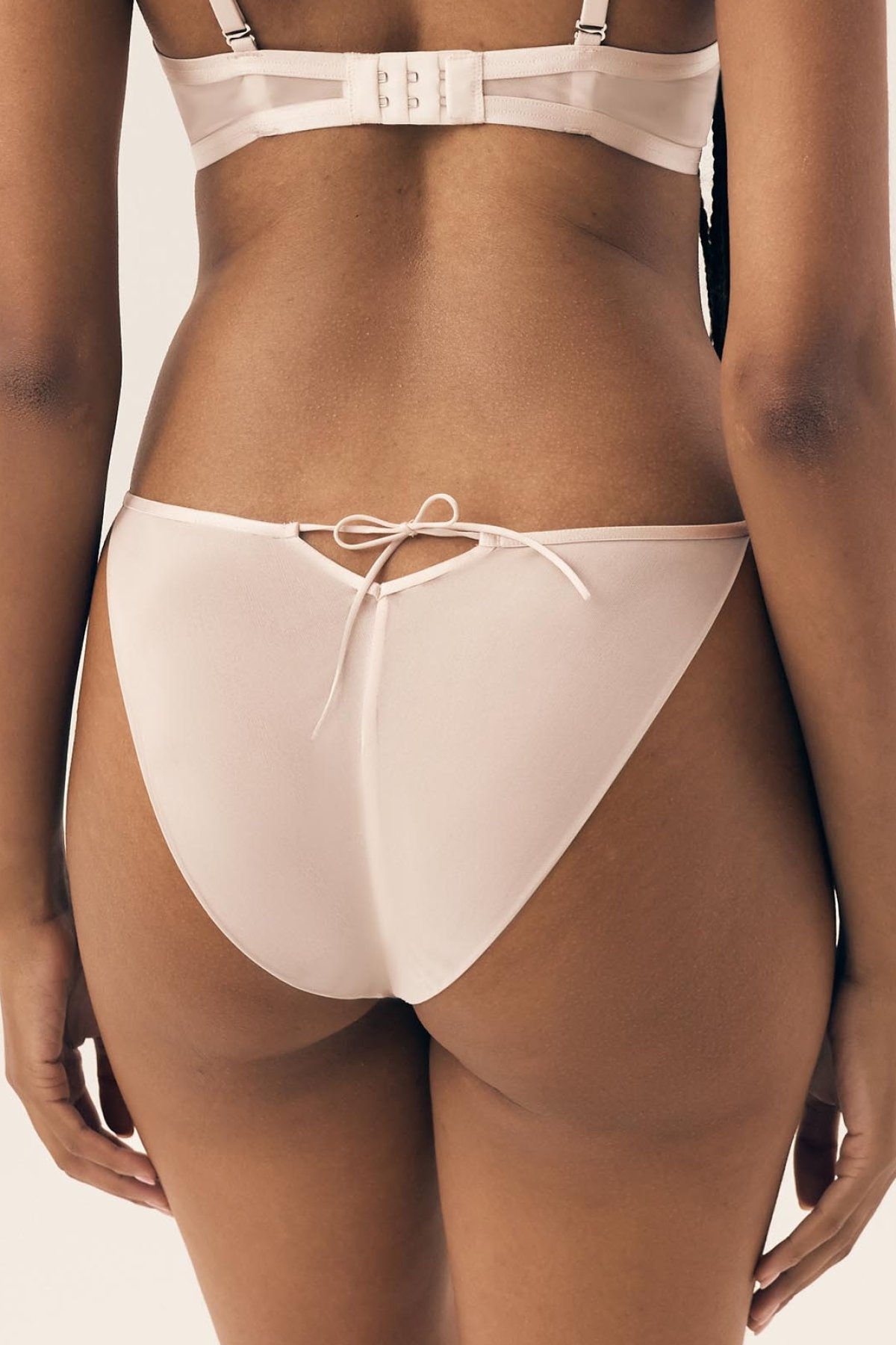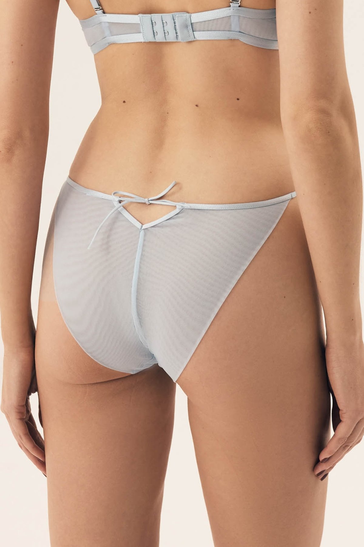 Přední část zdobí výšivka s jemně vlnitým okrajem, která modelu dodává měkký a ženský výraz. Zadní díl z mesh materiálu opticky odlehčuje střih a spolu s tenkými gumičkami po stranách pasu vytváří svůdný vzhled. Zadní mašlička přidává něžný detail, zatímco bavlněná podšívka v klínu zvyšuje pohodlí při nošení. Tento model se hodí pro chvíle, kdy chcete spojit jemný vzhled s lehkým a ženským střihem.