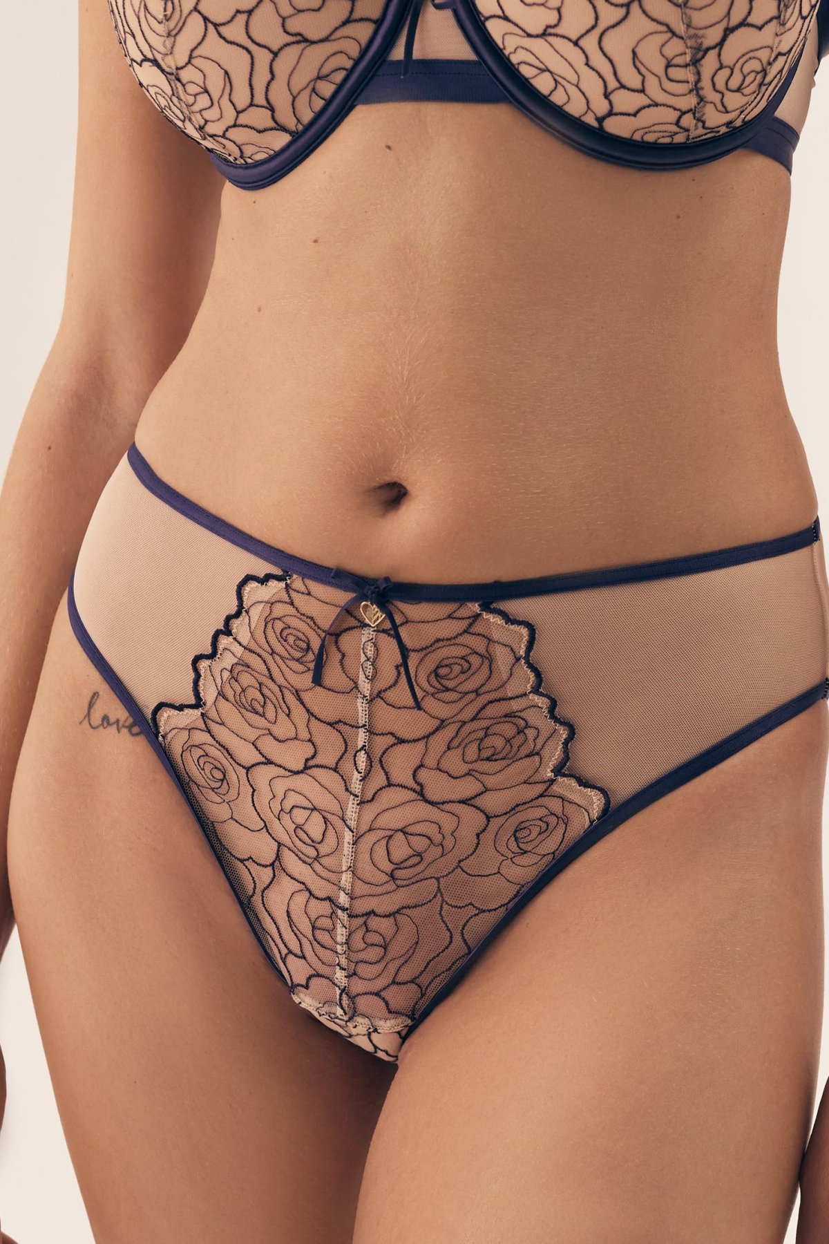 Vyšší pas příjemně obepíná siluetu, průsvitná síťovina dodává modelu lehkost a nechává vyniknout ženský charakter celého provedení. Přední část zdobí výšivka na tělovém podložení, která vytváří efektní kontrast a zároveň zachovává decentní vzhled. Ozdobná mašlička spolu s drobným akcentem vpředu podtrhují romantický dojem. Tento kousek se hodí pro chvíle, kdy chcete spojit jemnost, výrazný detail a lehký smyslný efekt.