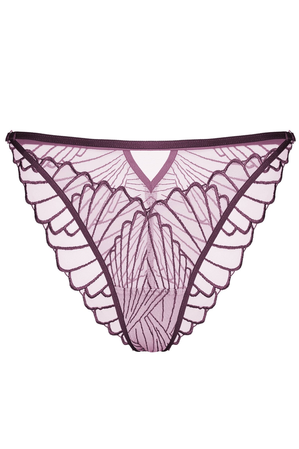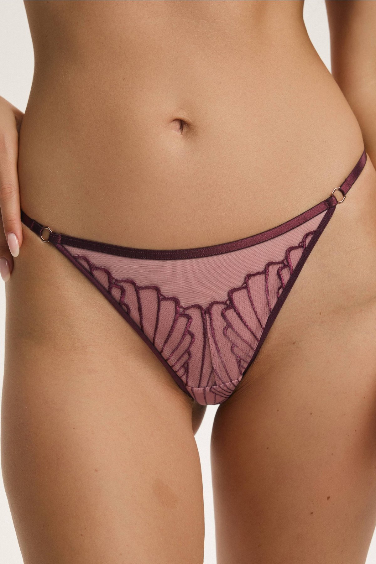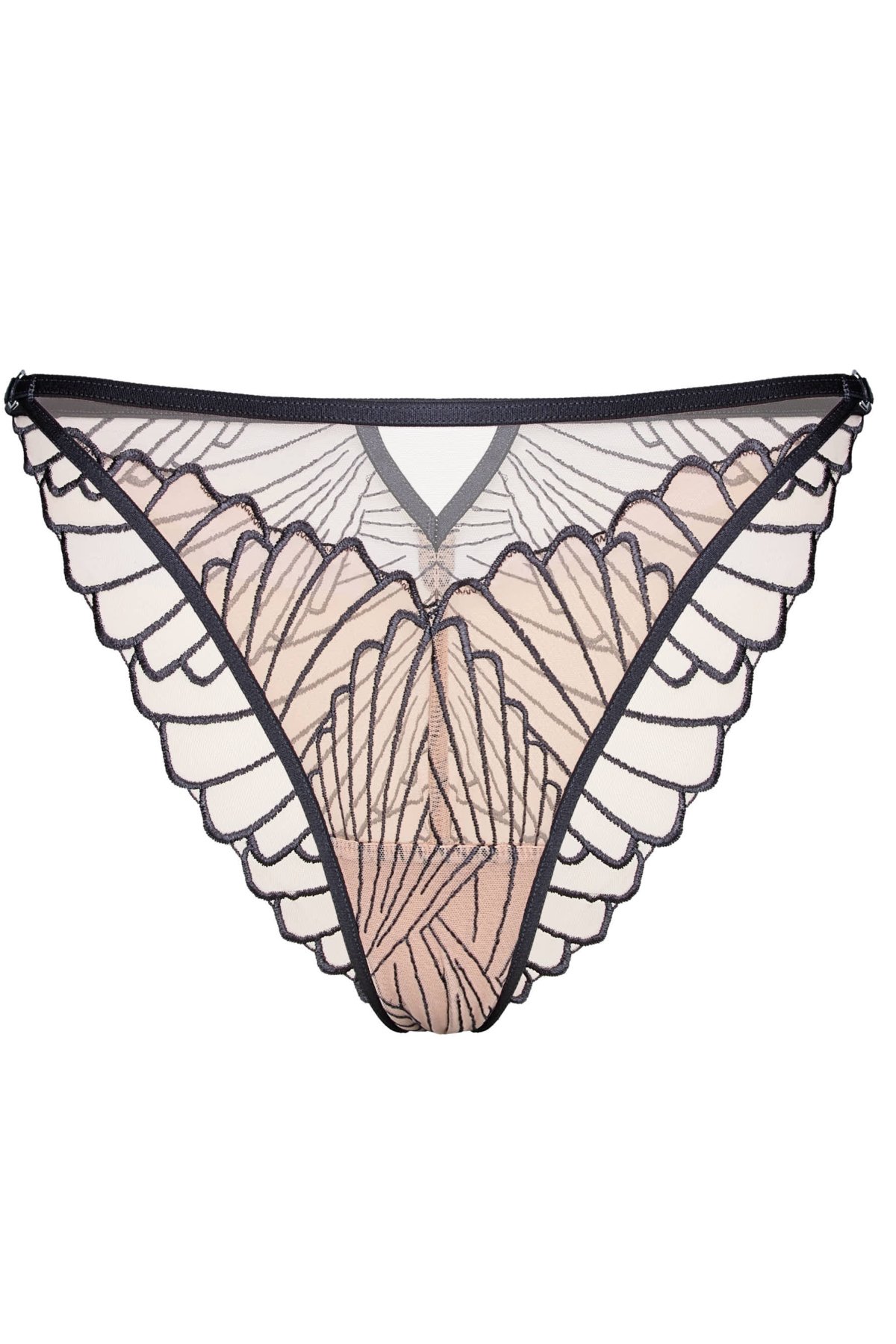 Vějířovitý motiv se rozprostírá na lehké síťovině a vytváří zajímavý, graficky laděný efekt na těle. Vyšší vykrojení opticky prodlužuje nohy a zvýrazňuje linii boků. Měkký, pružný materiál se přizpůsobí postavě a zajišťuje pohodlí při nošení. Detaily výšivky zvýrazňují tvar kalhotek a dodávají celku elegantní, lehce umělecký charakter.
