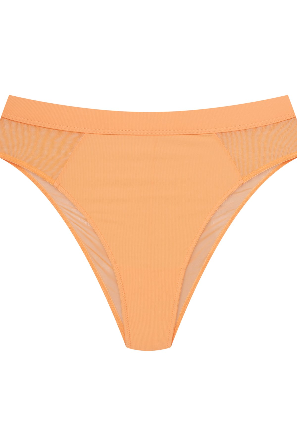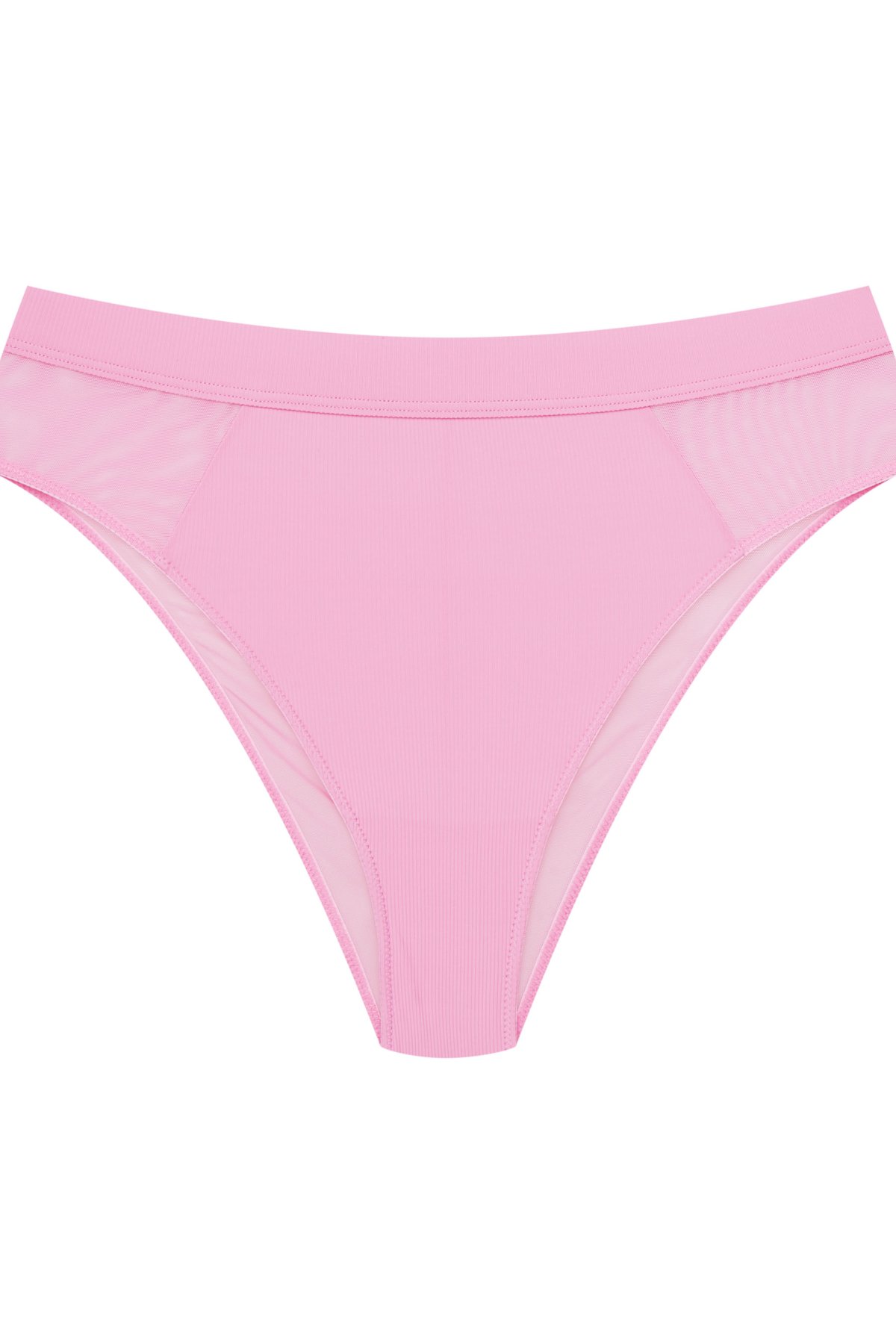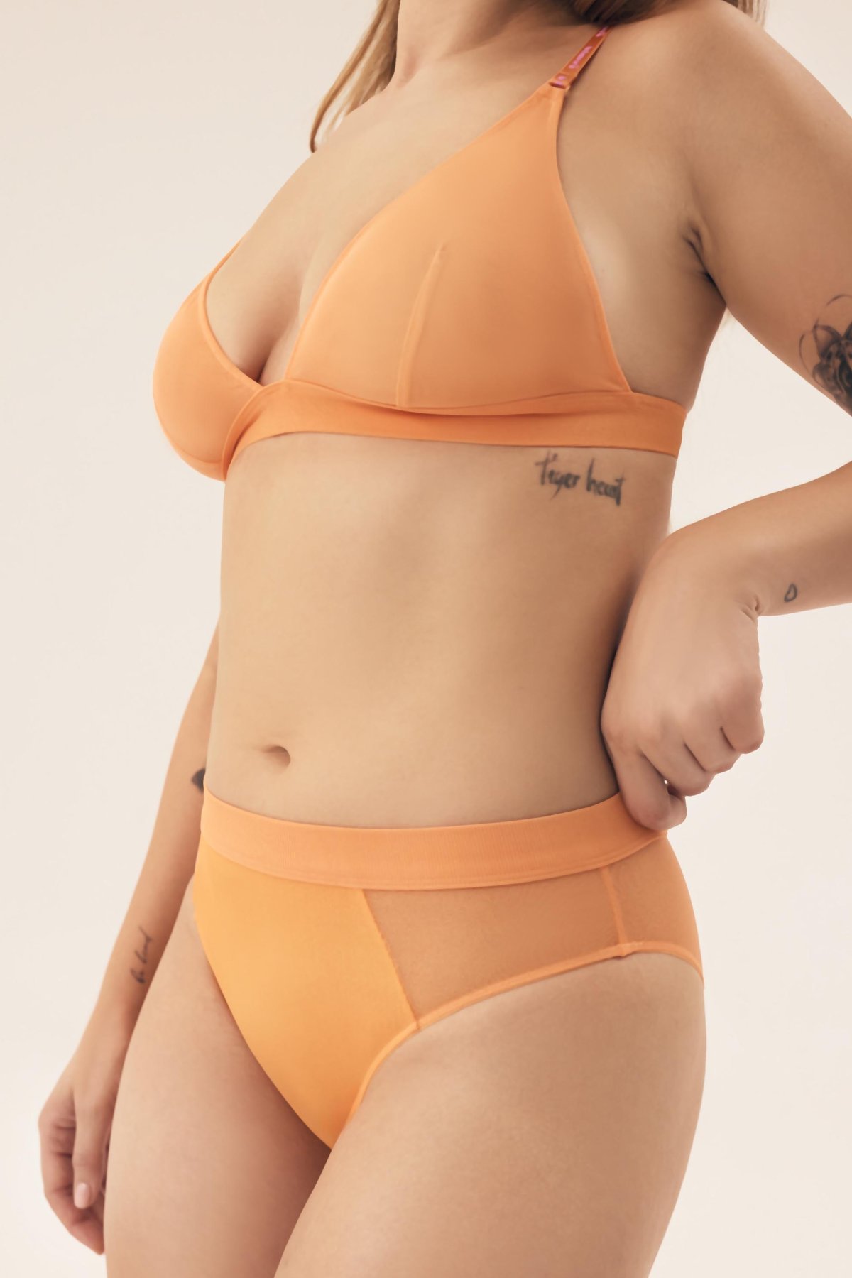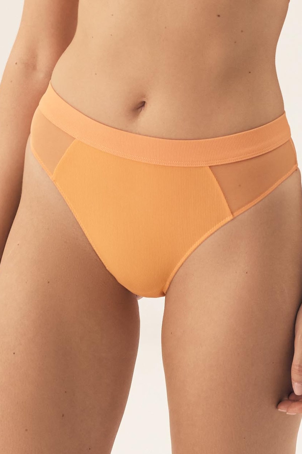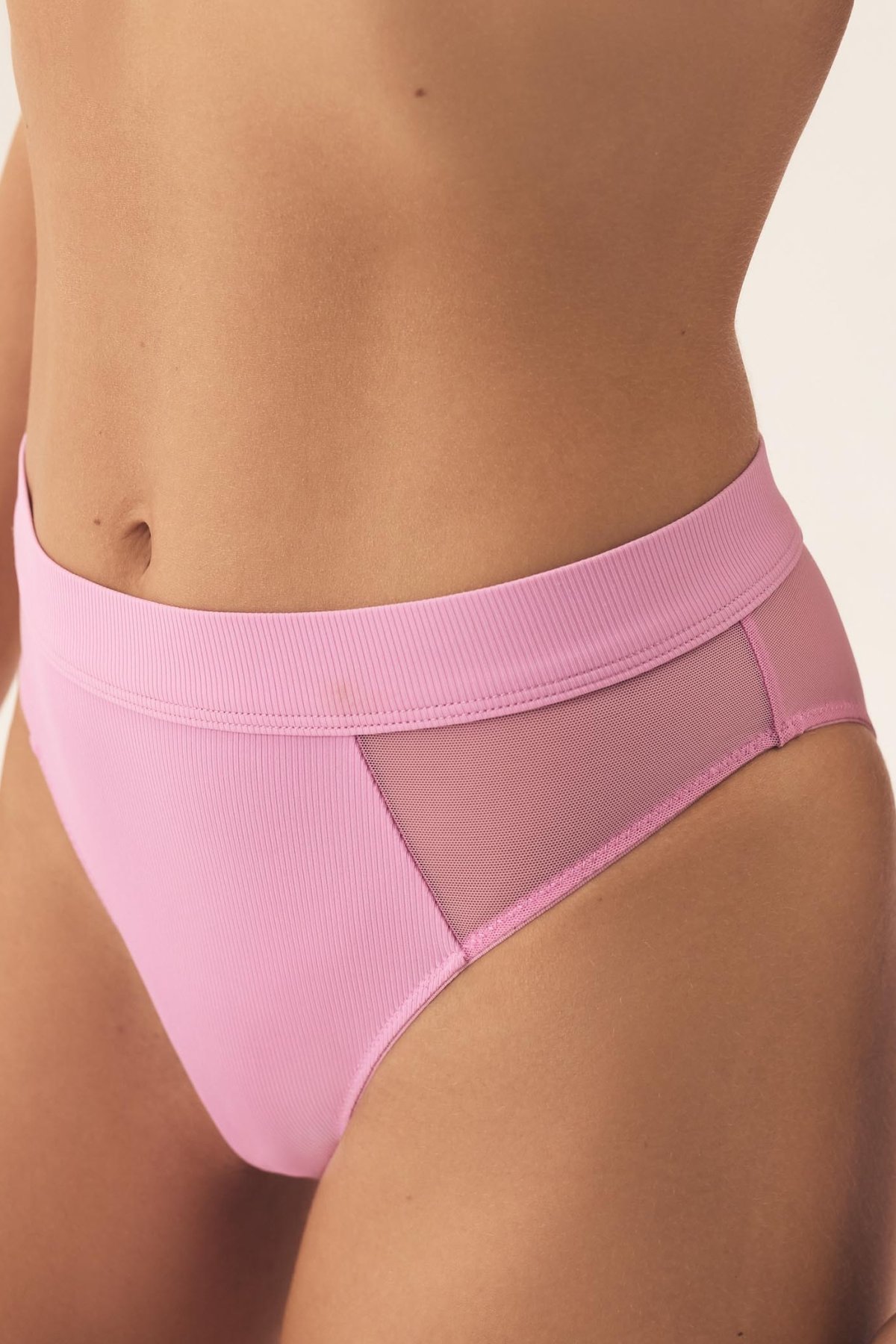 Kalhotky Bloovii Saoui zaujmou moderním střihem s vyšším pasem a širším pasovým dílem, který hezky obepne oblast pasu. Hladká přední část doplněná poloprůsvitnými síťovanými vsadkami po bocích vytváří lehký, ale stále více krytý vzhled. Geometrické linie dodávají modelu výraznější charakter a zároveň jemně podtrhují siluetu.