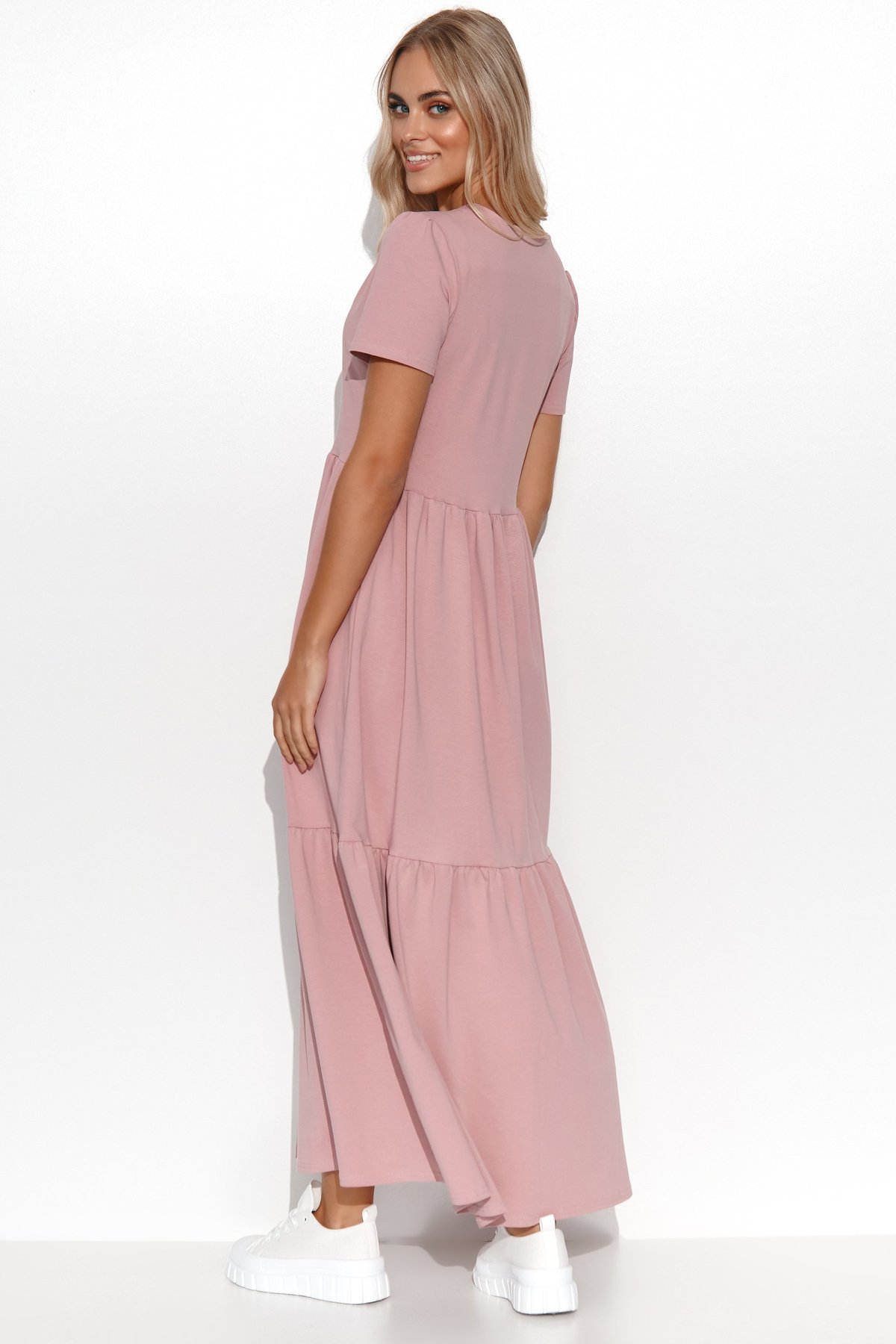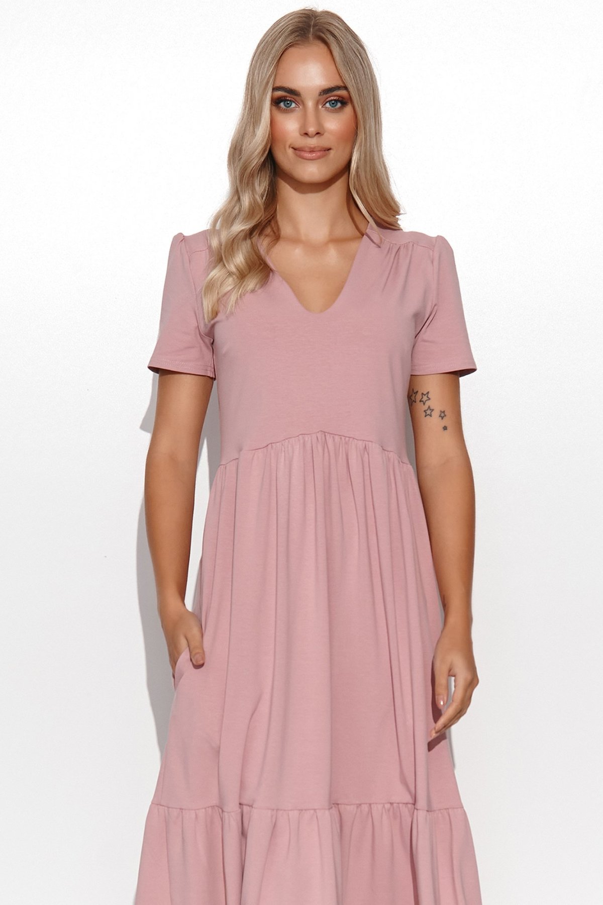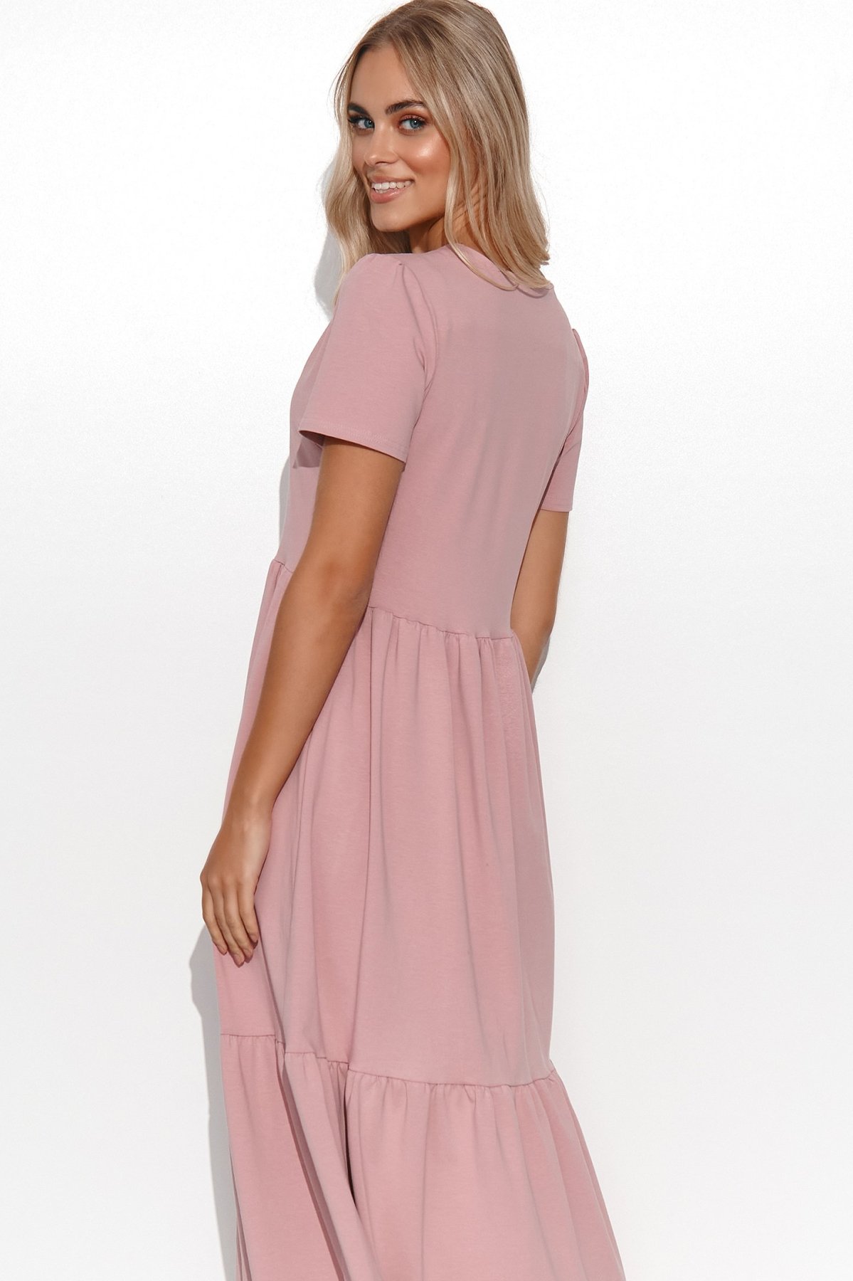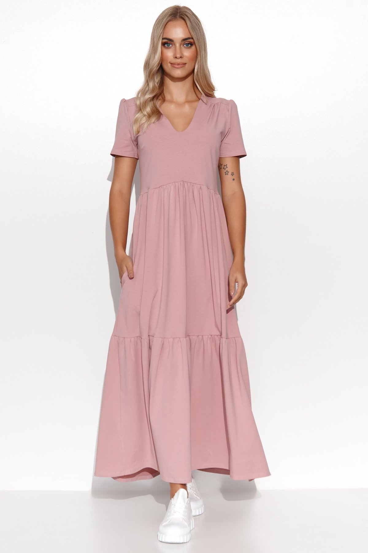 Dlouhé úpletové šaty ve starorůžovém odstínu spojující klasickou ženskost s nenucenou elegancí. Díky střihu, který zvýrazní pas a jemně rozšířené sukni, lichotí každé postavě. Výstřih do „V“ opticky prodlužuje krk, zatímco krátké rukávy decentně zakrývají ramena.