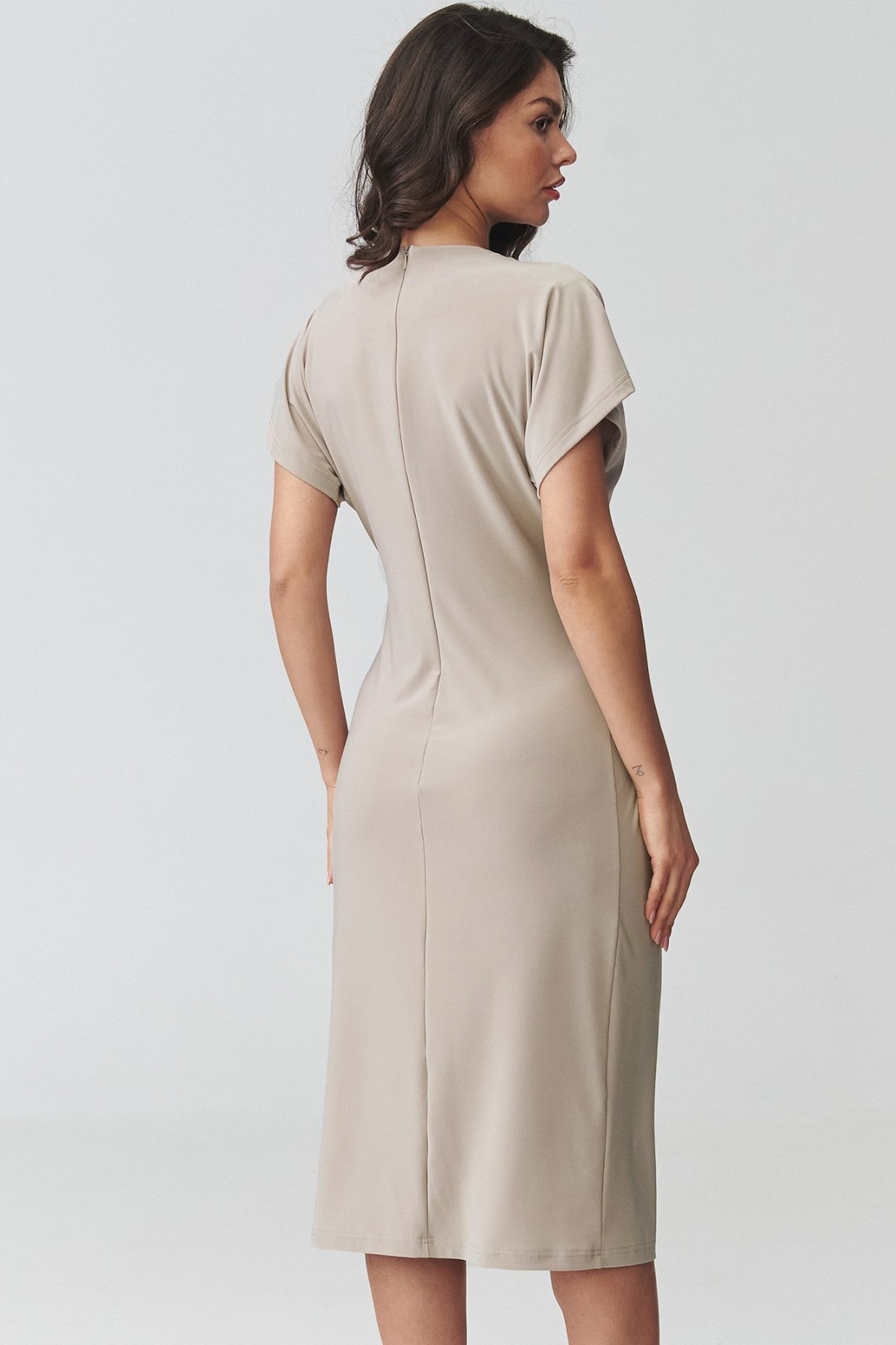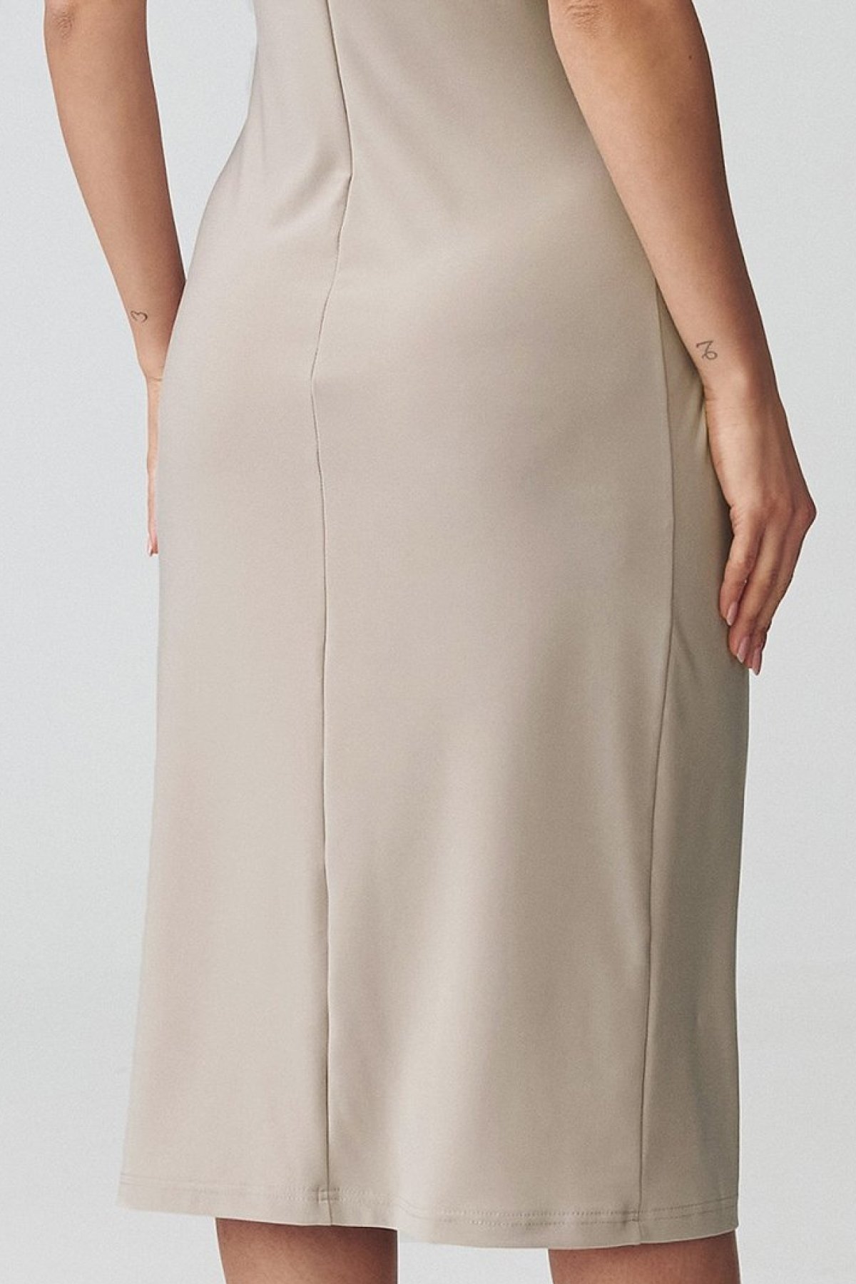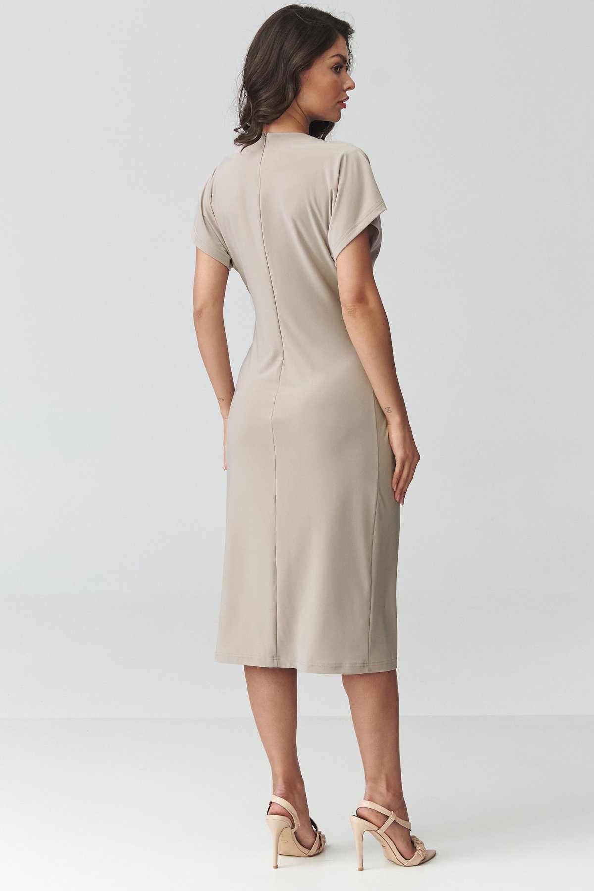 Tyto světle béžové midi šaty zaujmou vyvážením elegance a ženského střihu.