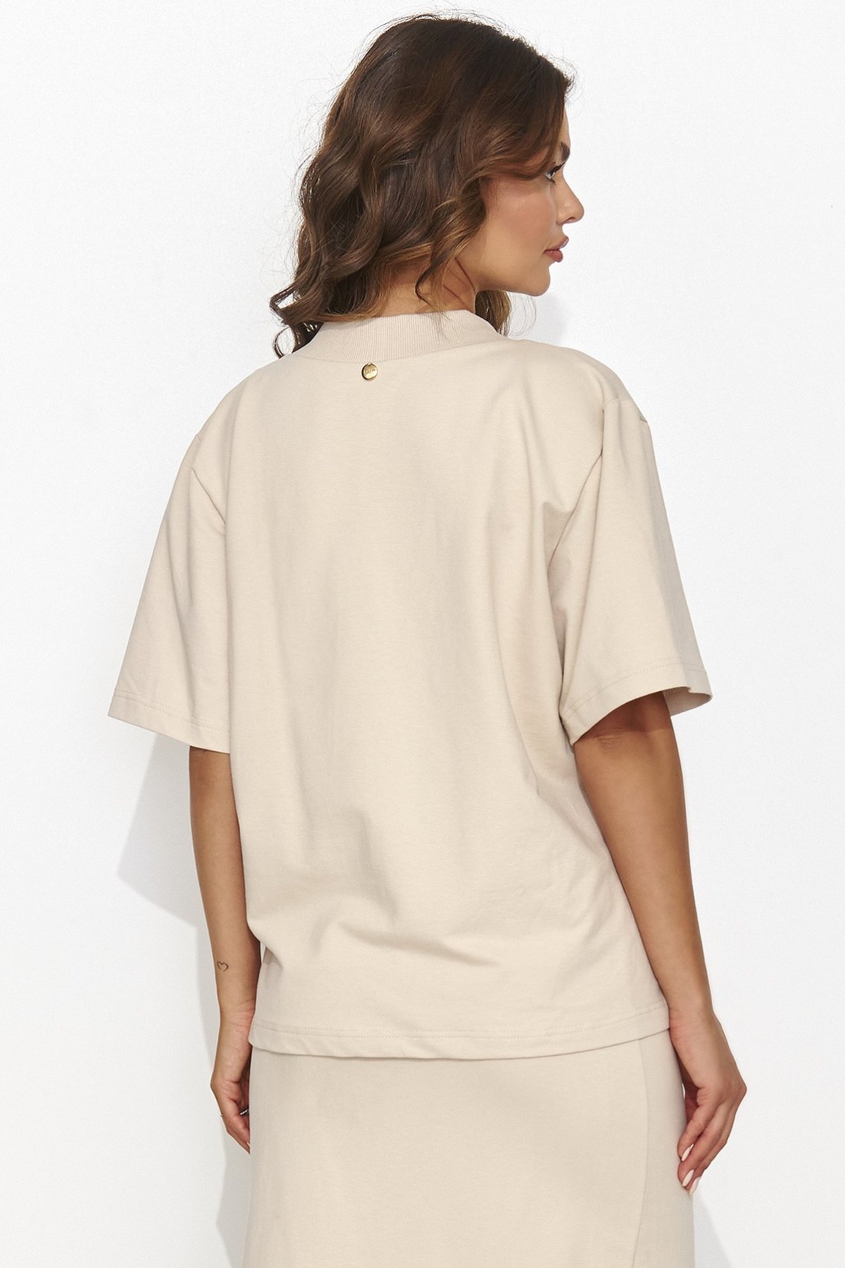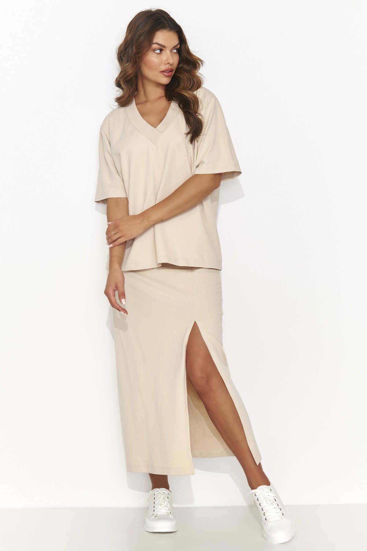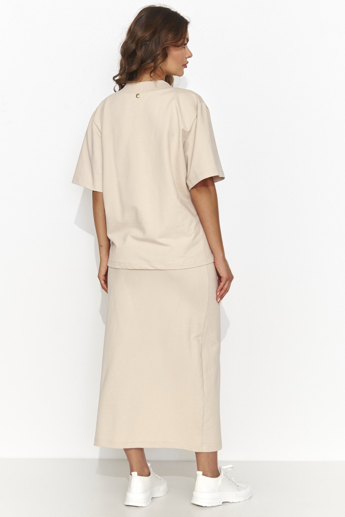 Dámský komplet NU468 v béžové barvě spojuje jednoduchost a styl. Přiléhavá midi sukně s decentním rozparkem krásně zvýrazní ženskou siluetu, zatímco volnější tričko s výstřihem do „V“ dodá celku ležérní lehkost. Zlatý detail na zadní straně působí jemně luxusně a podtrhuje moderní charakter soupravy. Tento outfit je ideální pro práci, schůzku i volný čas – stačí přidat tenisky pro uvolněný look, nebo podpatky pro elegantní dojem.