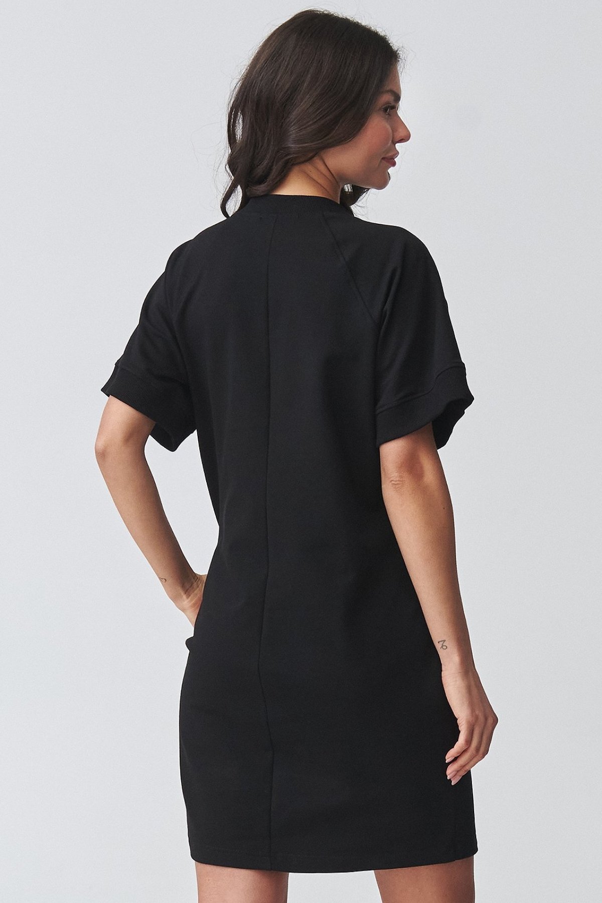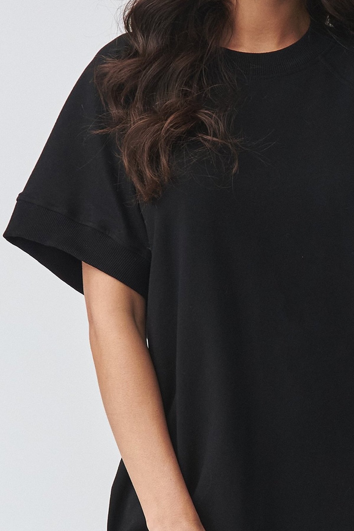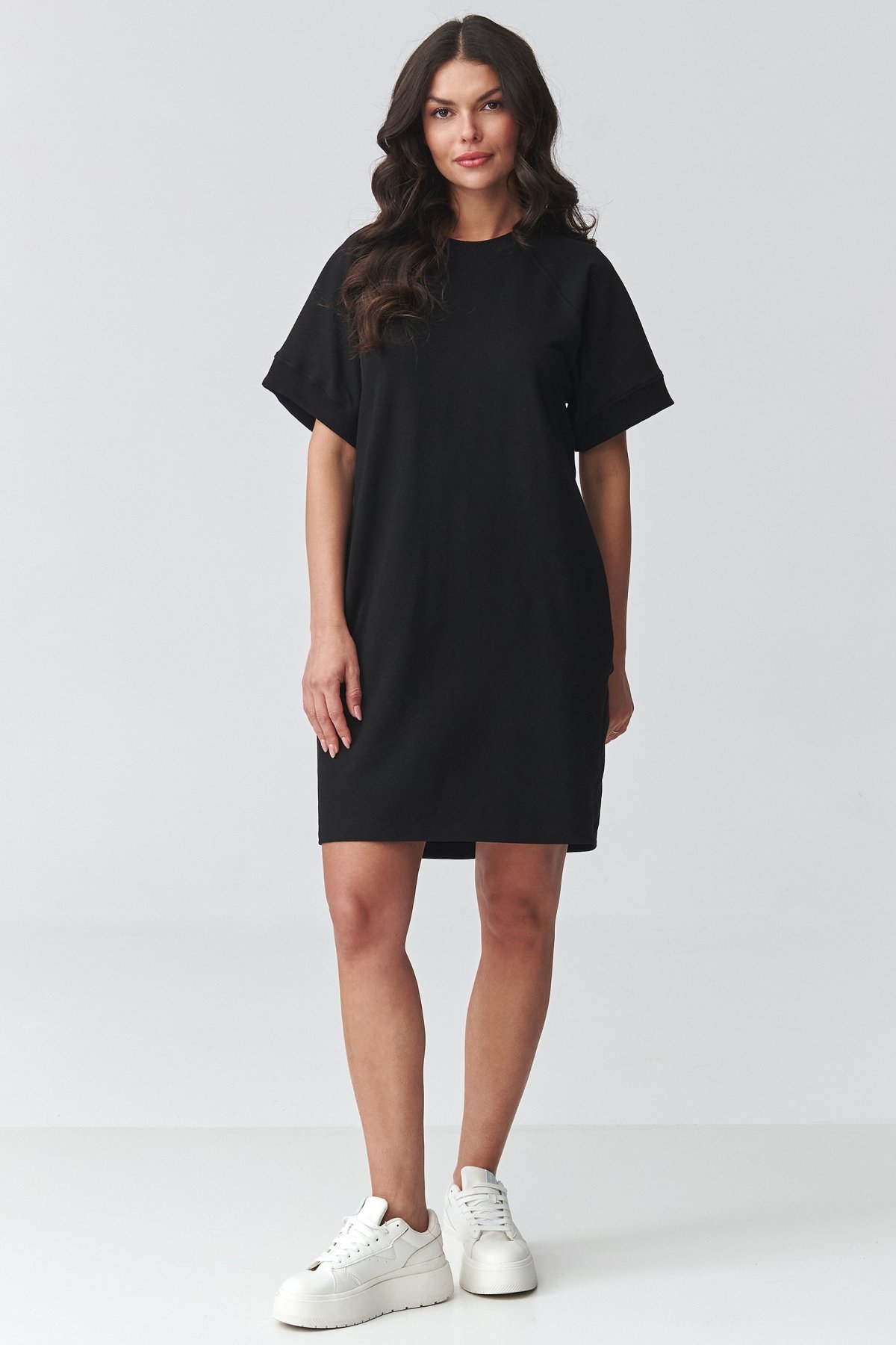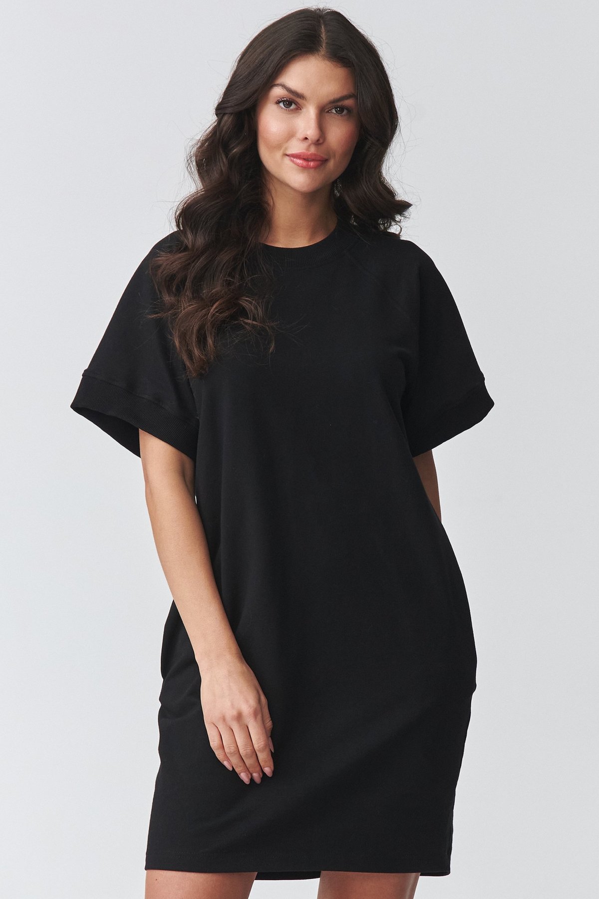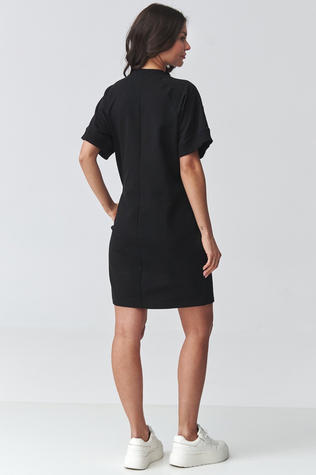 Pohodlné teplákové šaty černé barvy s krátkým rukávem jsou pohodlný kousek pro dny, kdy chcete volnost bez složitého stylingu.
