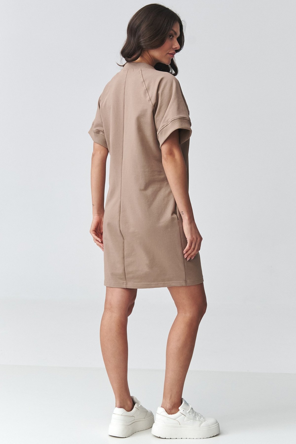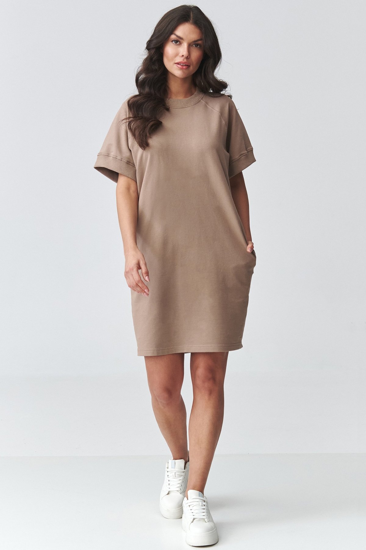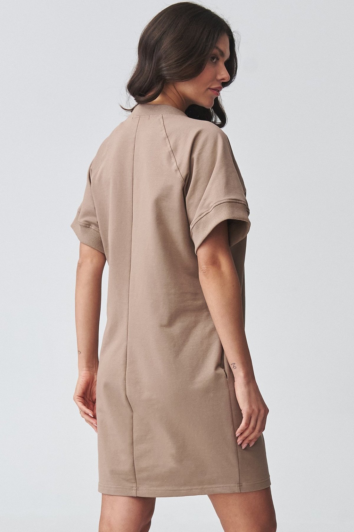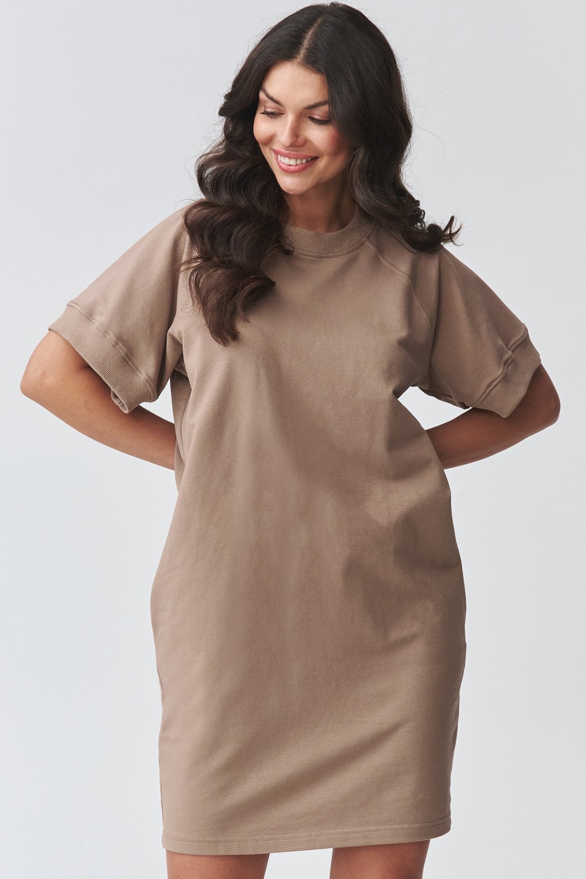 Pohodlné teplákové šaty v mocca odstínu s krátkým rukávem jsou pohodlný kousek pro dny, kdy chcete volnost bez složitého stylingu.