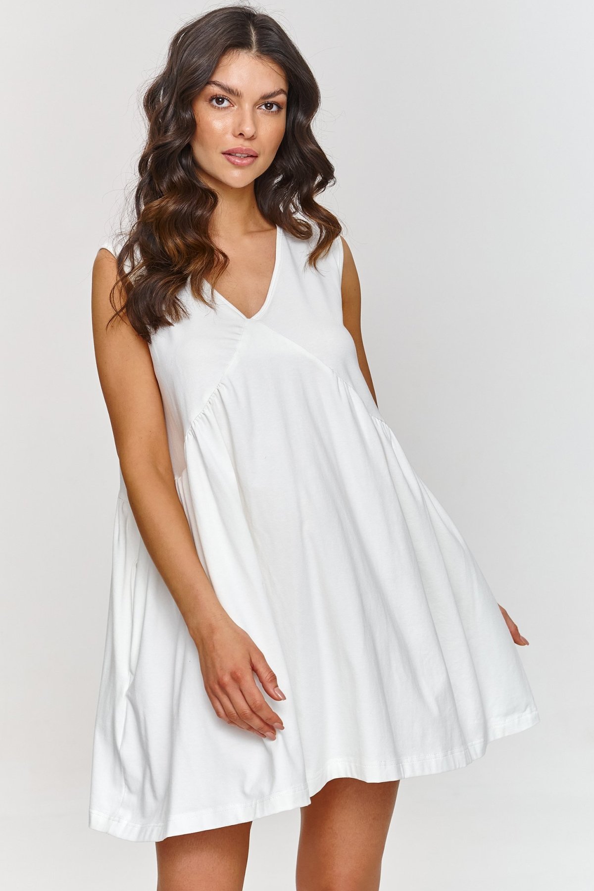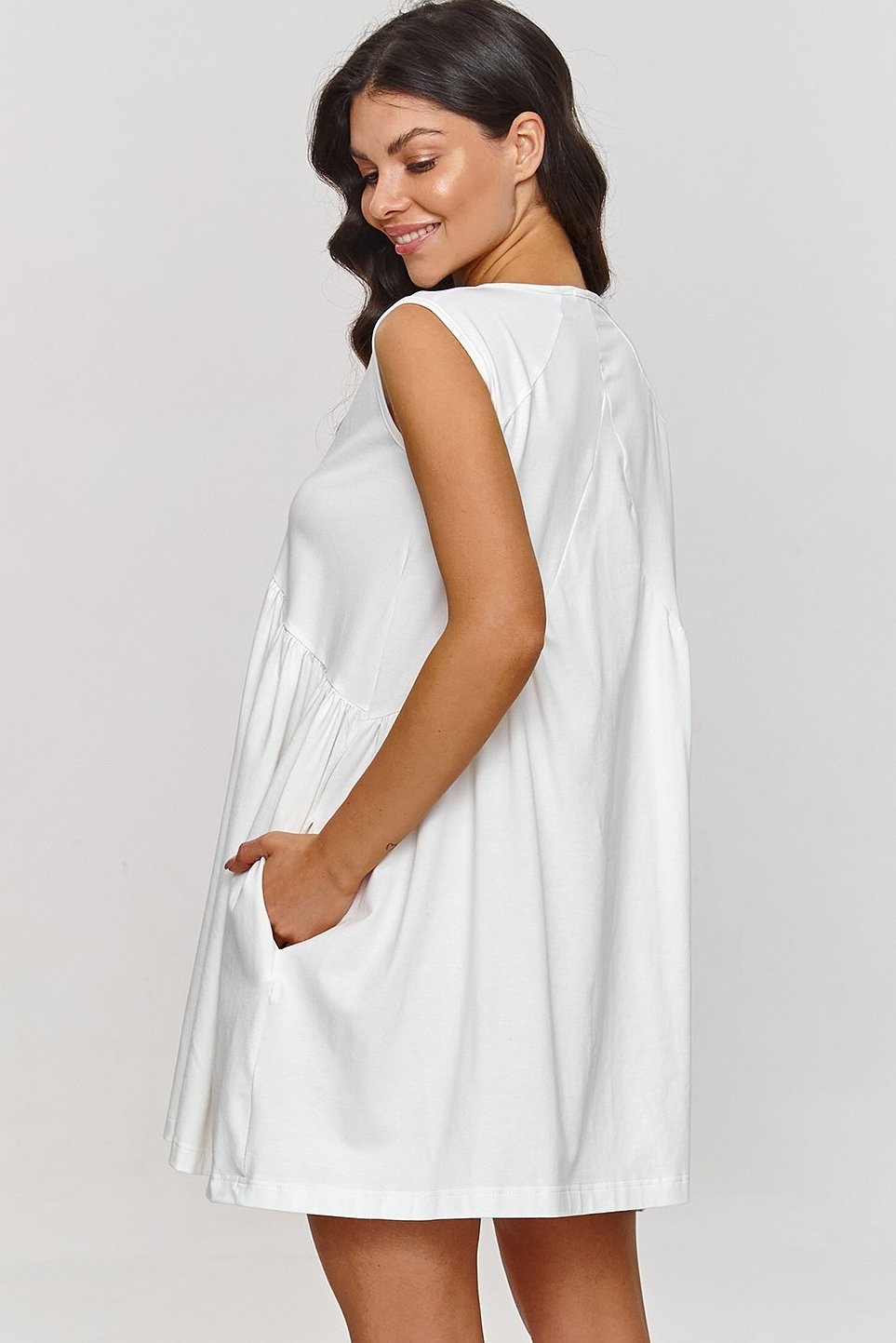 Šaty Makadamia M876 v odstínu ecru jsou dokonalým spojením komfortu a ležérní elegance. Díky volnému, trapezovému střihu poskytují maximální pohodlí a zároveň vytvářejí vyváženou siluetu. Výstřih do „V“ dodává modelu jemný, ženský akcent, zatímco krátká délka působí svěže a mladistvě.
