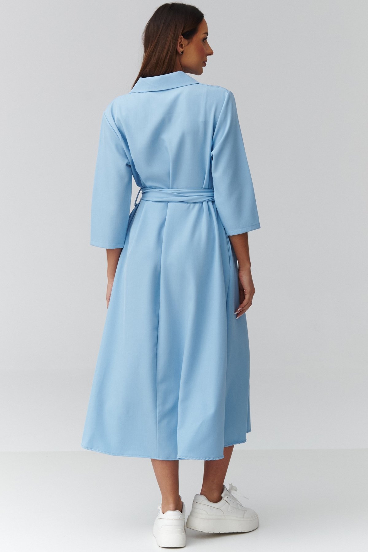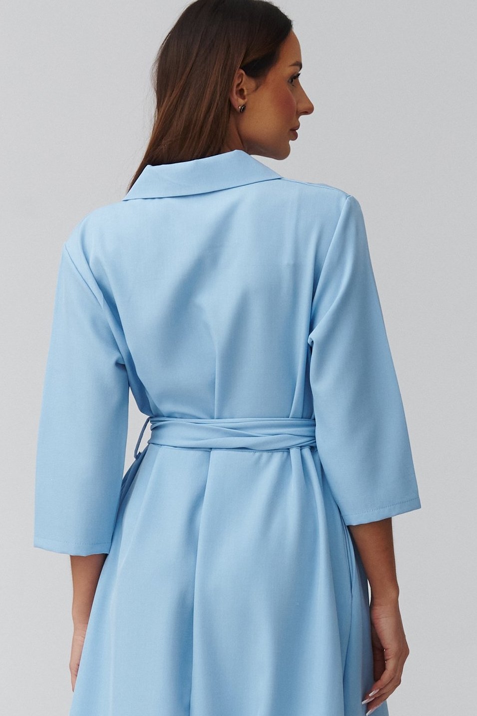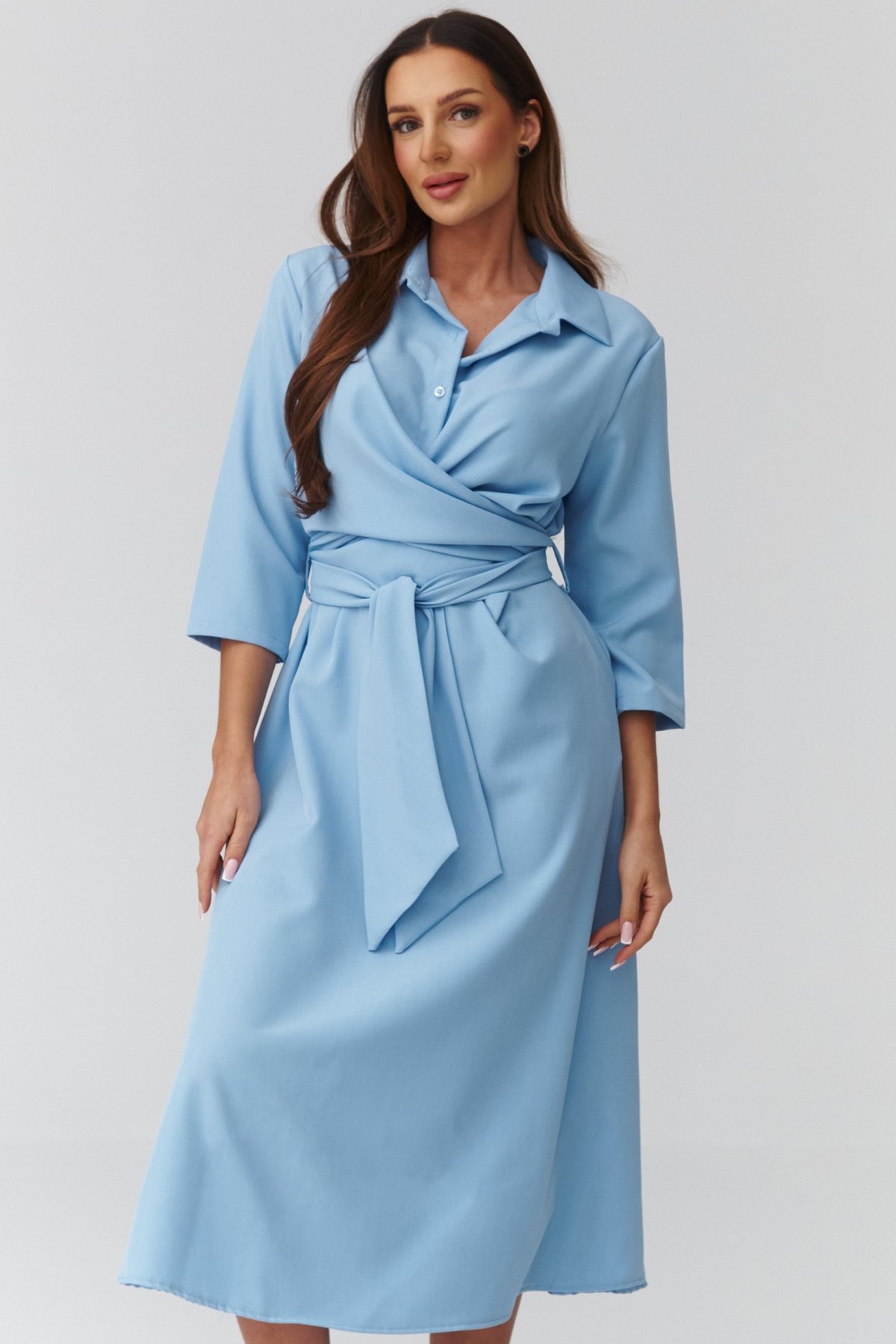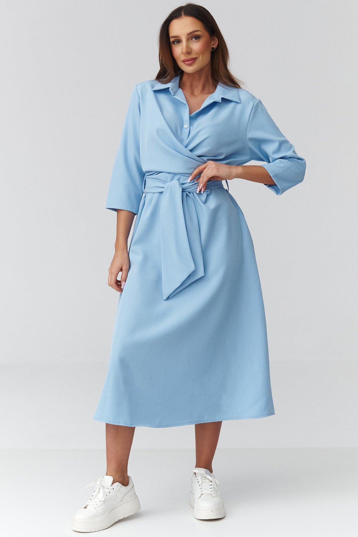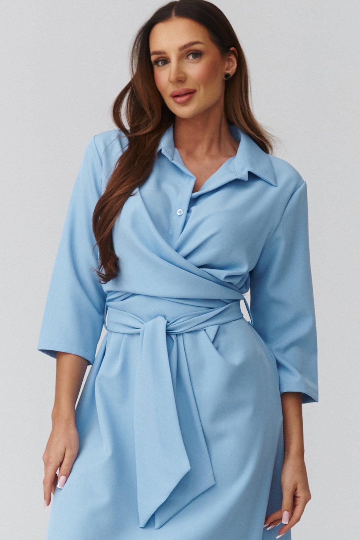 Elegantní zavazovací šaty ve světle modrém odstínu. Spojují ženskou siluetu s každodenním pohodlím.