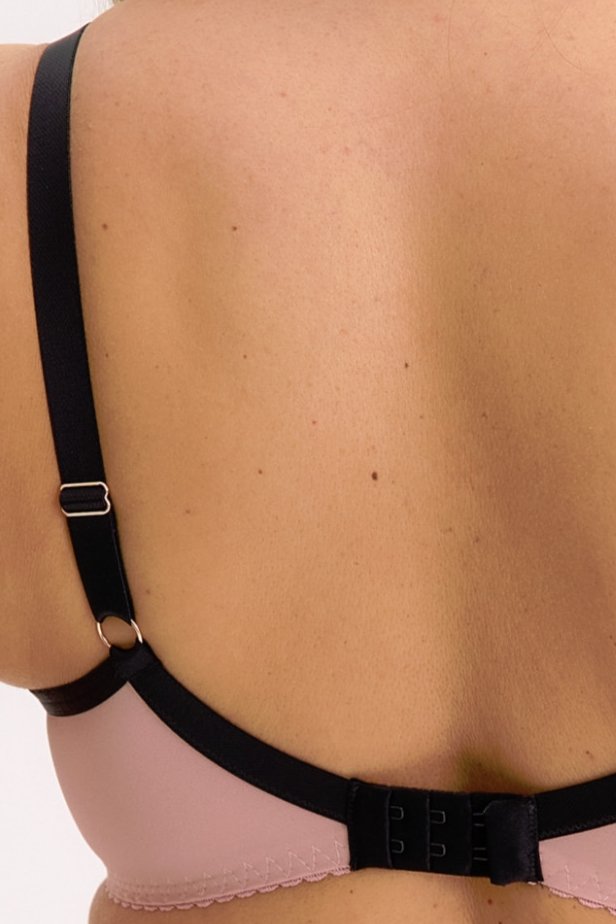 Kombinace černé a jemně růžové barvy působí mimořádně ženským dojmem. Propracovaný střih krásně modeluje poprsí bez nutnosti vyztužení. Měkké košíčky z tylu a krajky se přizpůsobí tvaru prsou, dodávají jim přirozený vzhled. Nízký střed s jemnou ozdobou umožňuje nošení pod hlubší výstřihy, díky čemuž je model ideální jak pro každodenní nošení, tak pro speciální příležitosti. Obvod tvoří hladké mikrovlákno s bočními výztuhami, které zamezí rolování se materiálu. Ramínka jsou snadno nastavitelná, neodnímatelná.