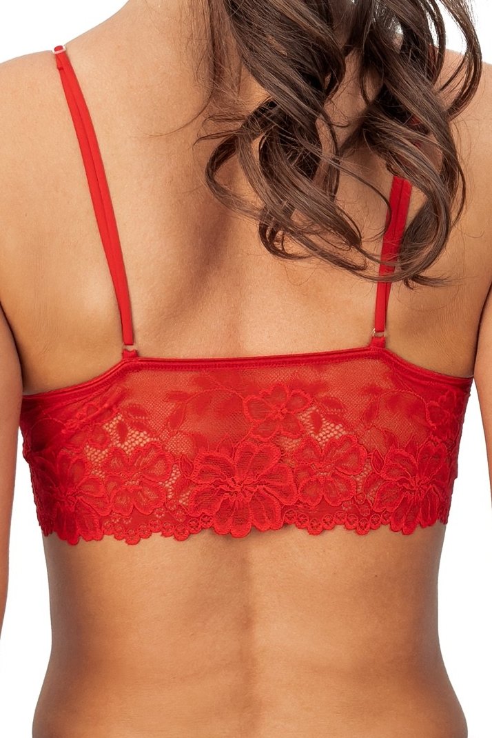 Měkké krajkové košíčky přirozeně obepínají poprsí, zatímco pružná guma pod prsy poskytuje lehkou, příjemnou oporu bez nepříjemného tlaku. Dekolt zdobí dekorativní pásky, které jemně zvýrazňují ženské křivky a dodávají modelu smyslný charakter. Nastavitelná ramínka umožňují přesné přizpůsobení postavě. Zadní část je také celá z krajky bez zapínání.