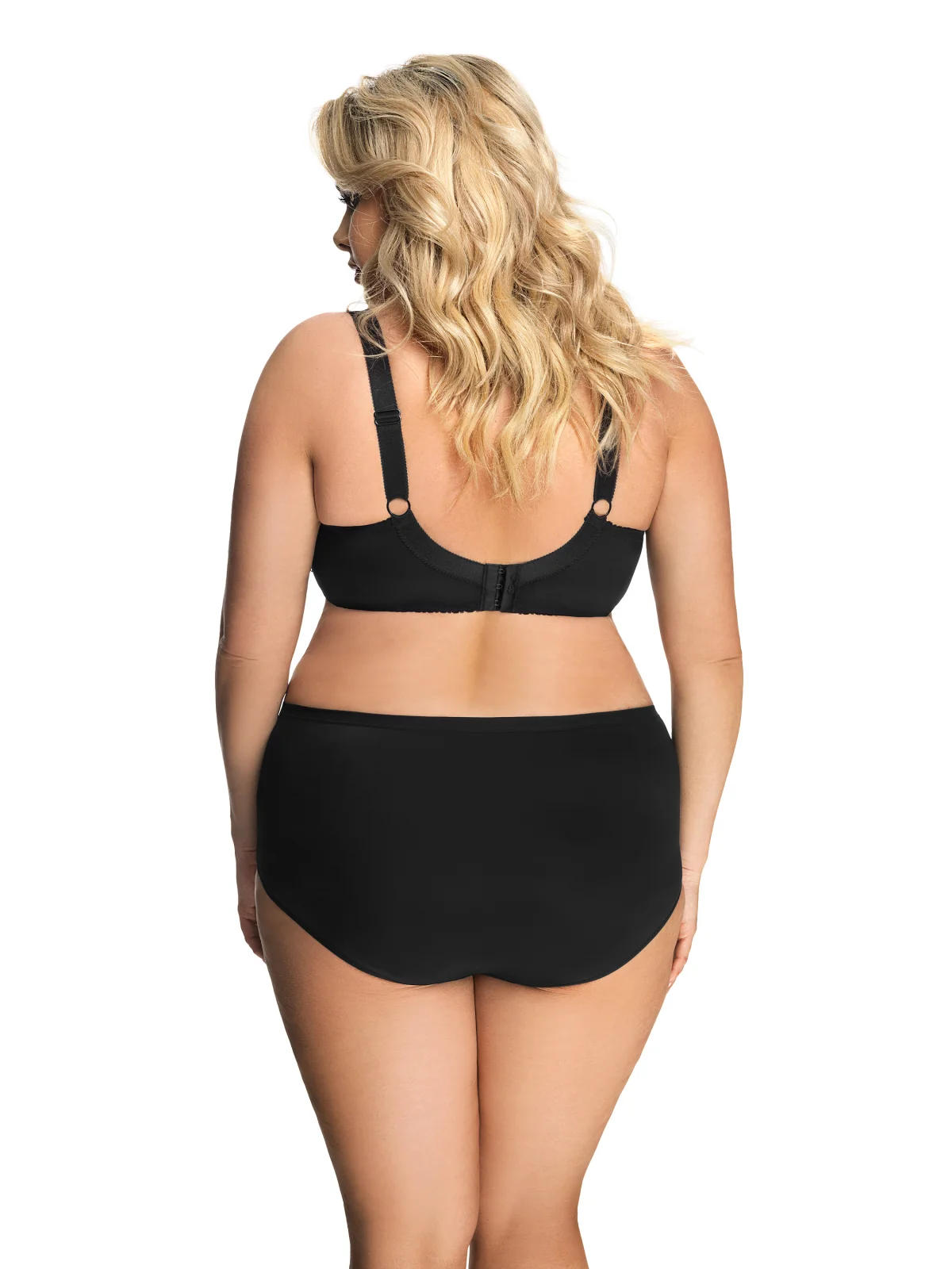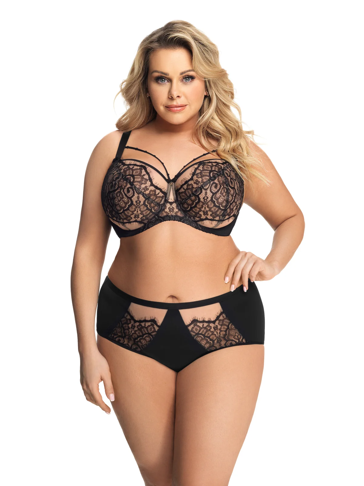 Elegance schovávající se pod černým hábitem. Dvouvrstvé košíčky, tyl spojený s krajkou, vlastnosti, které dodávají modelu na lehkosti a romantice. Košíčky zdobí mistrovská výšivka. Vrchní linii košíčků navíc doplňují elastické proužky. U dekoltu jsou také stylové pruhy, které navíc zdobí malé ozdoby. Obvod je z pevné lycry. Dobře drží a poskytuje stabilitu. Kostice lemují poprsí, poskytují mu oporu a krásný tvar. Ramínka jsou hladká, dají se snadno regulovat. Navíc se jejich šířka vždy přizpůsobí konkrétní velikosti podprsenky. Zapínání obvodu je řešeno klasickými háčky.