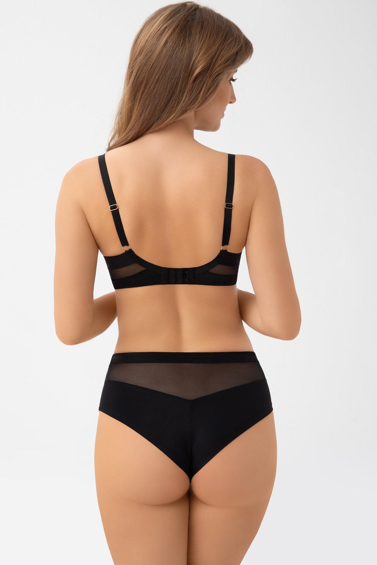 Třídílné hladké košíčky z materiálu simplex v kombinaci s tylem pevně drží tvar a pomáhají prsa nadzvednout i opticky stáhnout více ke středu. Konstrukce zajišťuje plný, kulatý tvar a stabilitu během celého dne. Zadní část je z pružné lykry, dobře přiléhá k tělu. Boční výztuhy zabraňují rolování materiálu. Odnímatelné ozdobné pásky a kovové prvky ve světlém zlatém tónu dodávají modelu elegantní detail. Ramínka jsou nastavitelná, neodnímatelná. Obvod zapnete pomocí klasických háčků.