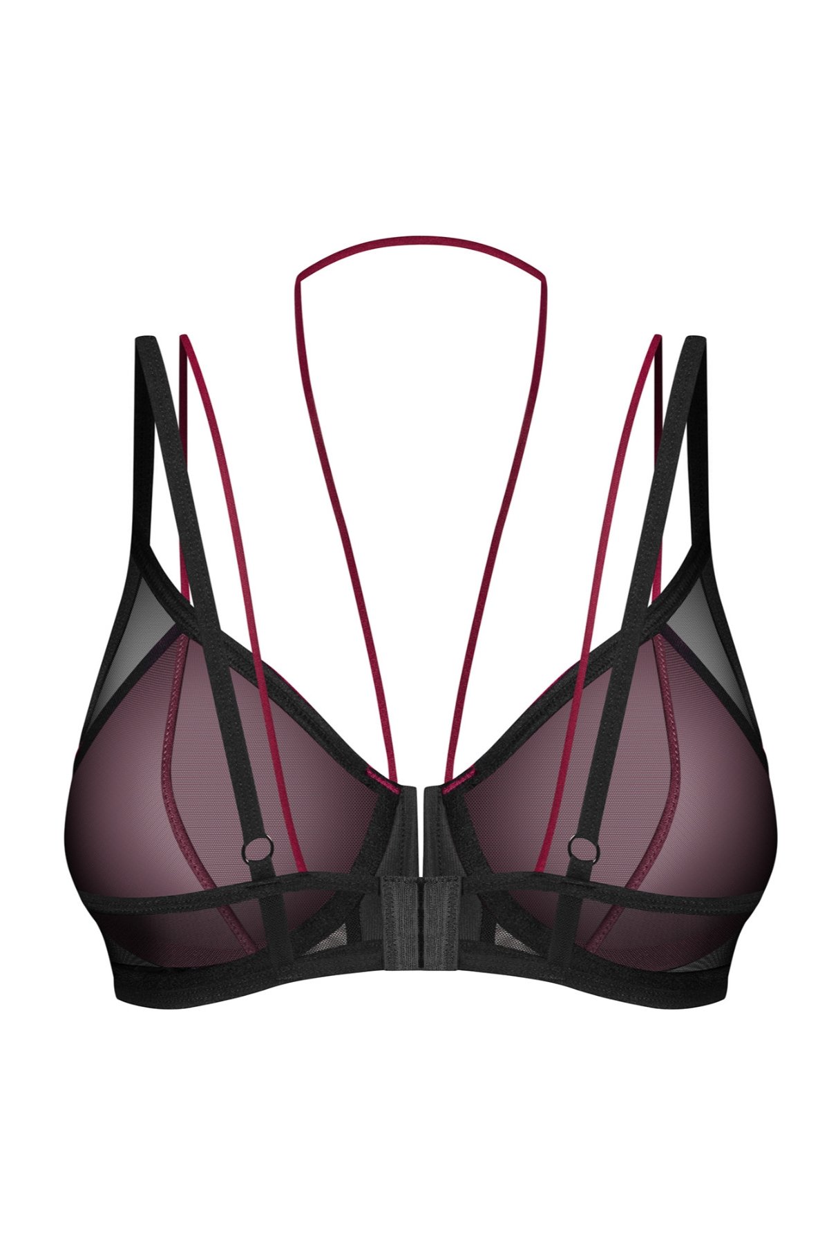 Transparentní elastická tkanina v černo-bordó kombinaci Měkké košíčky s dvojitými ramínky pro jemné tvarování prsou…