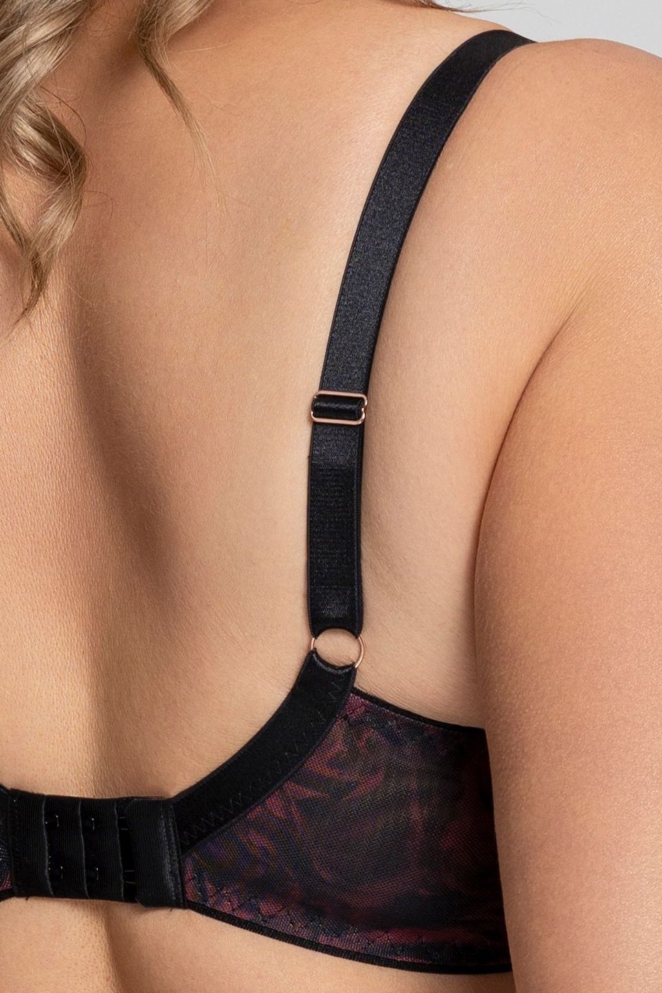 Měkká podprsenka Rosa spojuje romantický vzhled s jistotou opory. Jemná síťovina s vínovým motivem růží působí elegantně a zvýrazňuje přirozený tvar poprsí. Košíčky bez výztuže doplňují pevné kostice, které udržují prsa ve správné pozici. Dekolt zdobí tenké pásky s nastavitelnou délkou, které vytvářejí moderní, svůdný efekt. Nelze je odepnout. Mezi košíčky je drobná mašlička s kovovým detailem. Zadní část z tylu je lehká a prodyšná, ramínka lze snadno nastavit pro perfektní přizpůsobení. Elegantní podprsenka vhodná pro každodenní nošení i speciální příležitosti.