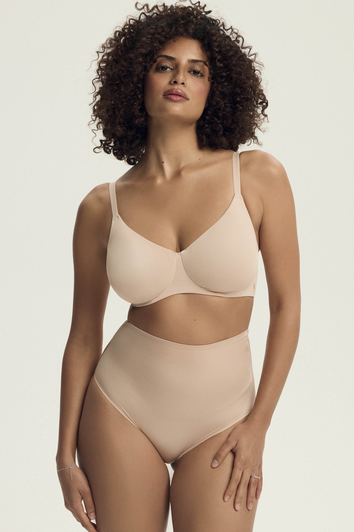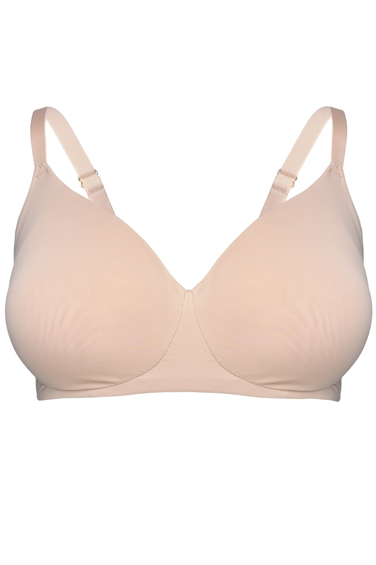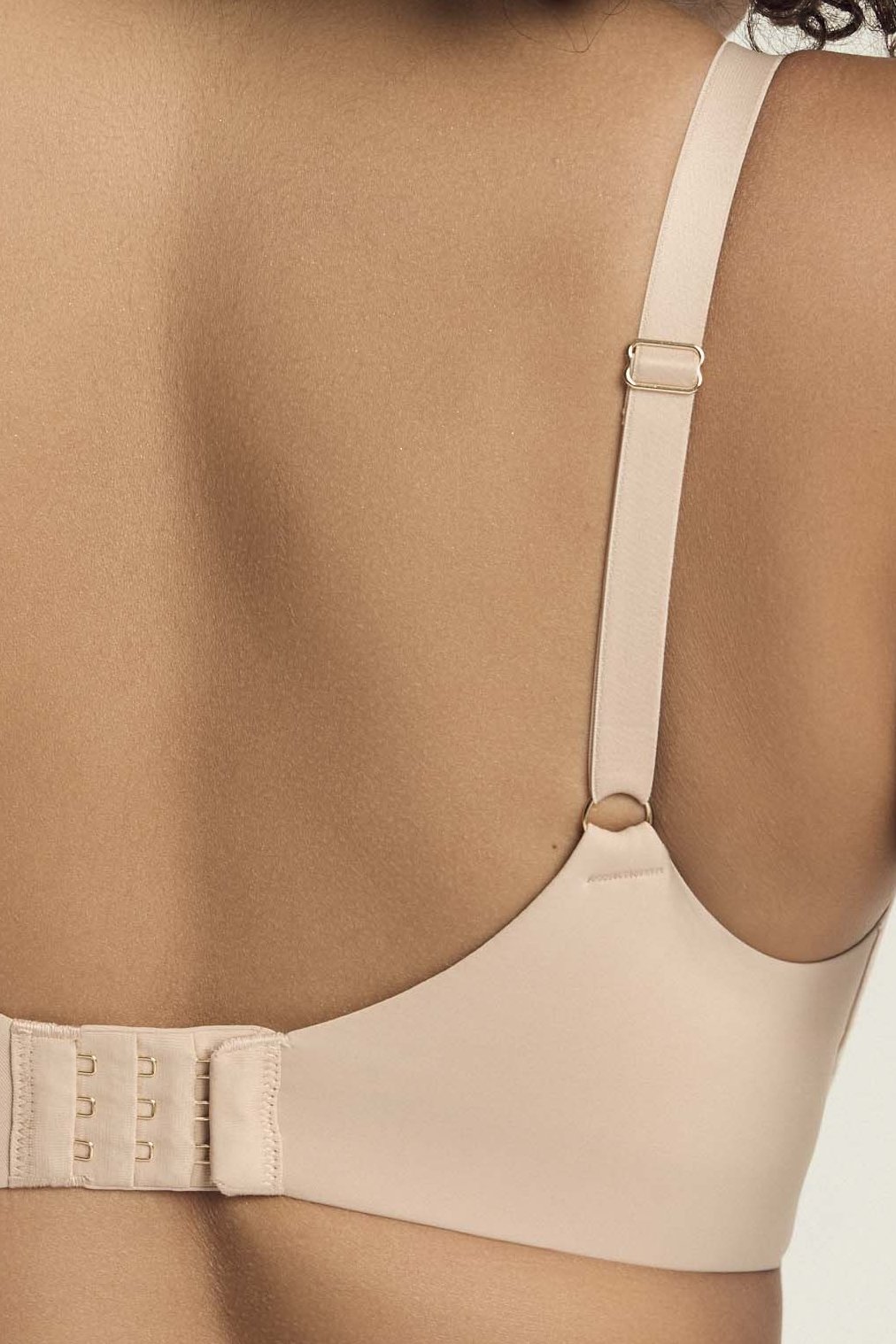 Hladké, formované košíčky bez dodatečných vycpávek přirozeně rozloží objem a opticky zmenší siluetu prsou, aniž by je deformovaly. Pevný střed pomáhá správnému usazení košíčků a drží dekolt stabilní během celého dne. Kostice a širší obvodový pás zajišťují jistotu při nošení, zatímco konstrukce typu t-shirt bra zůstává nenápadná i pod přiléhavým oblečením. Zadní část je vybavena klasickým zapínáním na háčky s možností regulace obvodu. Ramínka jsou nastavitelná, aby bylo možné přizpůsobit podprsenku přesně postavě.