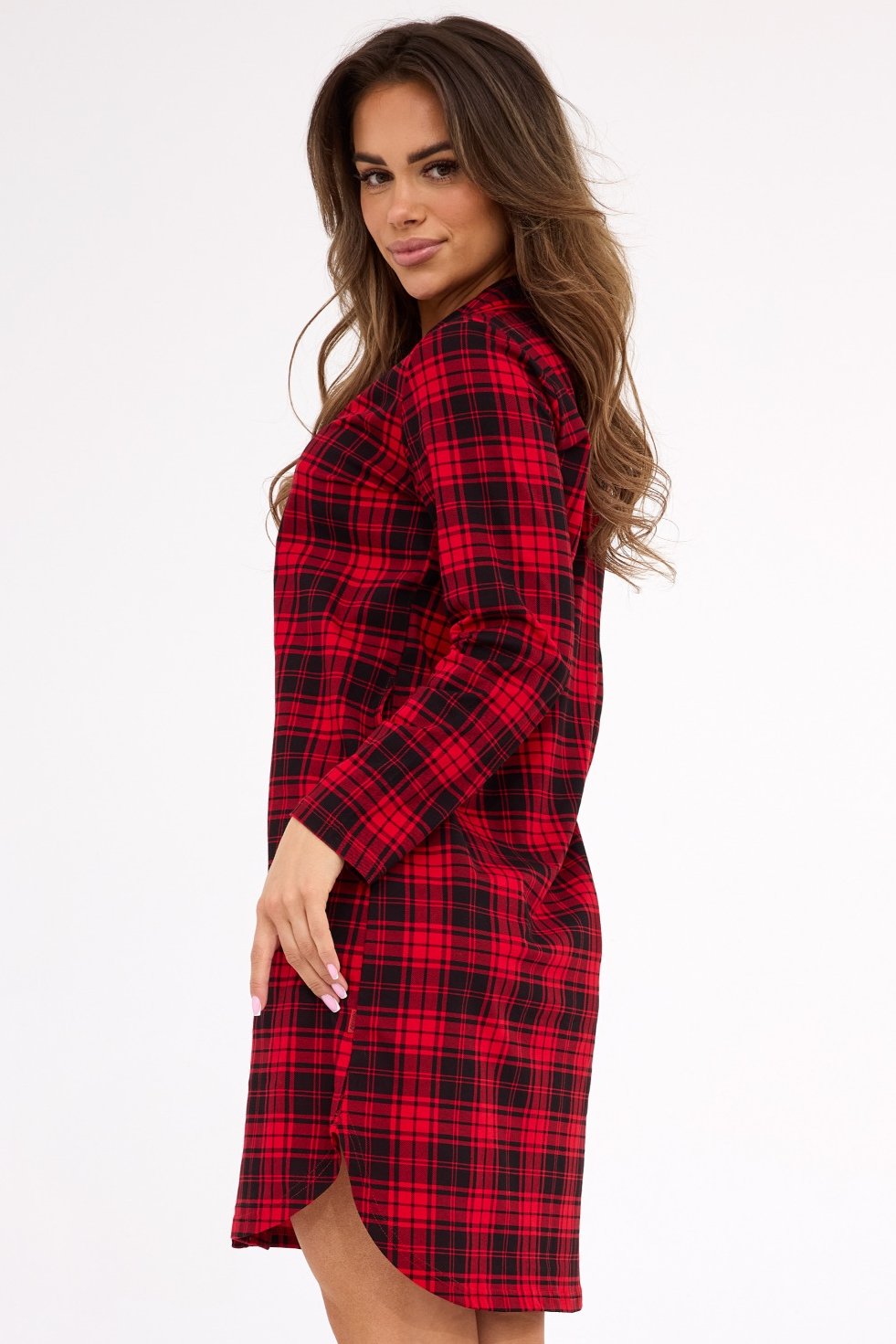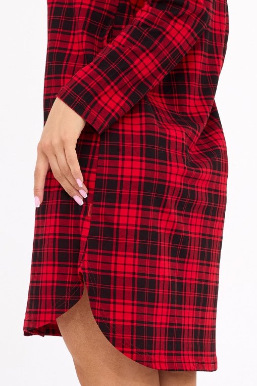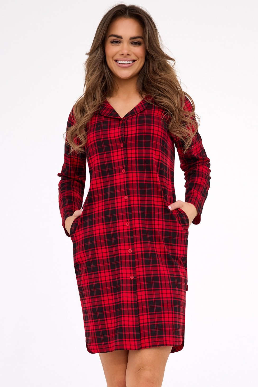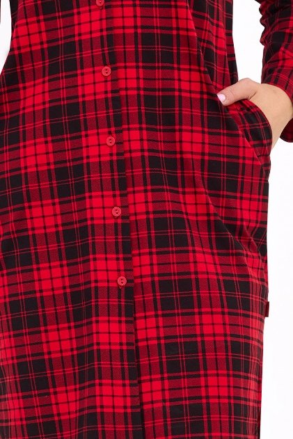 Dámská noční košile v klasickém, nadčasovém stylu. Díky celopropínacímu zapínání na knoflíky a límečku připomíná elegantní košili, ale zároveň zůstává velmi komfortní pro domácí nošení i spánek. Kostkovaný vzor dodává modelu tradiční a stylový vzhled, který nikdy nevyjde z módy. Praktické boční kapsy jsou decentním, ale funkčním detailem. Délka košile zasahuje nepatrně nad kolena.