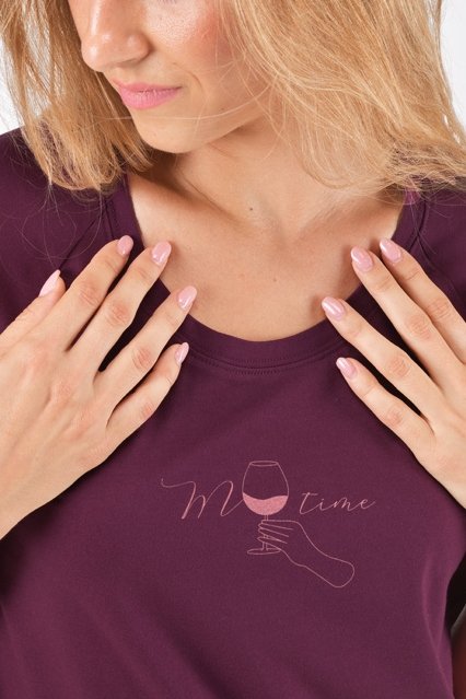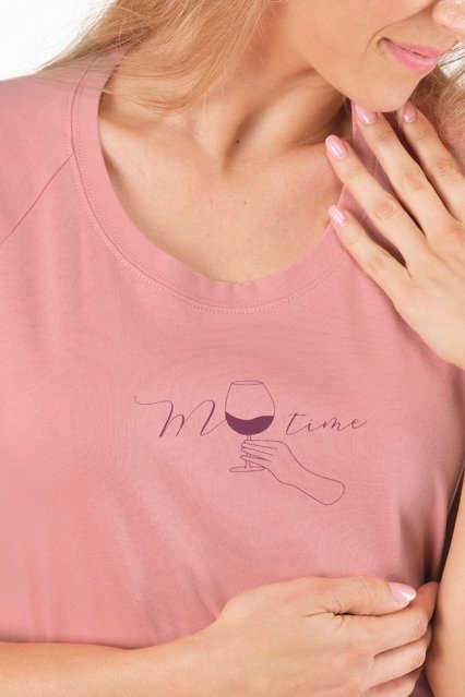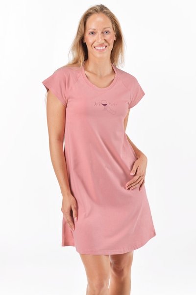 Tato dámská noční košile spojuje jednoduchost, pohodlí a ženský půvab. Vyrobená ze 100% bavlny, nabízí dokonalou prodyšnost a měkkost, kterou oceníte při každém doteku. Lehce rozšířený střih zajišťuje volnost pohybu, zatímco krátké rukávy a délka nad kolena vytvářejí ideální kombinaci pro pohodlný spánek i lenošení doma. Kulatý výstřih je příjemný a neomezuje, takže se budete cítit naprosto uvolněně. Decentní potisk na hrudi podtrhuje ženskost tohoto modelu a dodává mu jemný, elegantní vzhled.