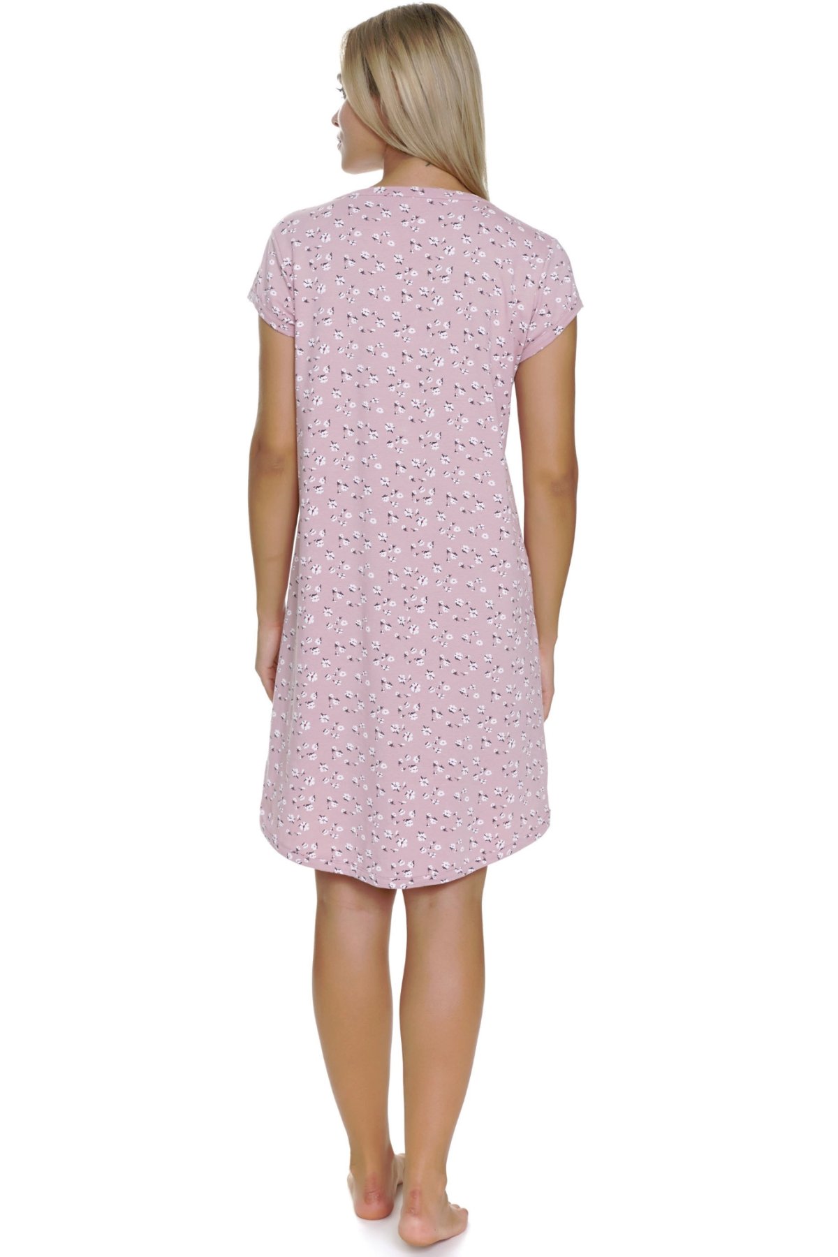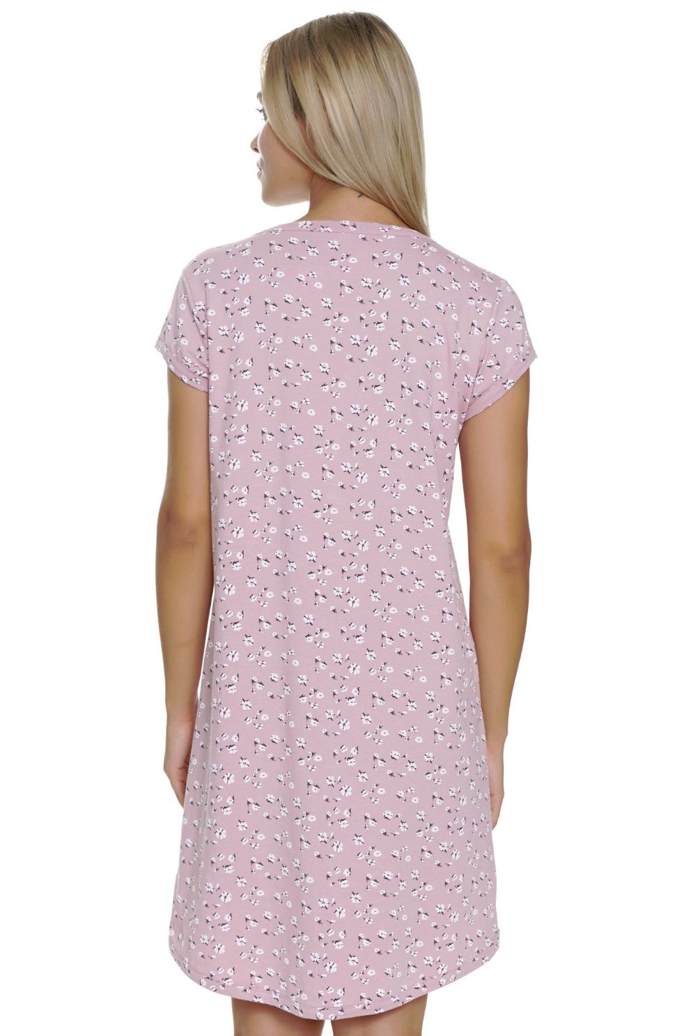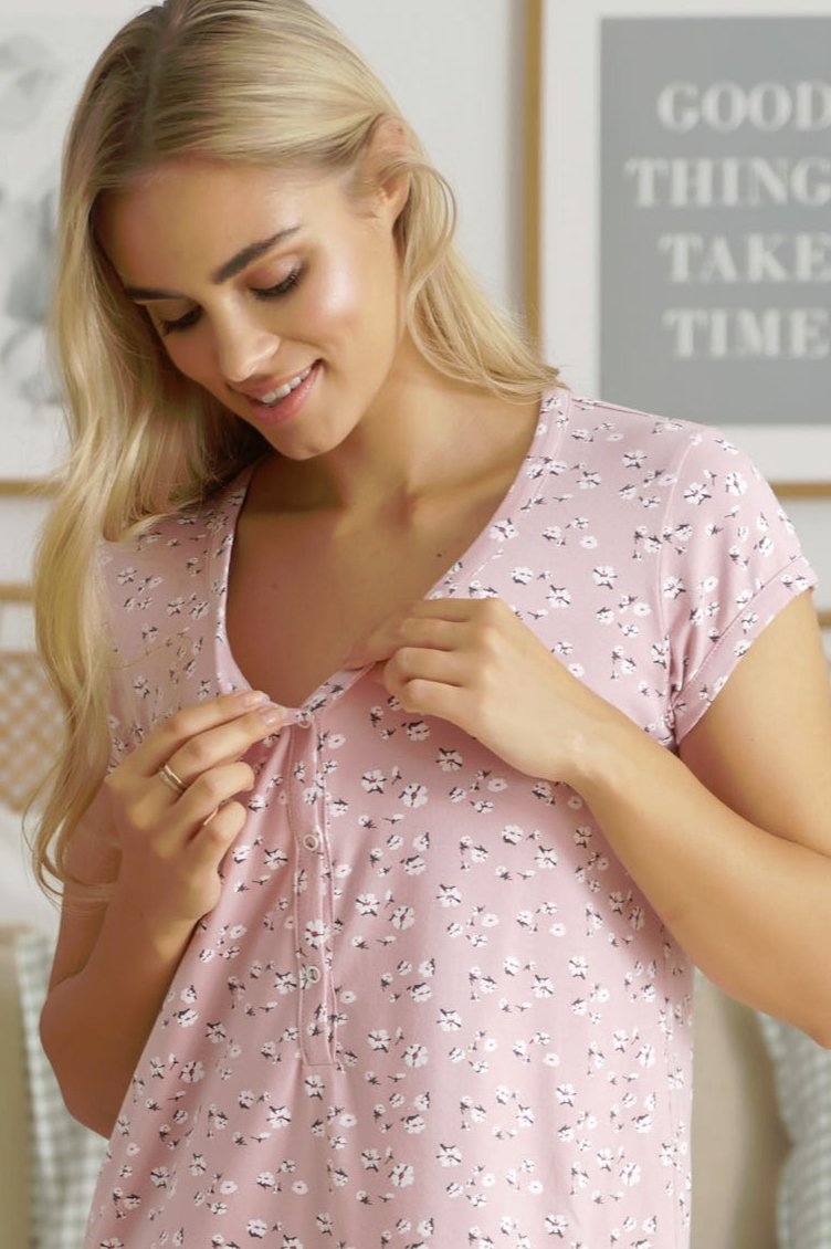 Něžná noční košile s drobným květinovým vzorem. Univerzální kousek, který si zamiluje každá žena. Díky volnému střihu a pružné bavlně s příměsí elastanu se krásně přizpůsobí postavě a poskytne maximální pohodlí během spánku i domácího odpočinku. Praktické zapínání na patentky usnadňuje oblékání a činí z košile ideální volbu i pro období těhotenství a kojení. Rukávy jsou krátké, dekolt kopíruje tvar písmene V.