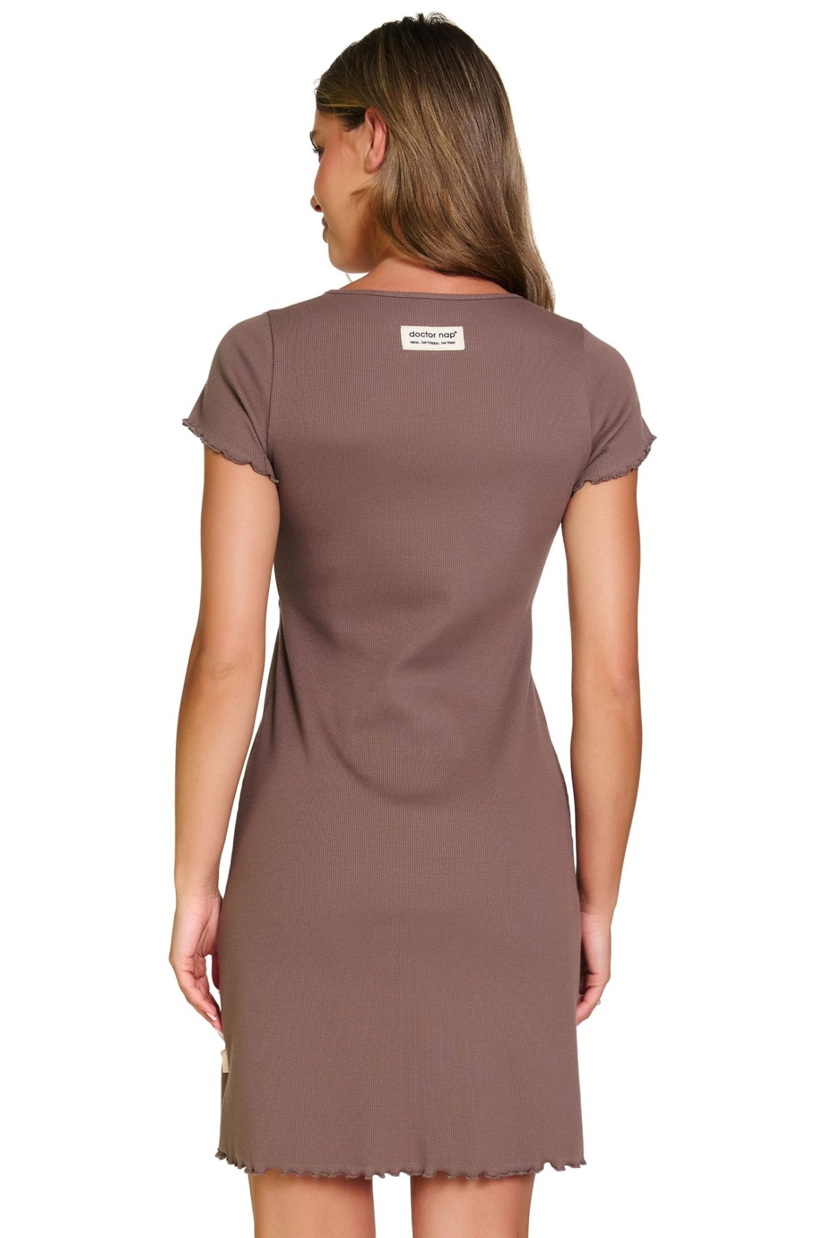 Dámská noční košile s obálkovým výstřihem je dokonalou kombinací ženského stylu, komfortu a praktičnosti. Měkký žebrovaný úplet je mimořádně příjemný na dotek. Díky elastickému průstřihu pod prsy krásně padne jak budoucím maminkám, tak ženám po porodu i všem, kdo hledají pohodlný homewear s jemným nádechem elegance. Praktický zavinovací výstřih umožňuje snadné kojení a zároveň decentně zvýrazňuje dekolt. Romantický vzhled podtrhují drobné volánky na rukávech a spodním okraji. Tento univerzální model je ideální na spaní, relaxaci i domácí nošení – přirozeně ženský, vzdušný a funkční.